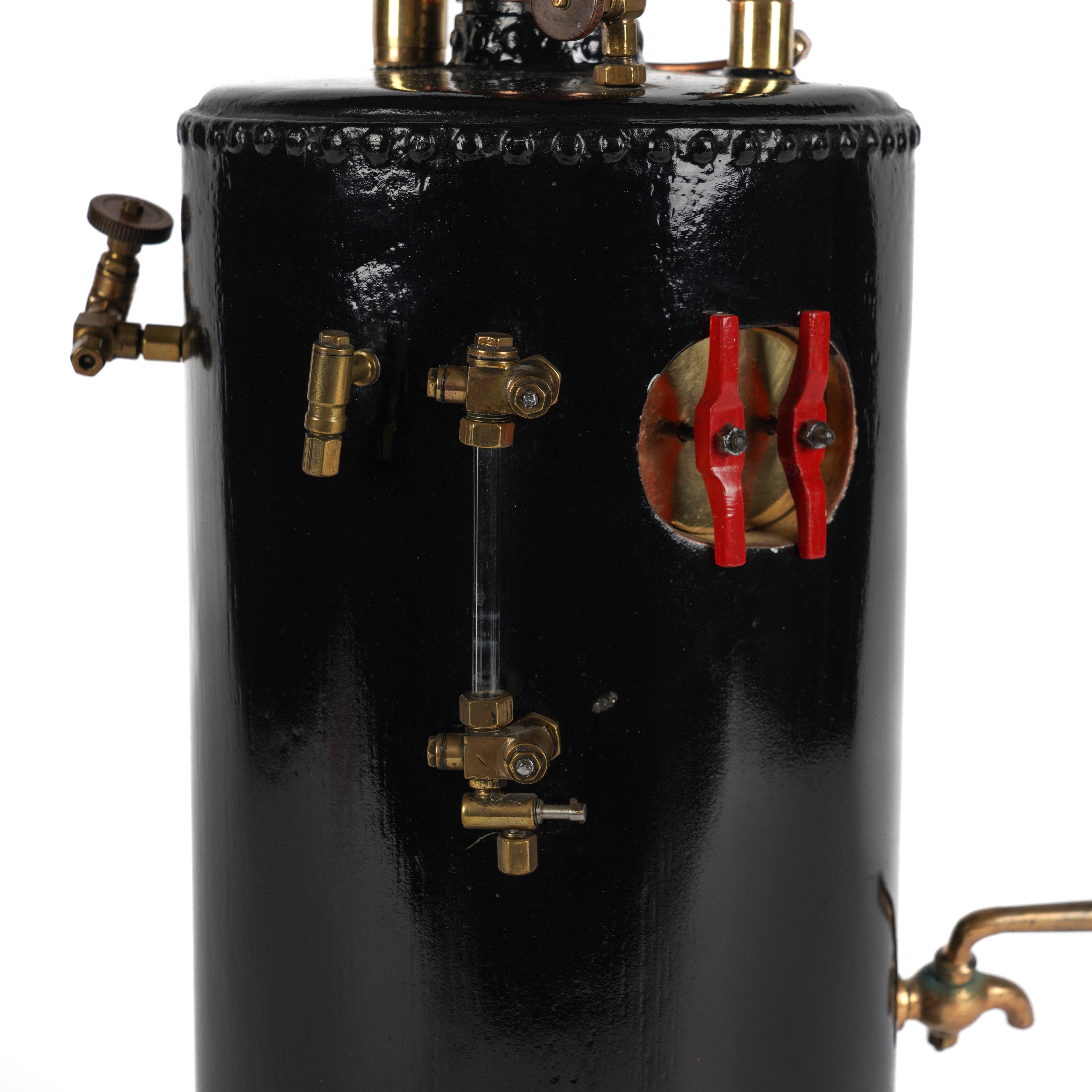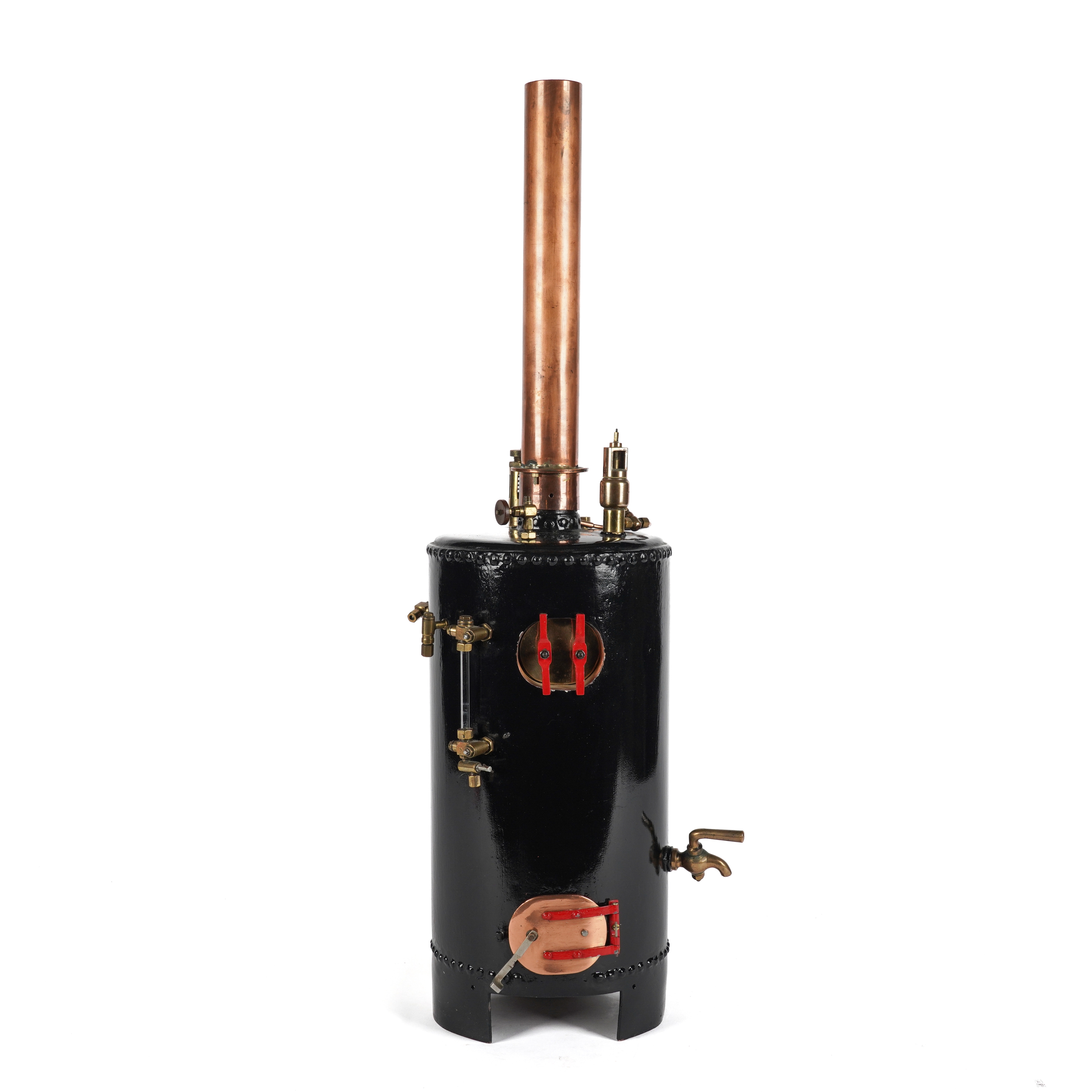 20th Century The black painted body with rivetted seams, red painted detailing and a copper chimney, 69cm high