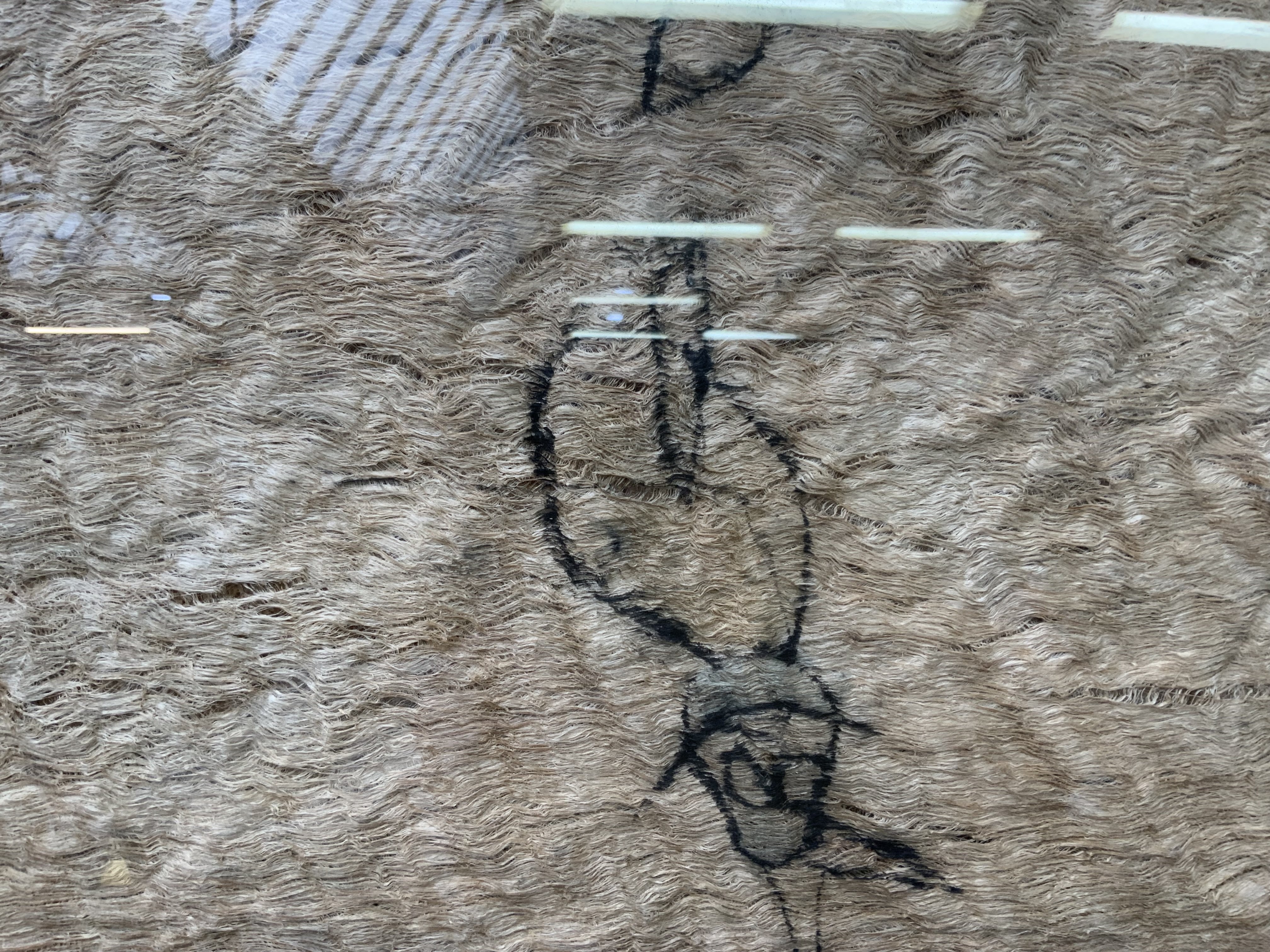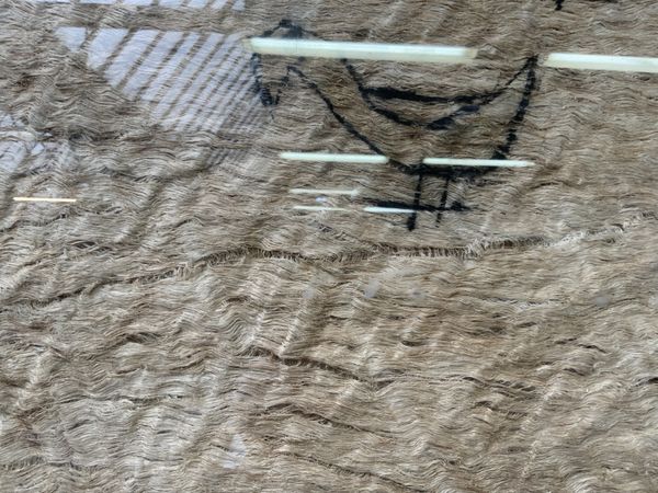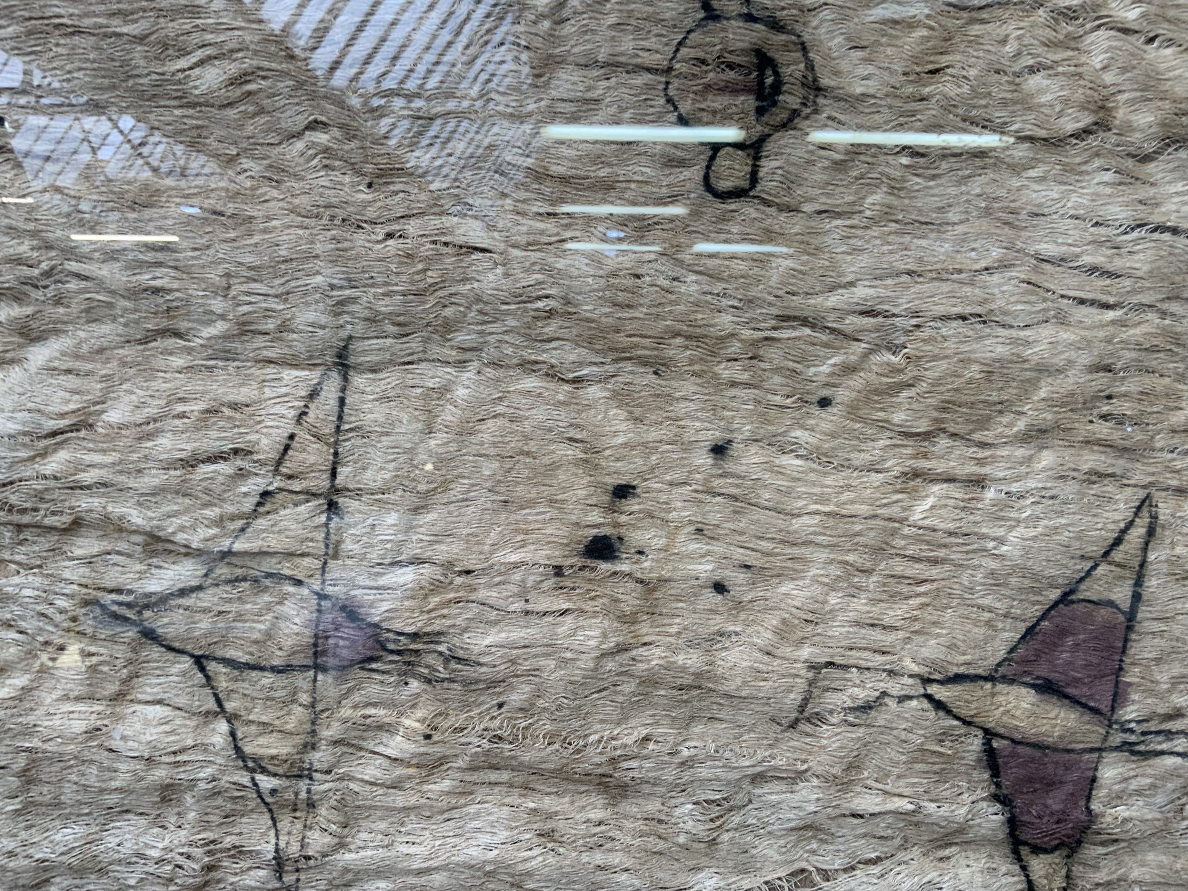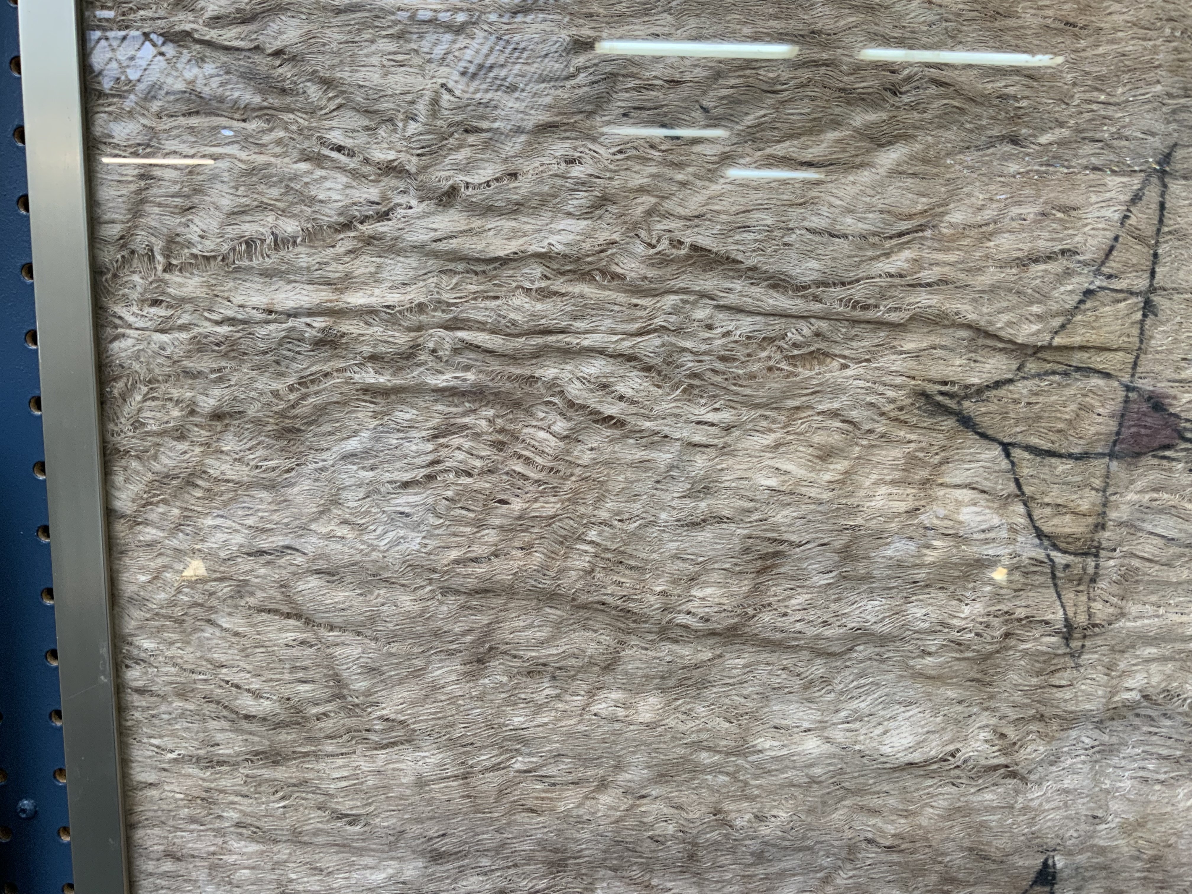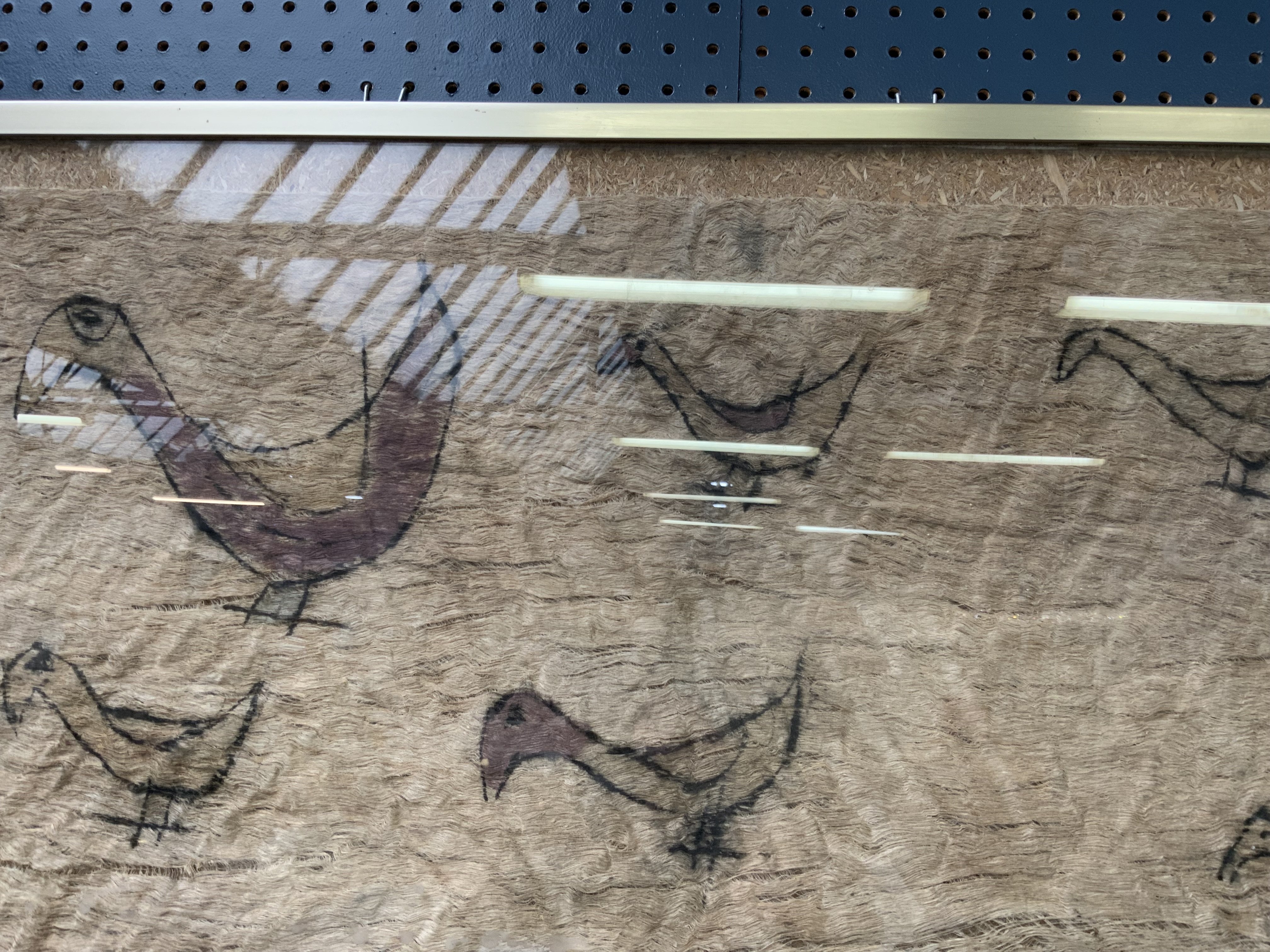 It is believed that the material used is a fibrous bark, and the there is variation in its consistency with thinner patches and areas where the material is a little less dense. There are some pigment bothers and other possible smudges.