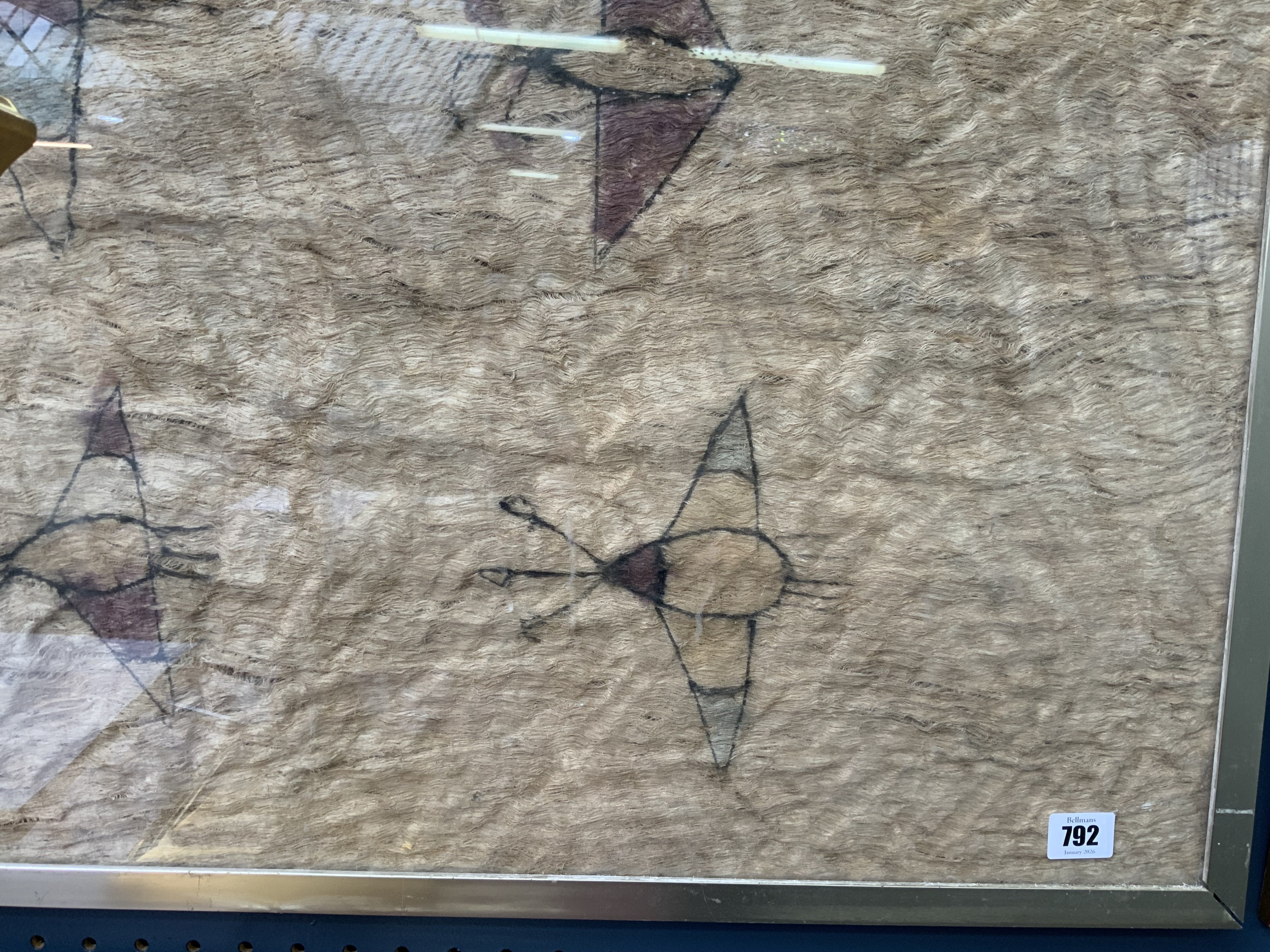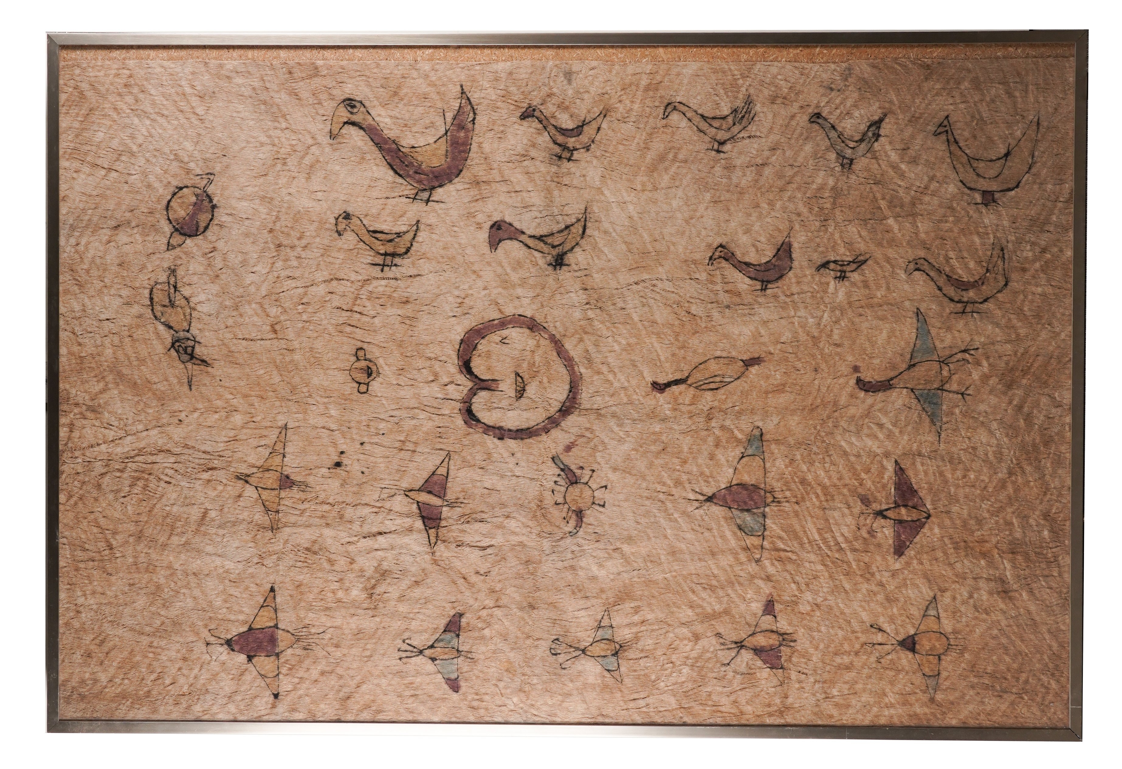 This lot shows a specific arrangement of pictorial symbols which could be read as a ‘Winter Count’. These are associated with the Native Americans of North America, specifically the Blackfeet, Mandan, Kiowa, Lakota, and other Plains tribes, who recorded special events representing the years. There is some similarity to the example offered here, which predominately depicts a variety of birds intermingled with other symbols, possibly representative of the sun and moon.