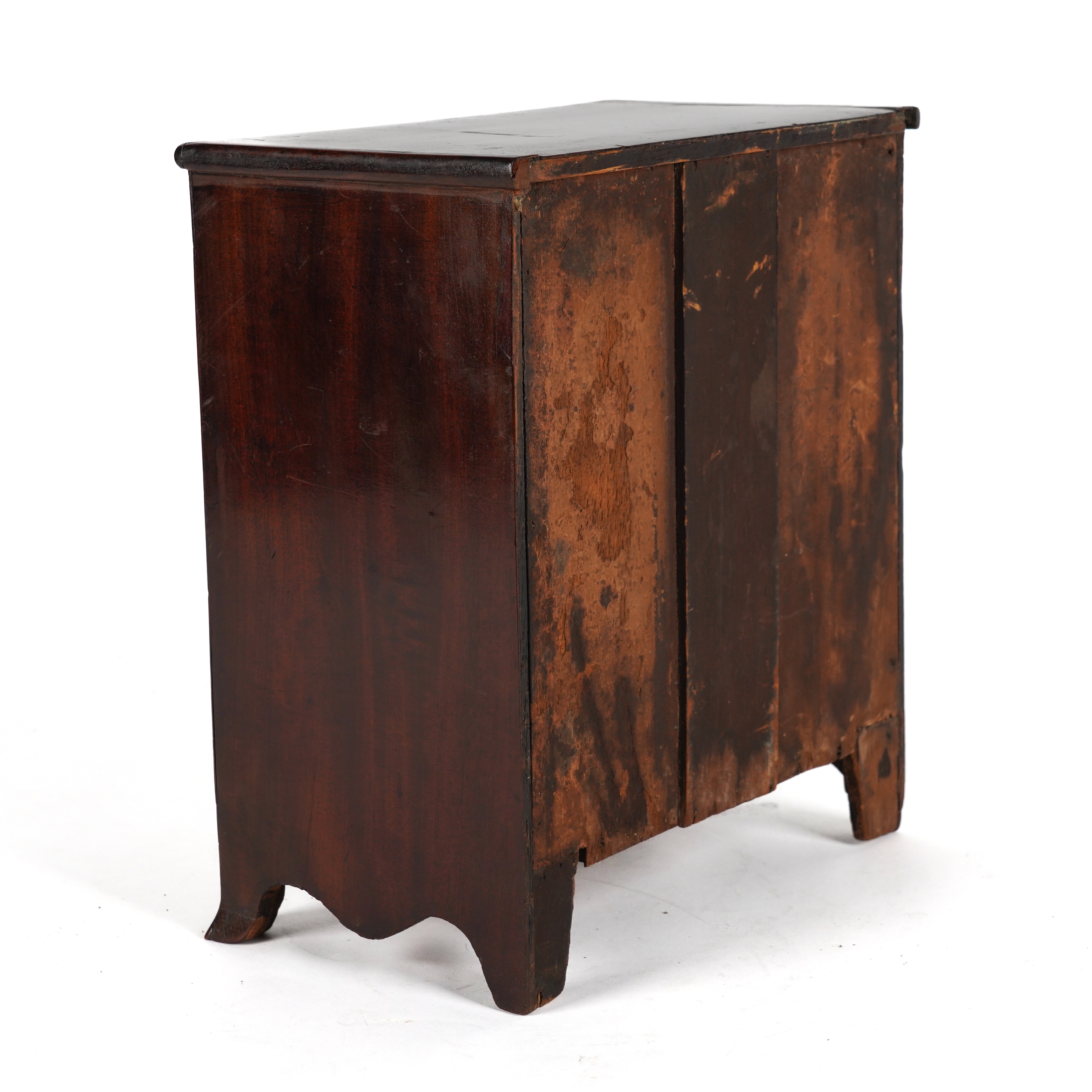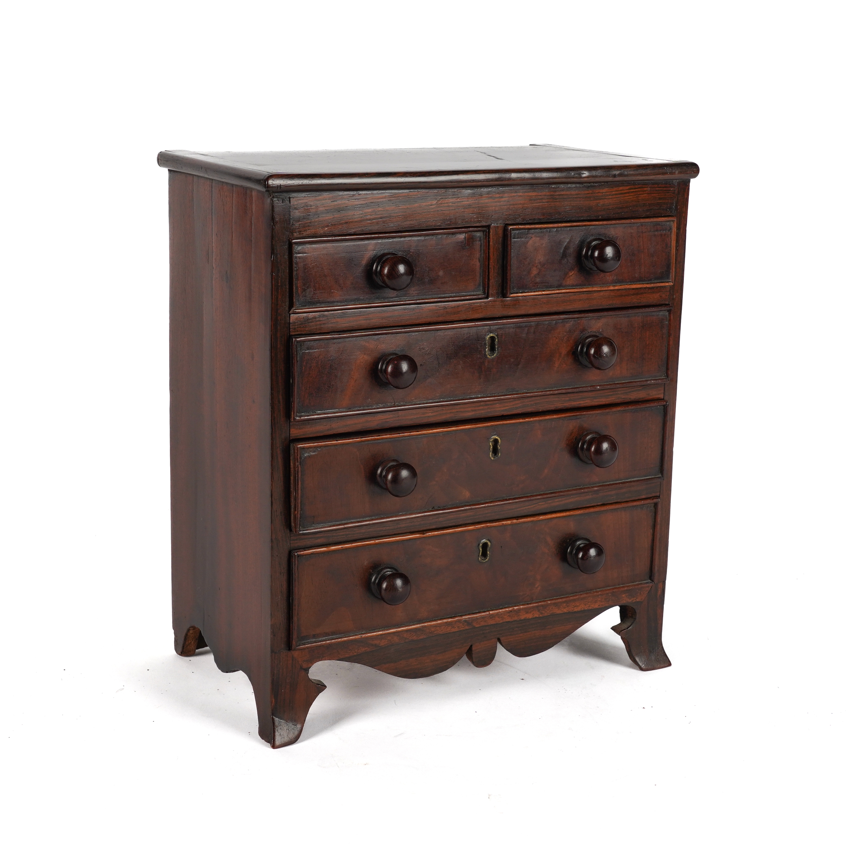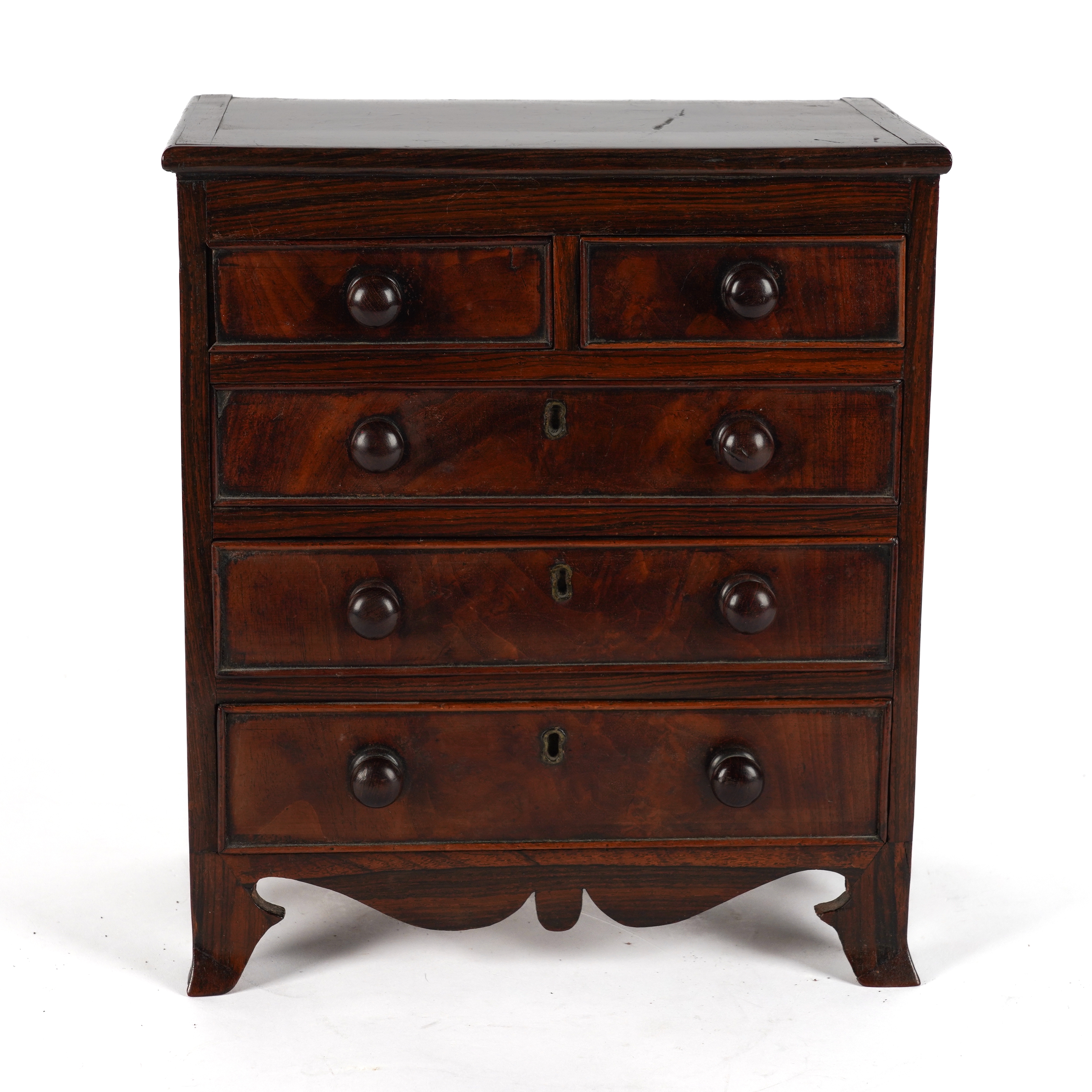 AN APPRENTICE PIECE: A MINIATURE MAHOGANY AND ROSEWOOD CHEST OF DRAWERS