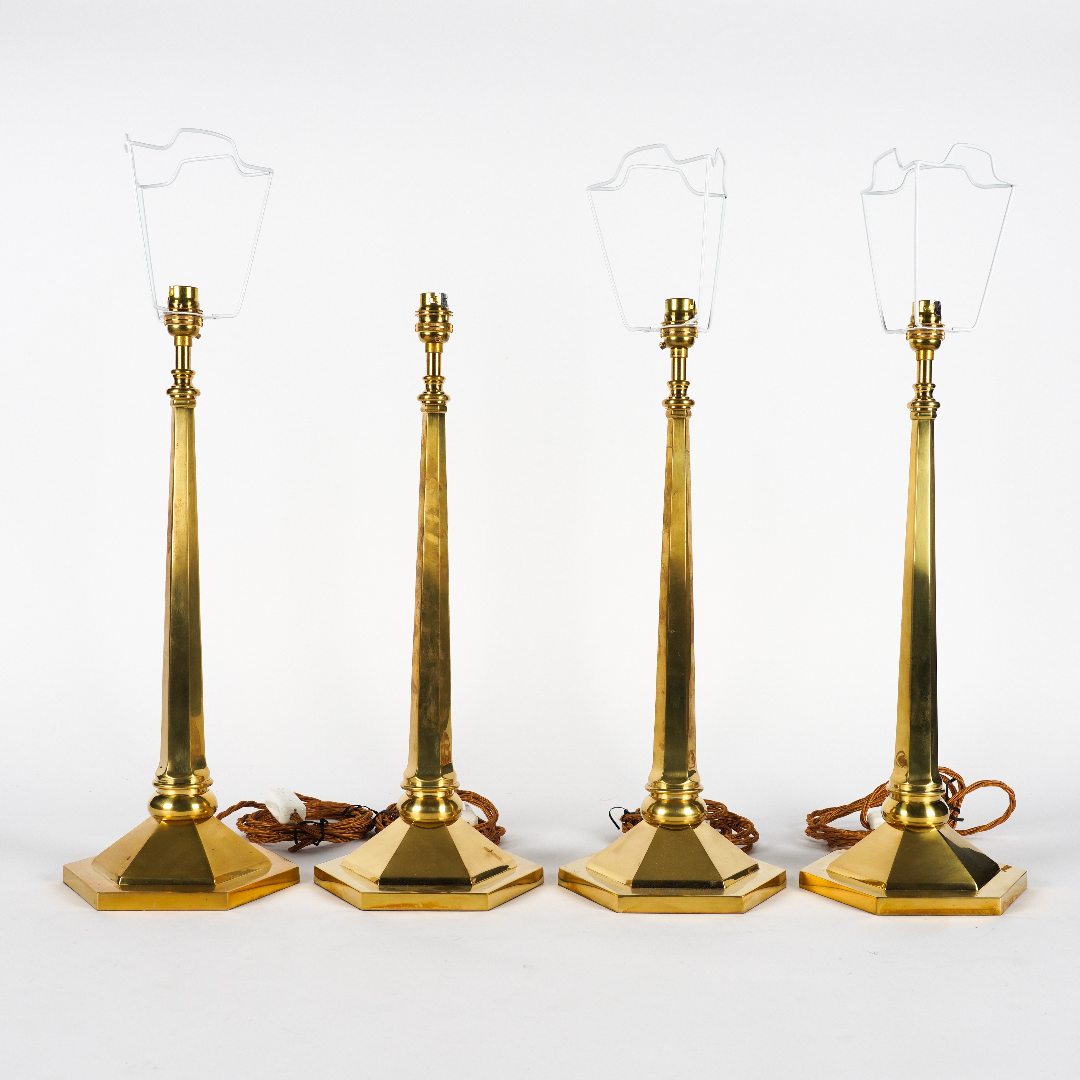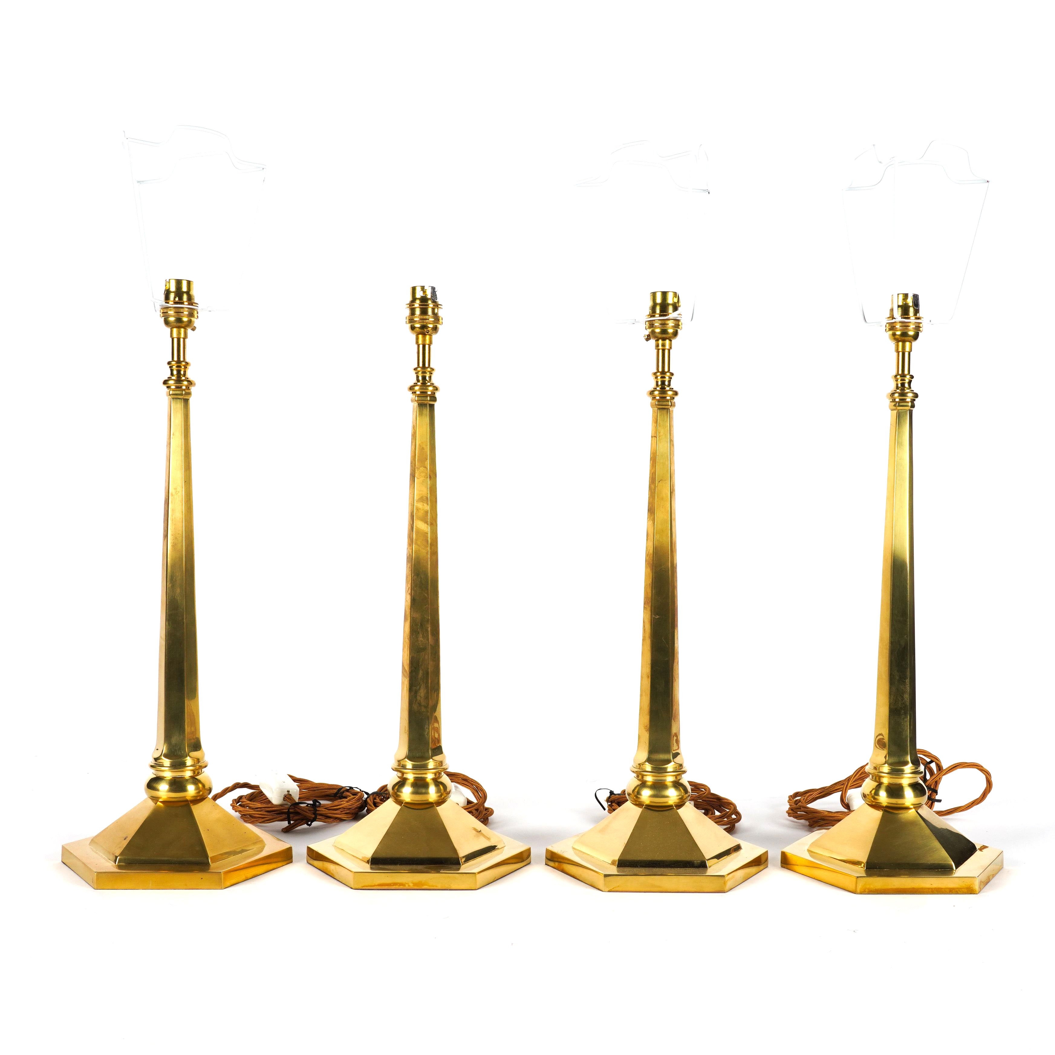 VAUGHAN DESIGNS: A SET OF FOUR POLISHED LACQUERED BRASS HEXAGONAL ‘CALSHOT’ TABLE LAMPS (4)