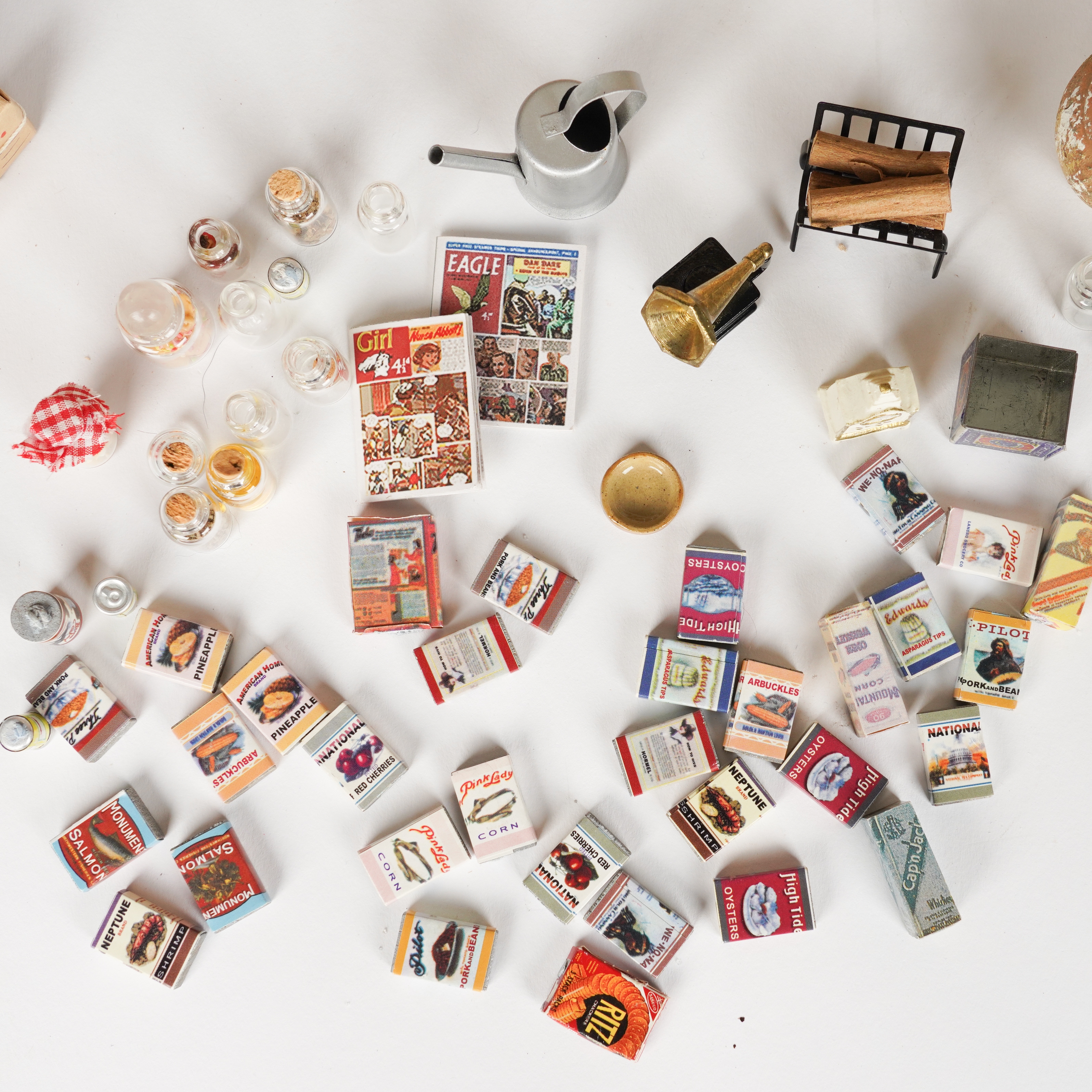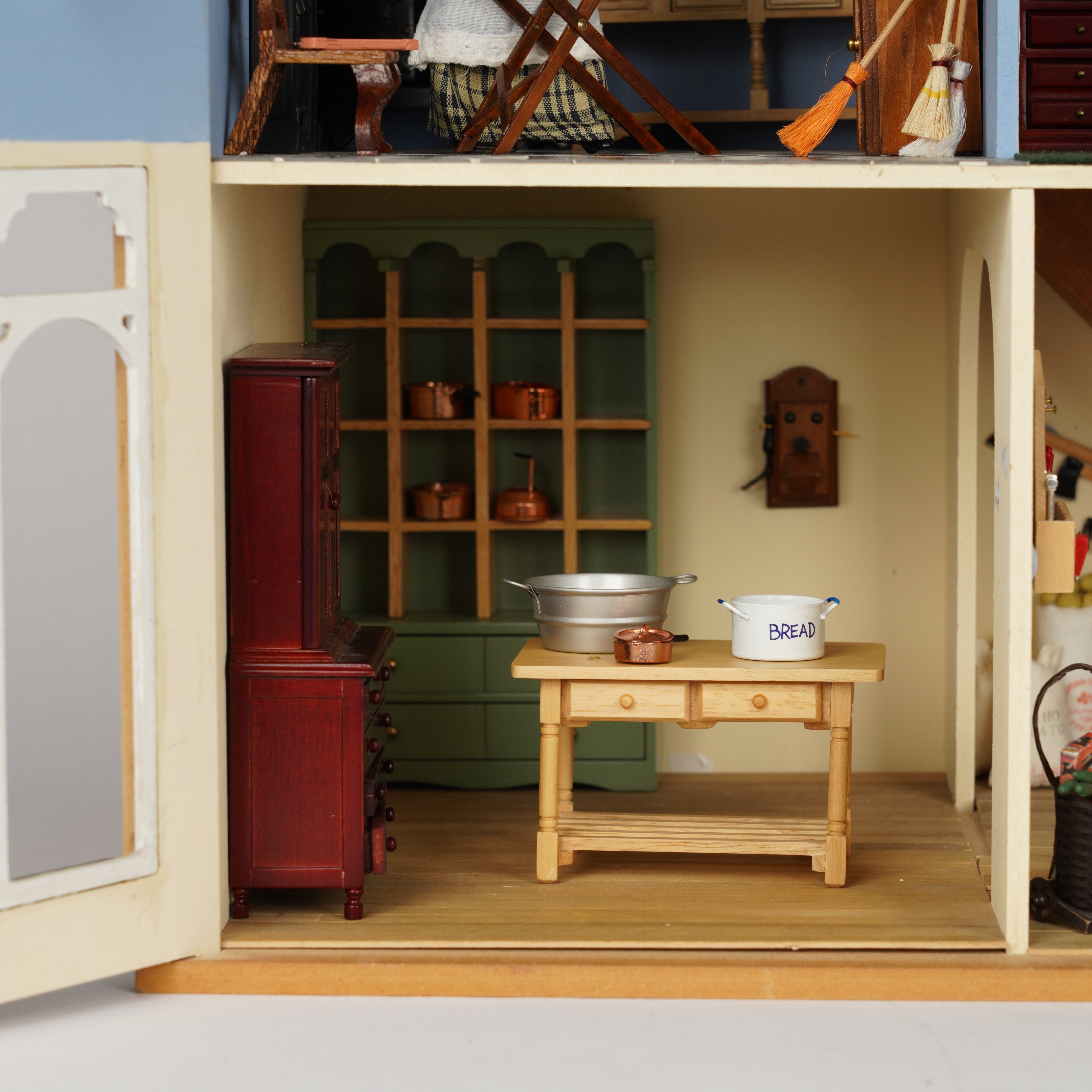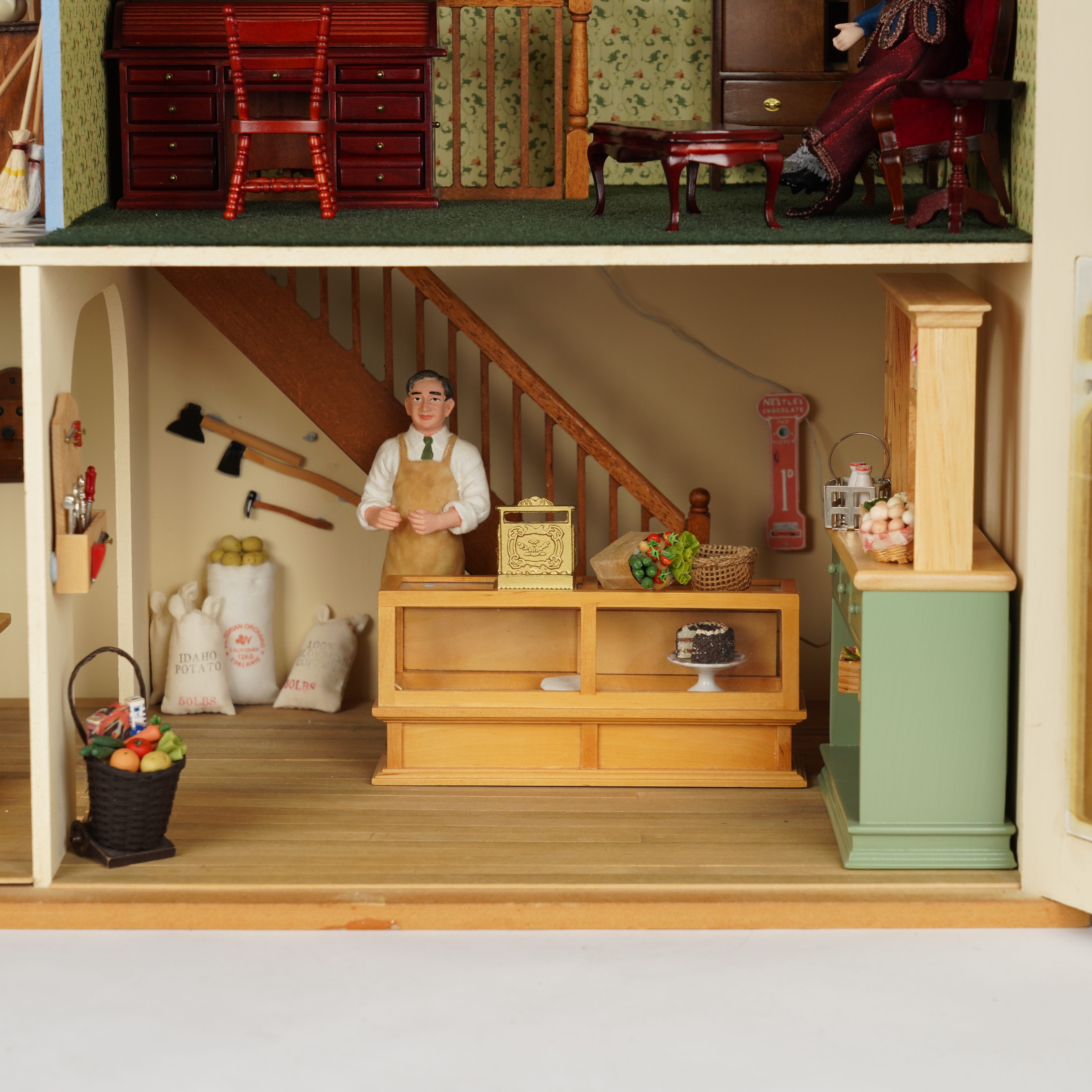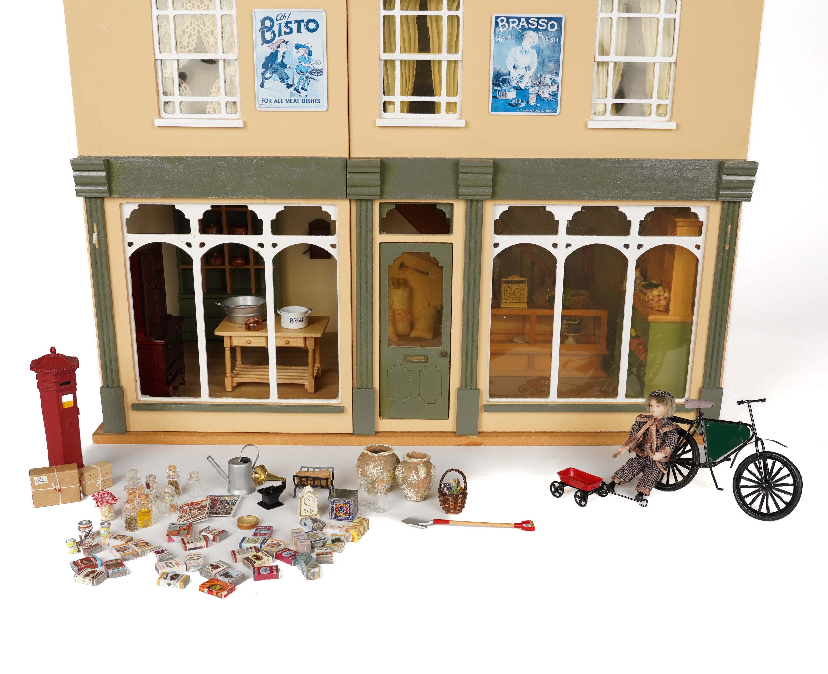 Detailed with two front display windows, 'Bisto' and 'Brasso' advertising signs to the first floor, and attic floor below the hinged roof, fitted with electrical wiring, each room with furniture and modelled details, 60cm wide, 37cm deep, 60cm high