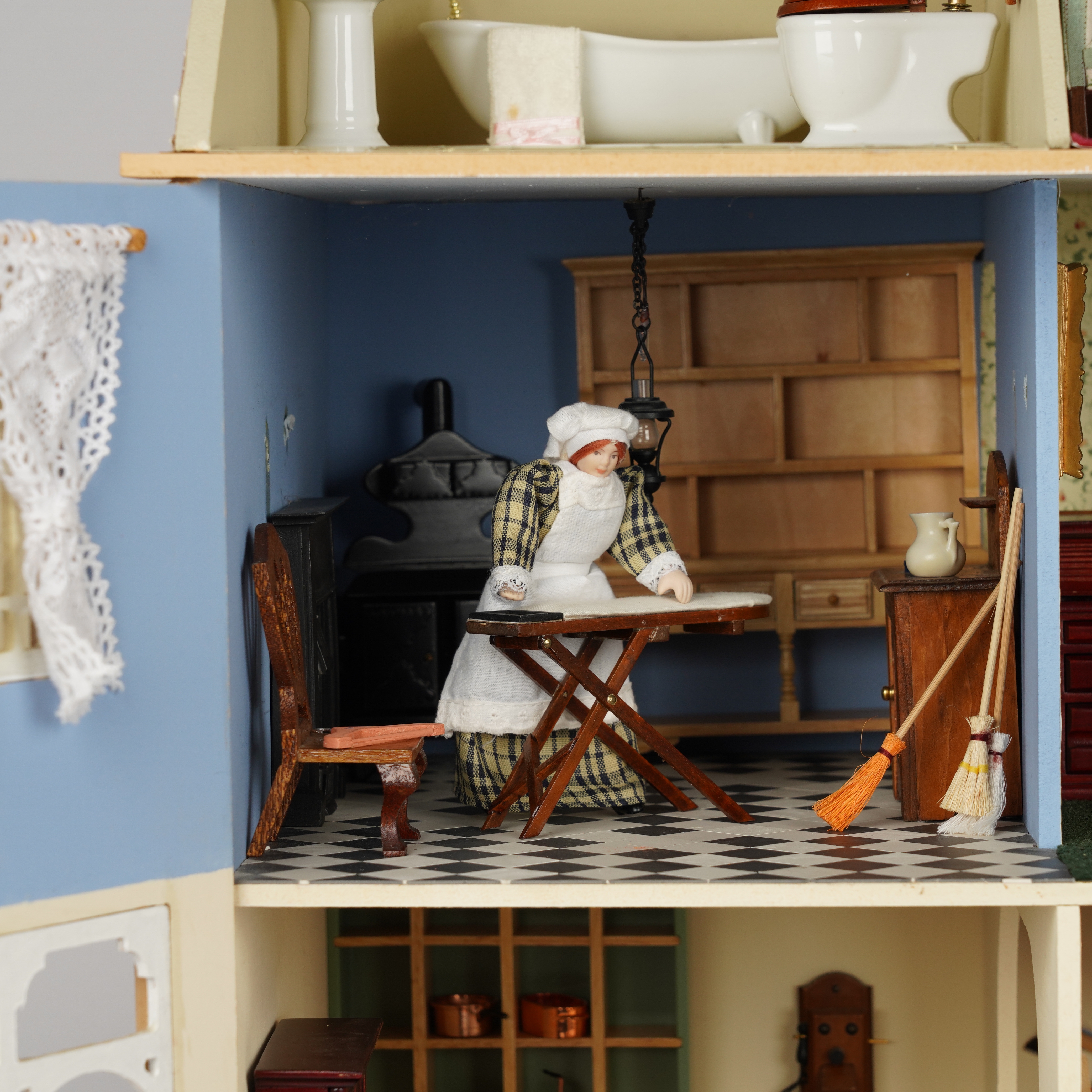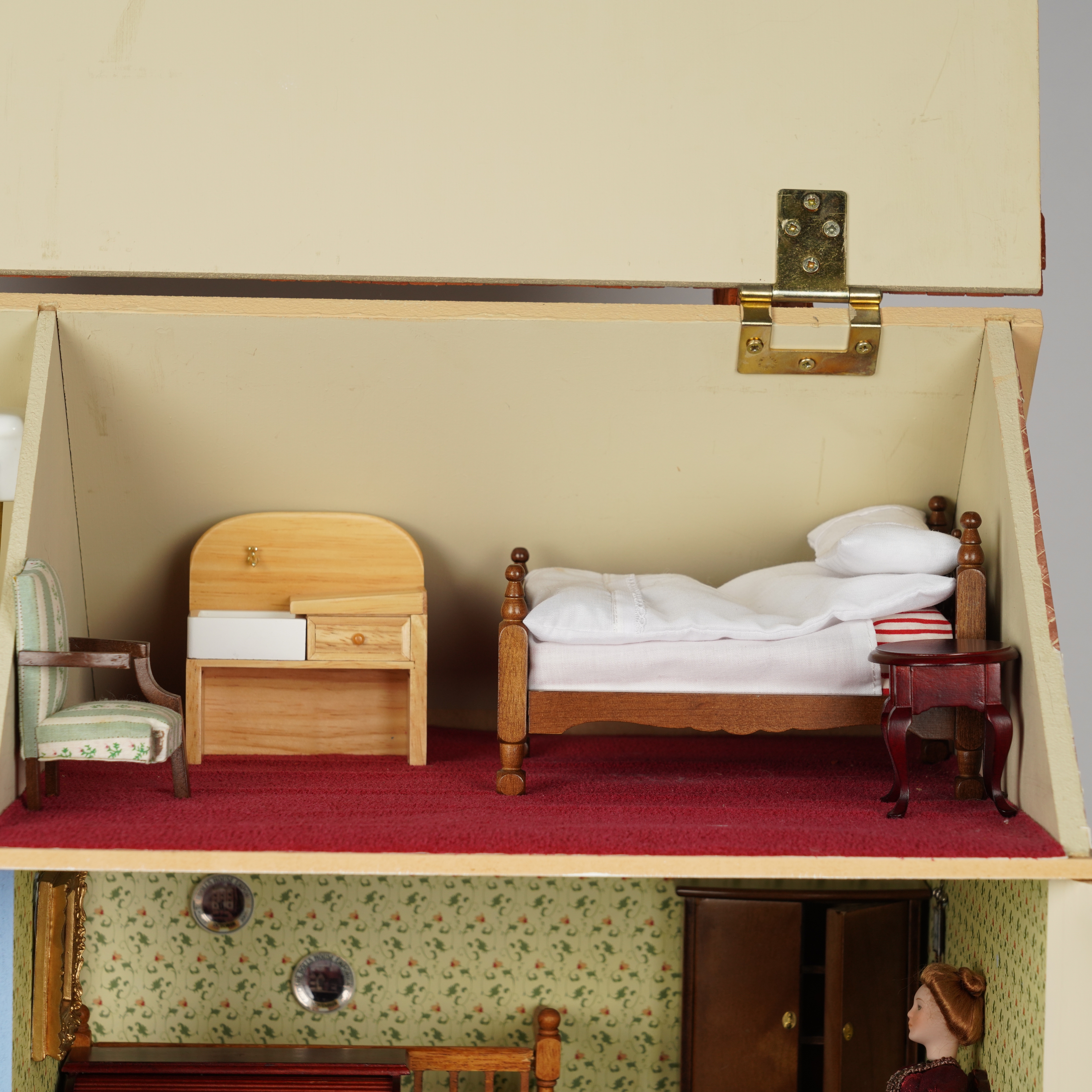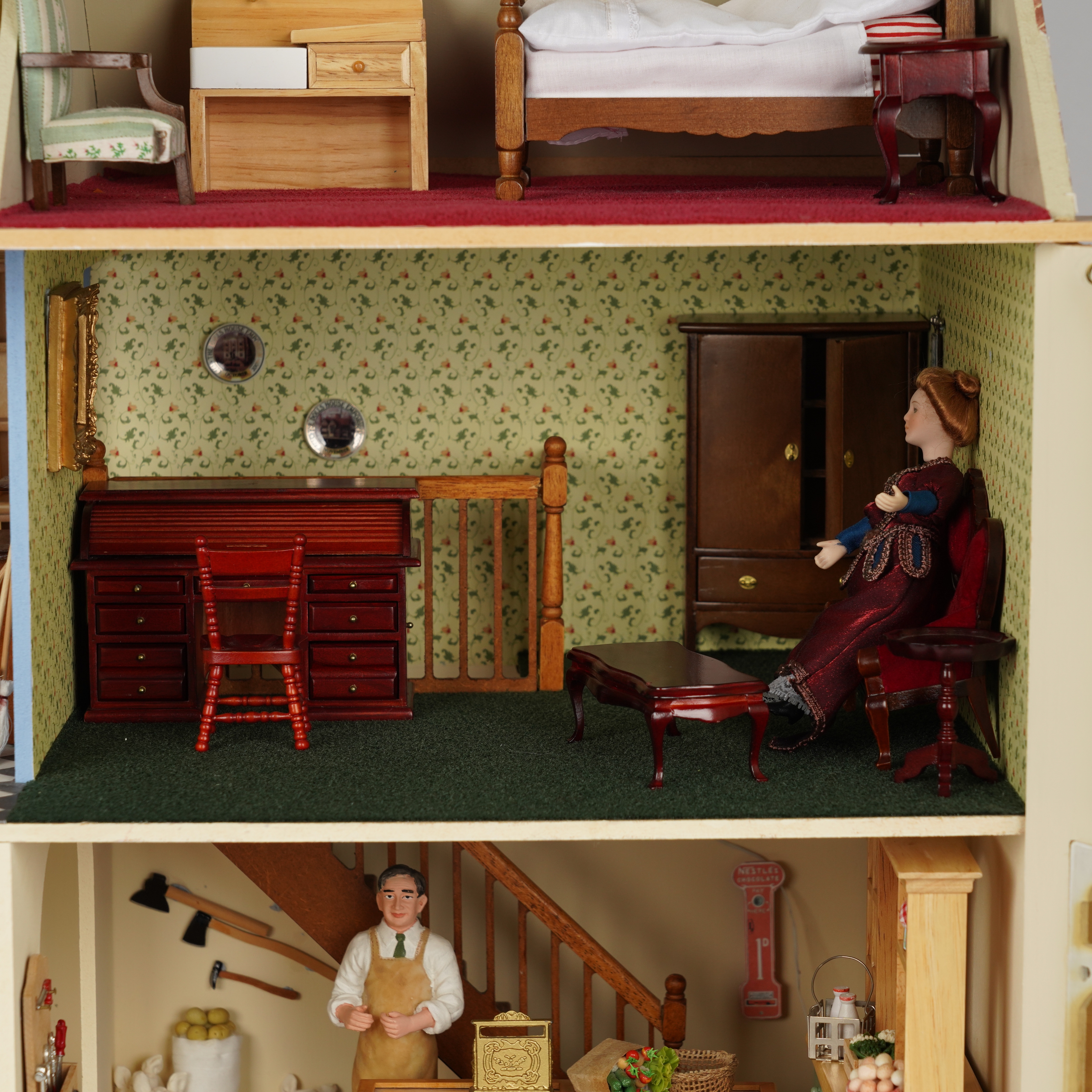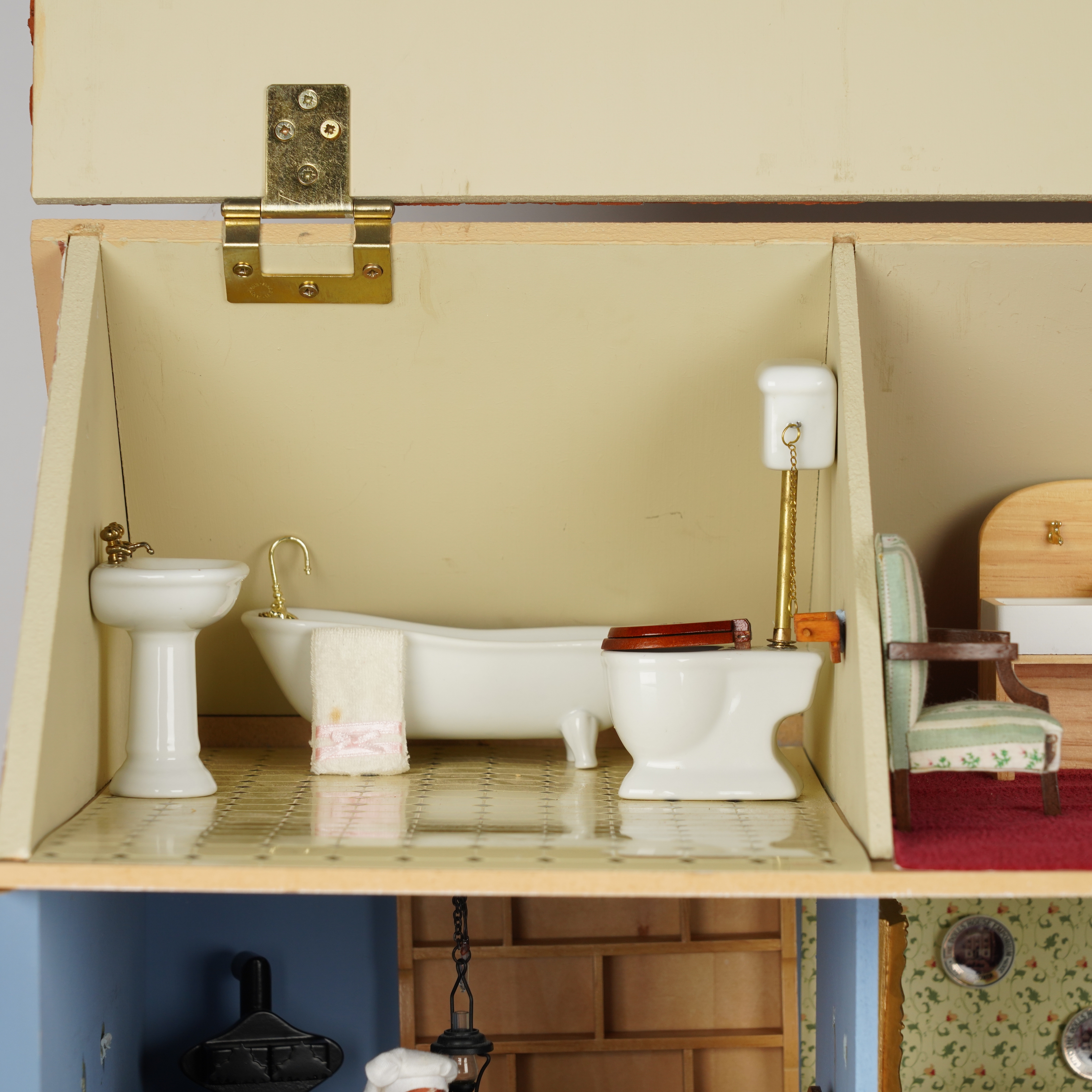 Detailed with two front display windows, 'Bisto' and 'Brasso' advertising signs to the first floor, and attic floor below the hinged roof, fitted with electrical wiring, each room with furniture and modelled details, 60cm wide, 37cm deep, 60cm high