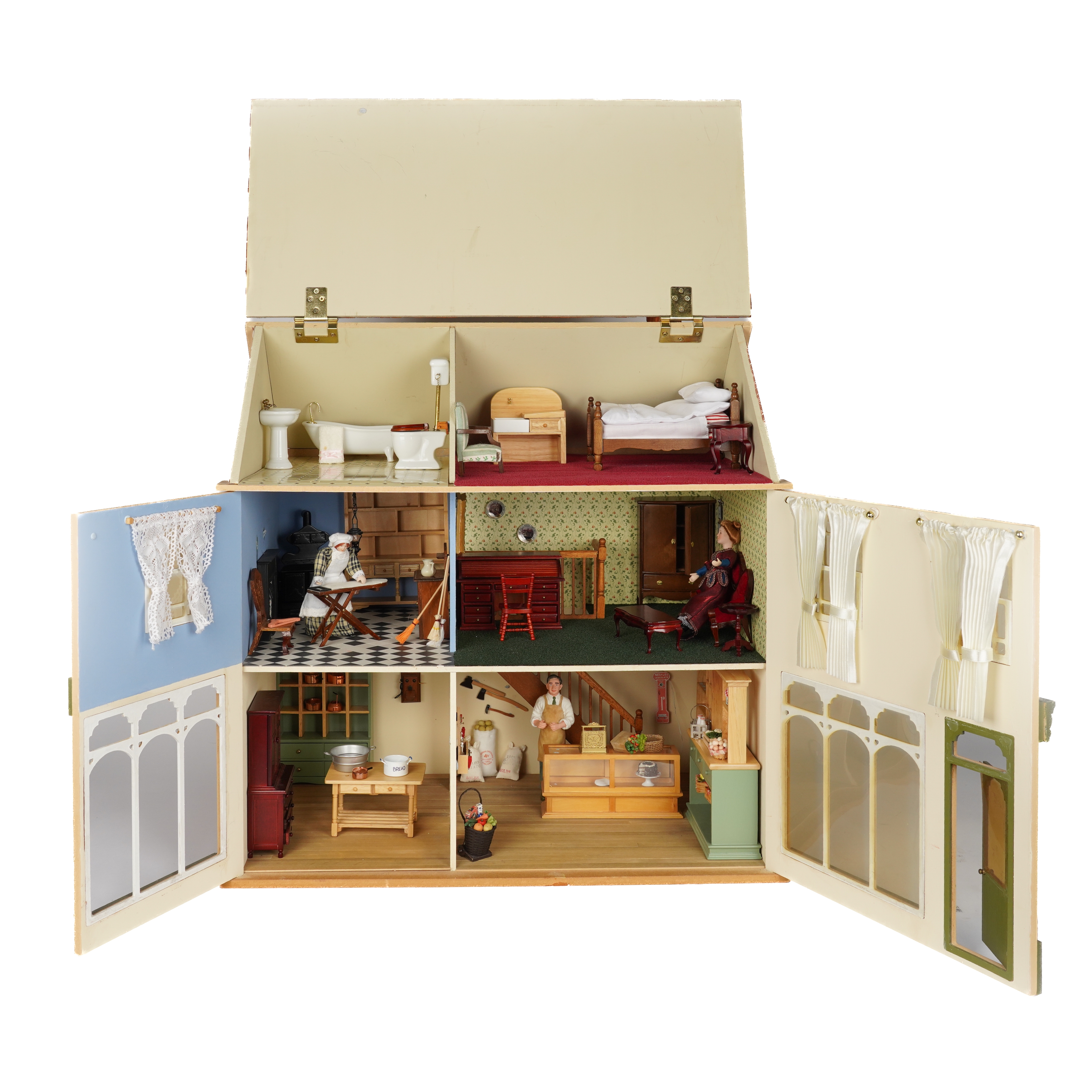 A PAINTED WOOD DOLL'S HOUSE OR MODEL SHOP WITH FITTINGS AND ACOUTREMENTS (QTY)
