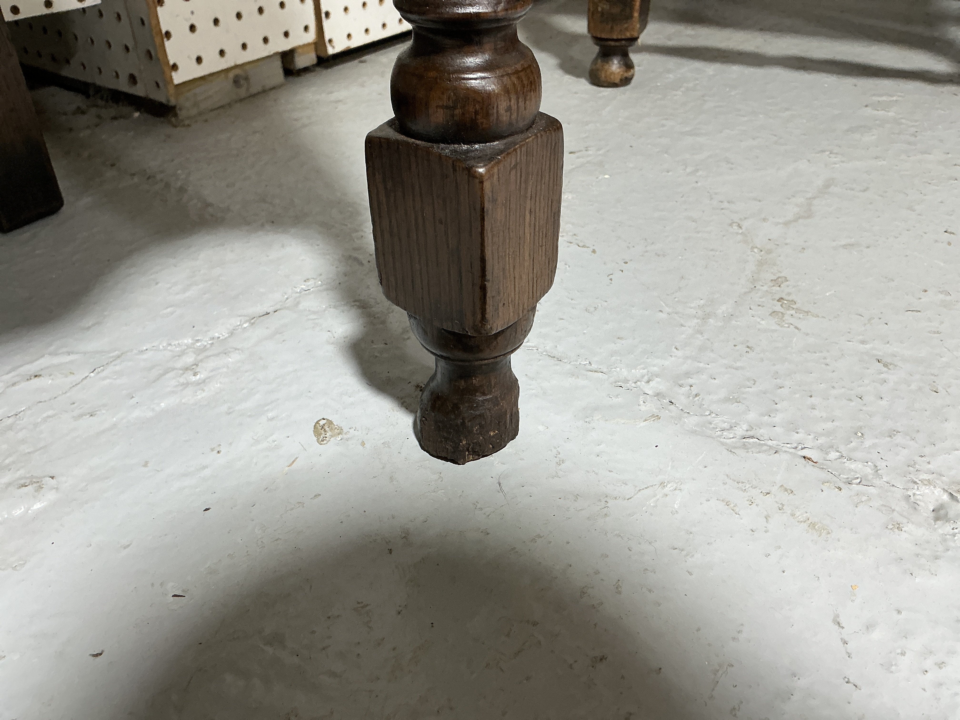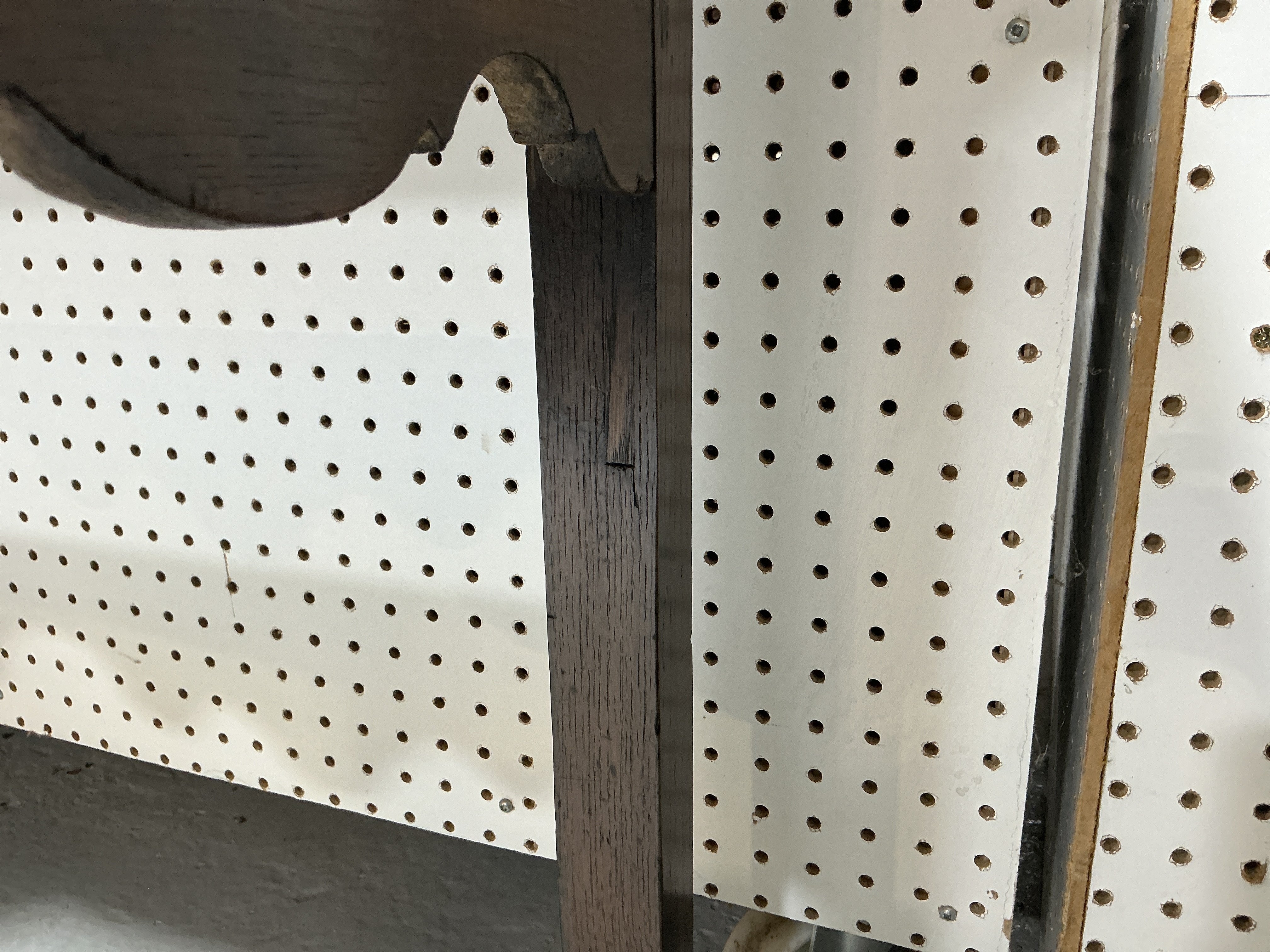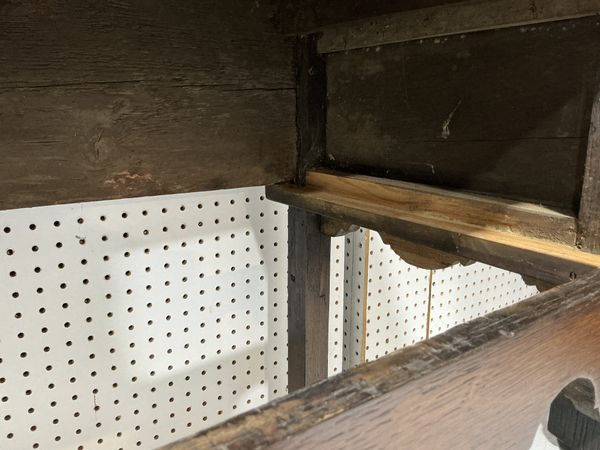 Condition report; Top has replacement plank to the back edge, drawers with later handles and filled holes where originals were, both back legs later replaced. Signs of old woodworm and some chips to the front right foot.