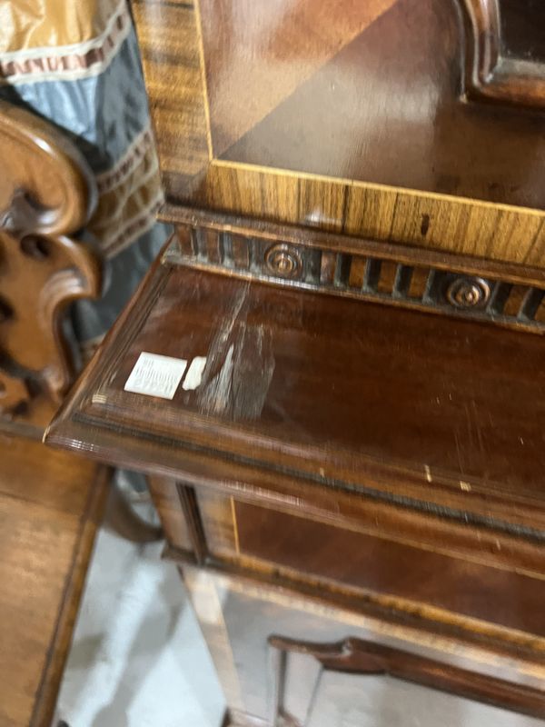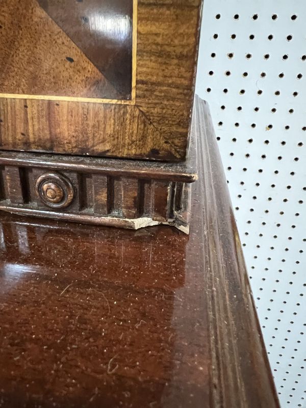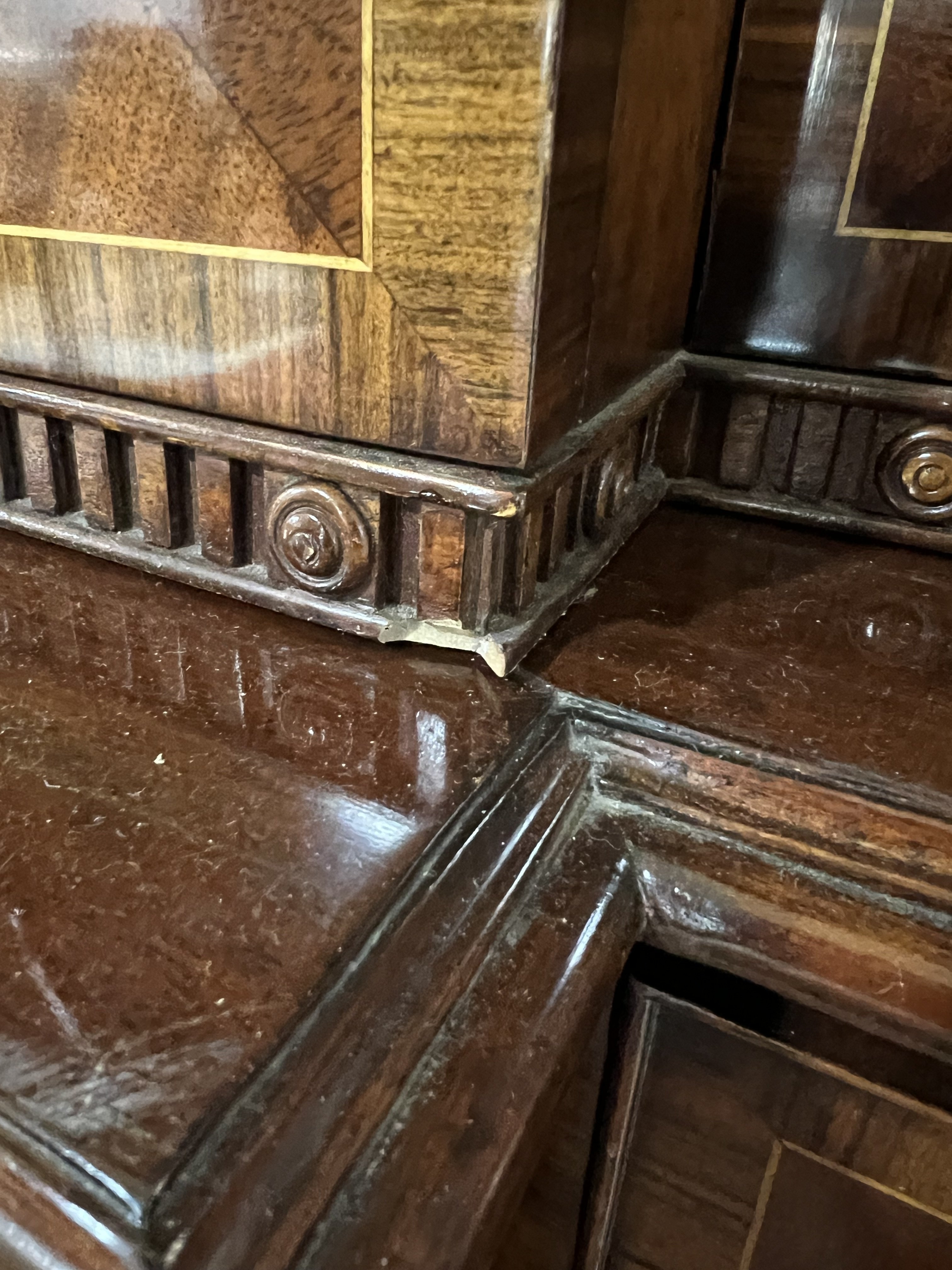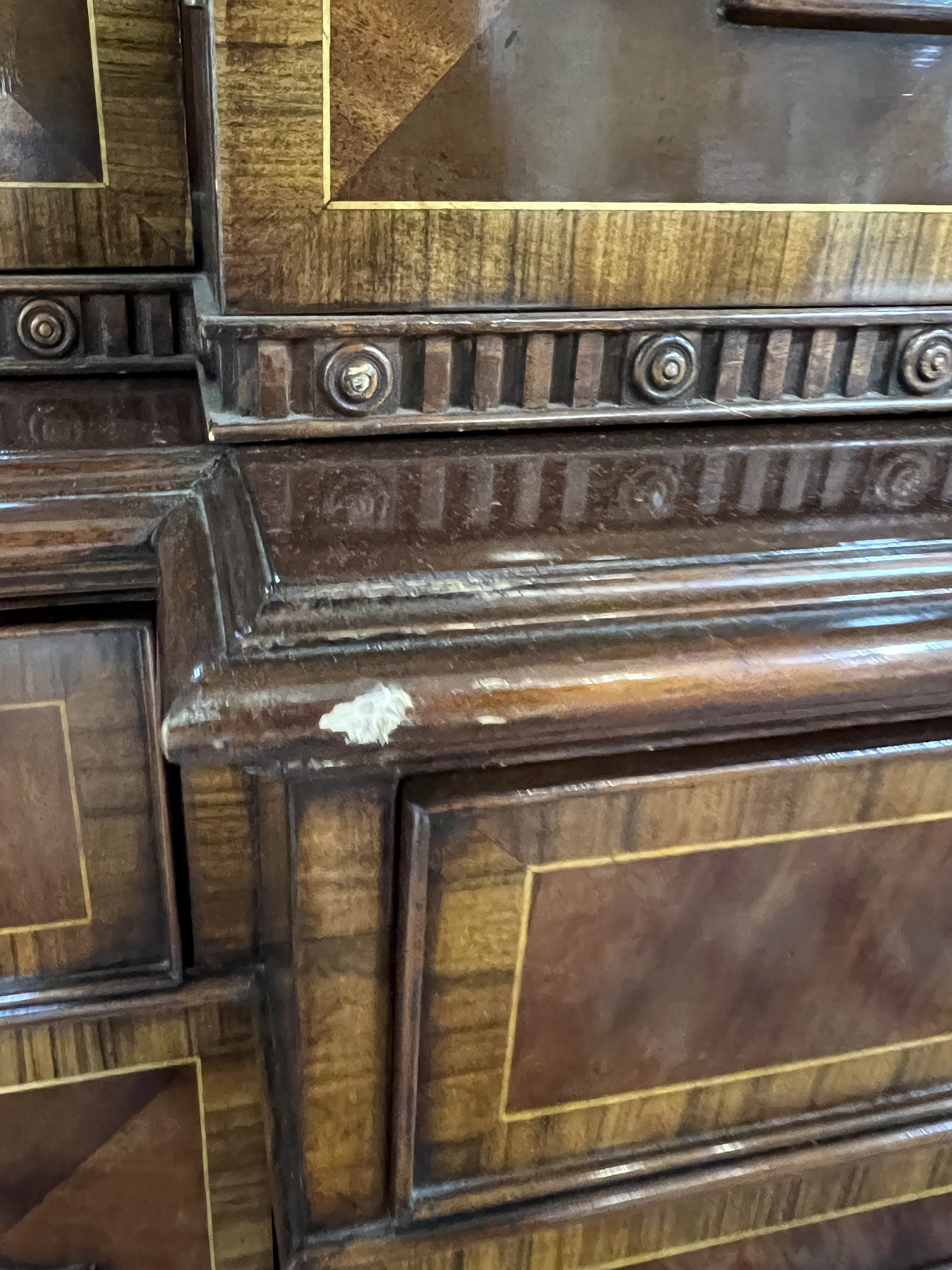 cupboard doors are locked with no keys present, no shelves present for, glazed top section 38cm deep, central section of cornice 60cm, flanking sections 47cm deep, chips and losses towards to bottom of top section see images.