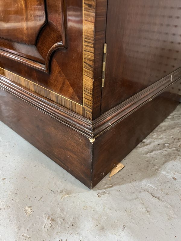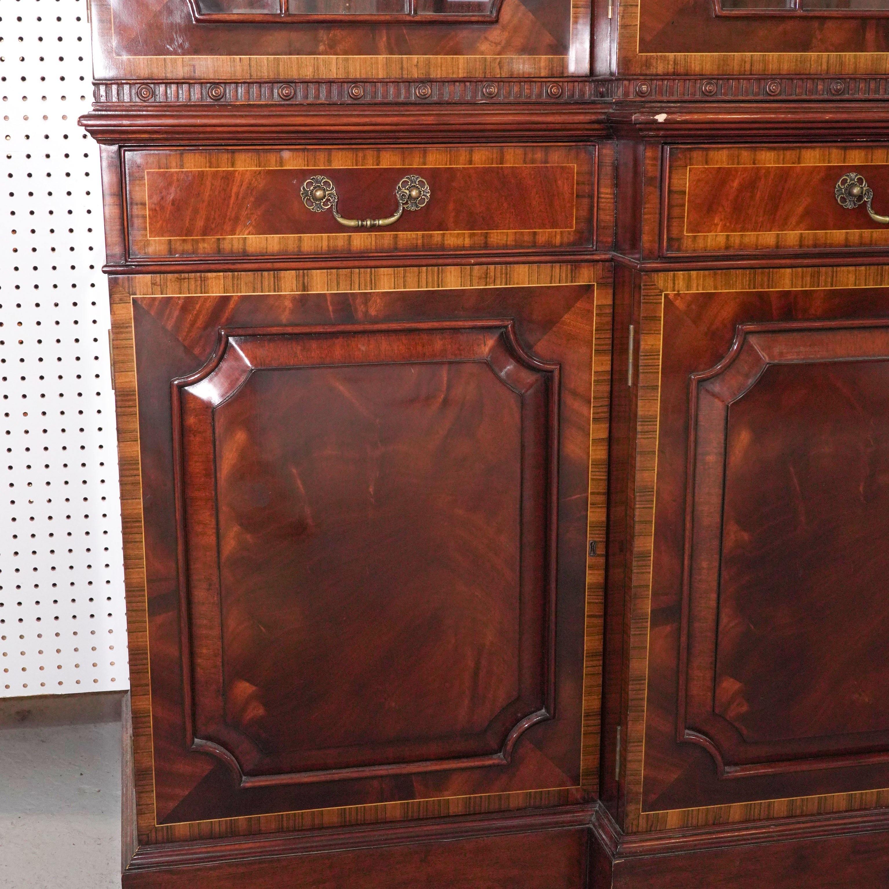 A GEORGE III STYLE INLAID MAHOGANY BREAKFRONT BOOKCASE CABINET