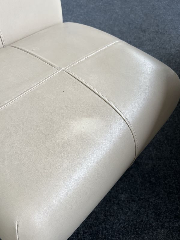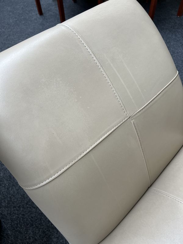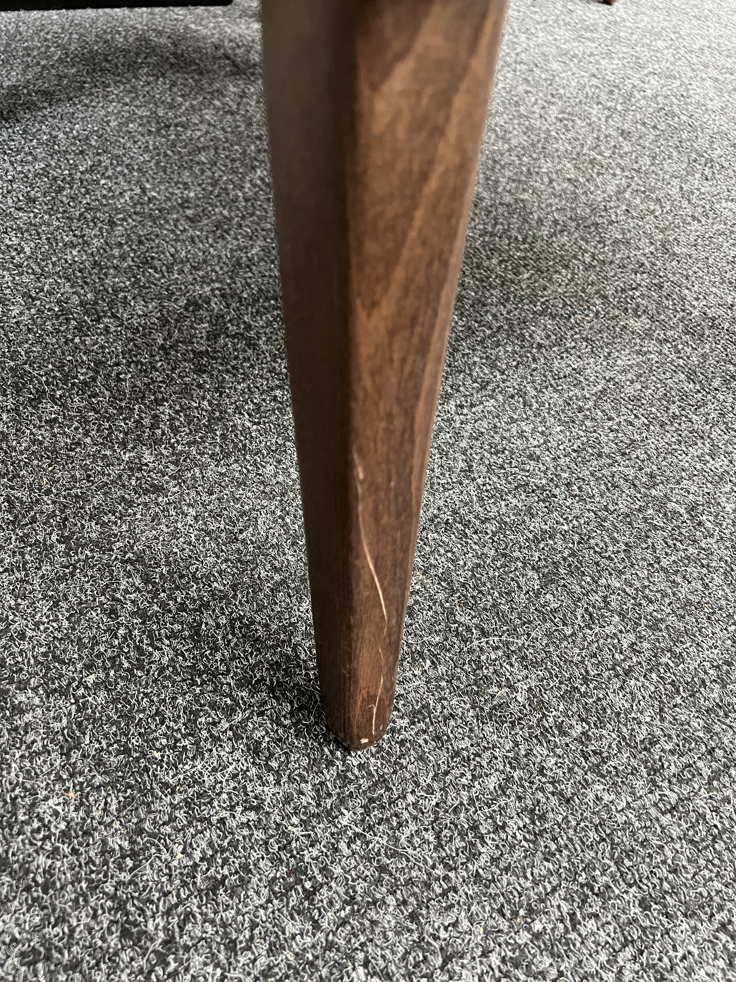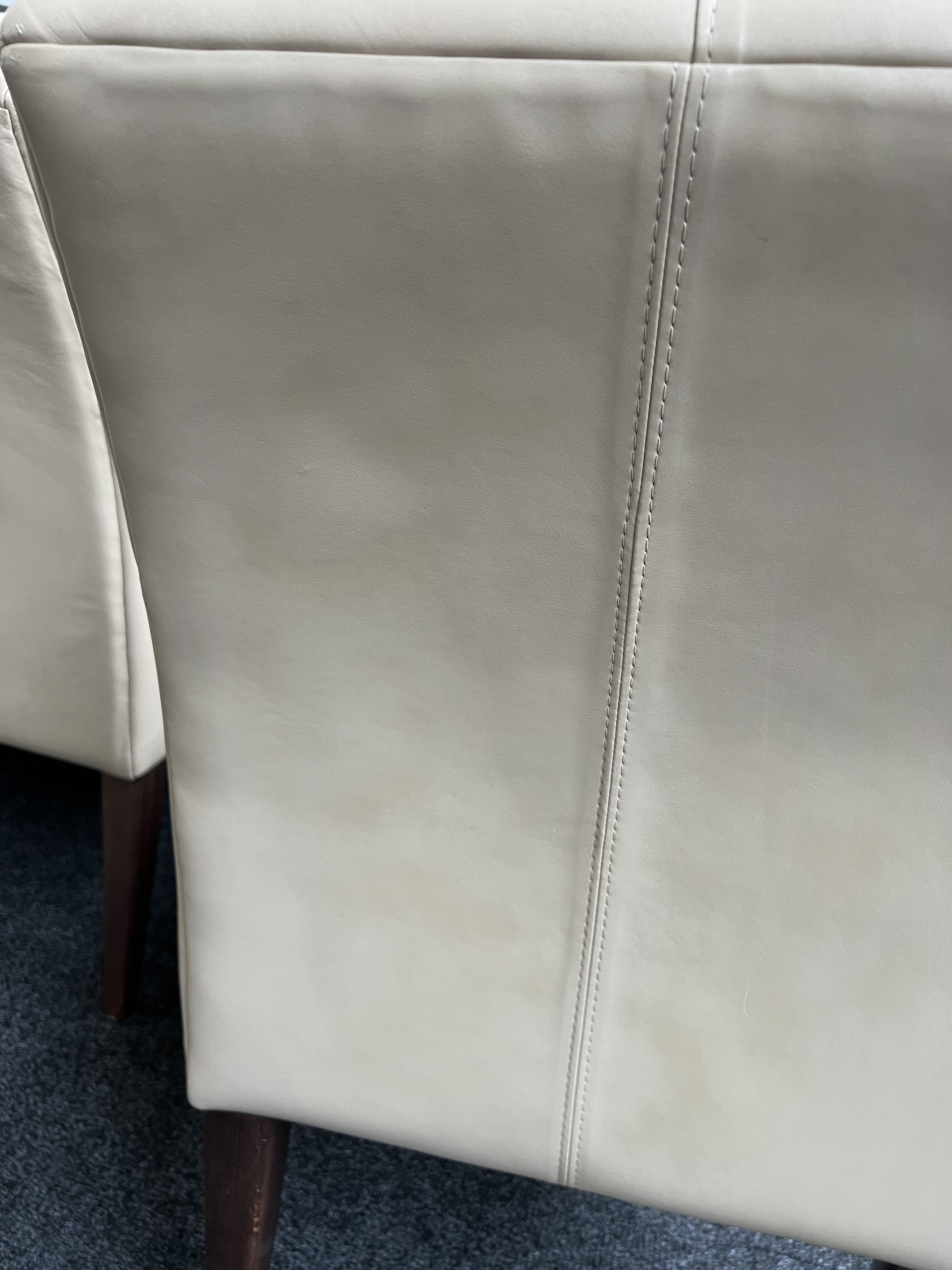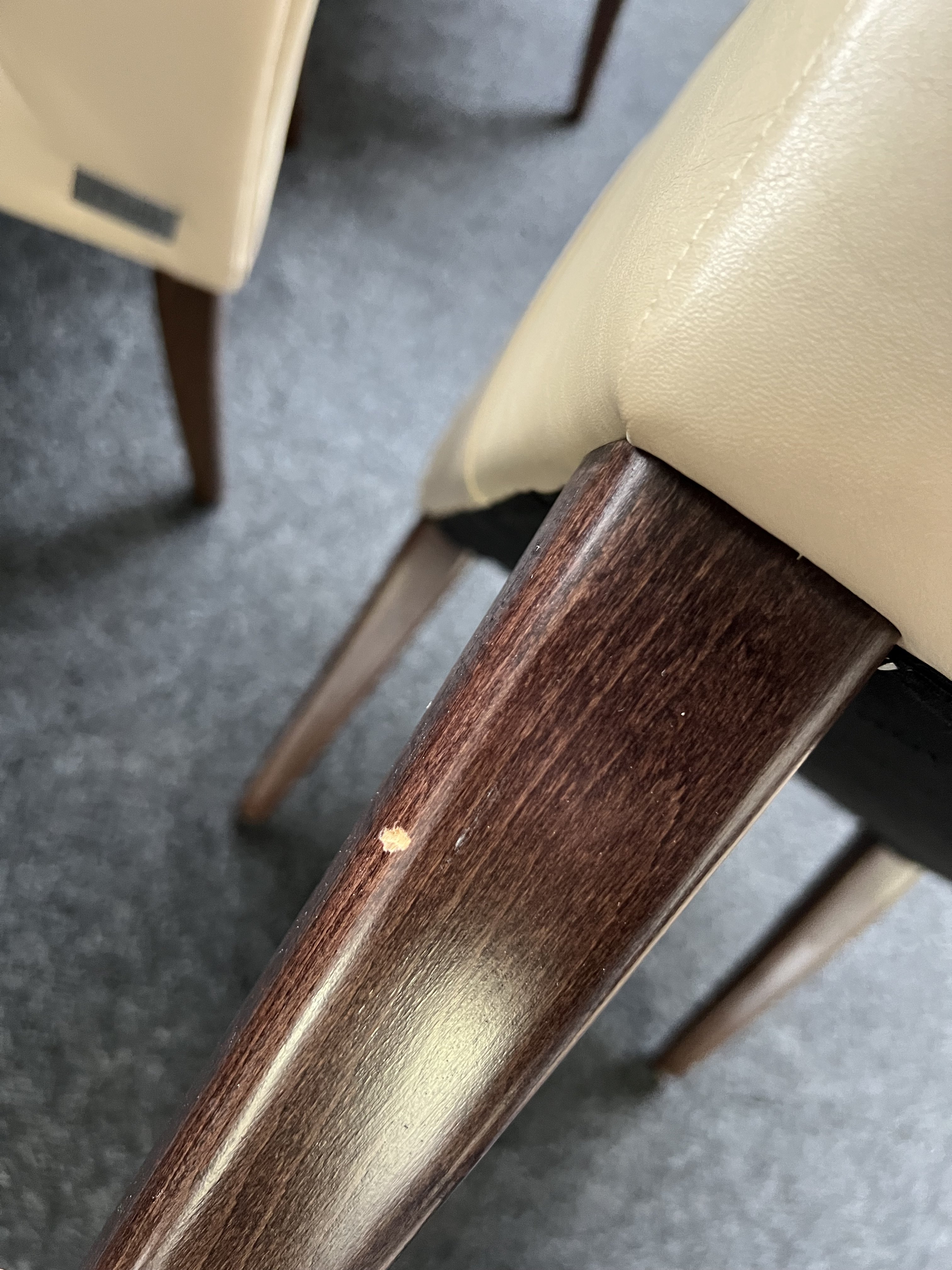 solid frames throughout, used condition with most having marks and scratches to the supports, one having a split to a back leg, some wear/ water marks to the upholstery to the back of three chairs from use see additional images.