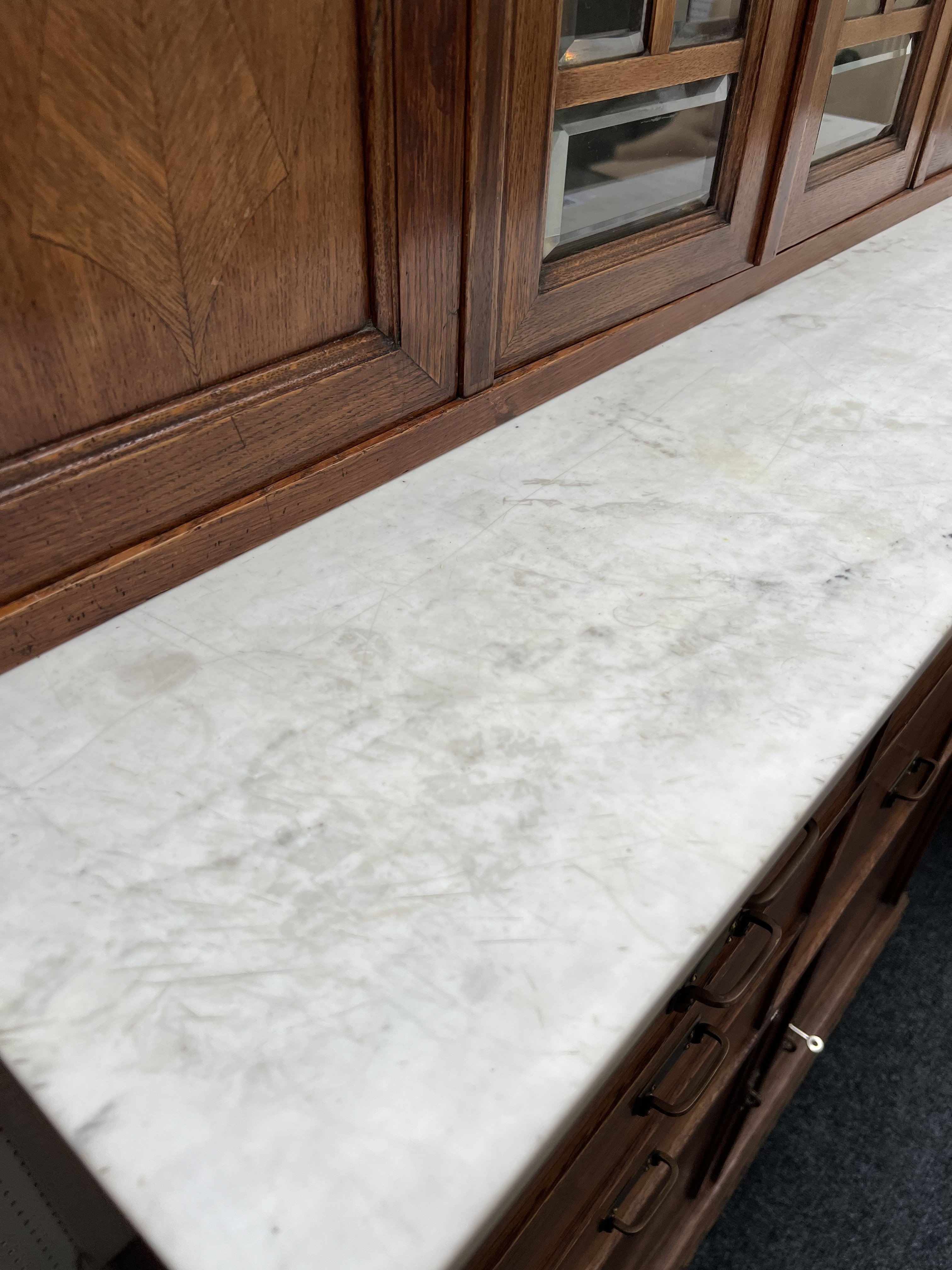 very good overall condition, very minor light old marks and scratches, some light surface scratches to marble top with some small old chips along the top edge of marble top, see additional images.