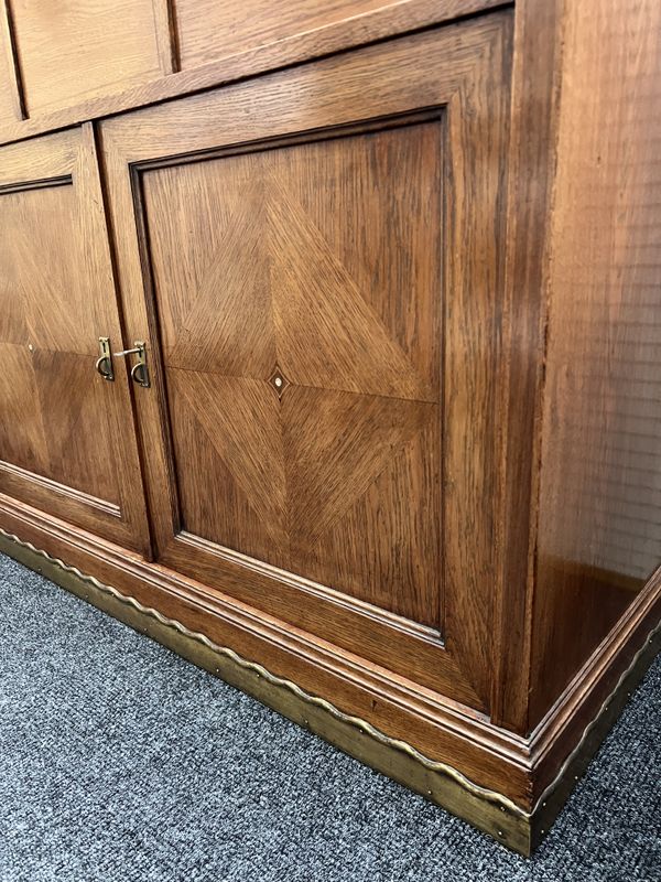 With central bevelled glass doors flanked by mother-of-pearl dot inlaid cupboards over white marble top and an arrangement of drawers and cupboards on wavy brass bound plinth base, 114cm wide; 51cm deep; 173cm high