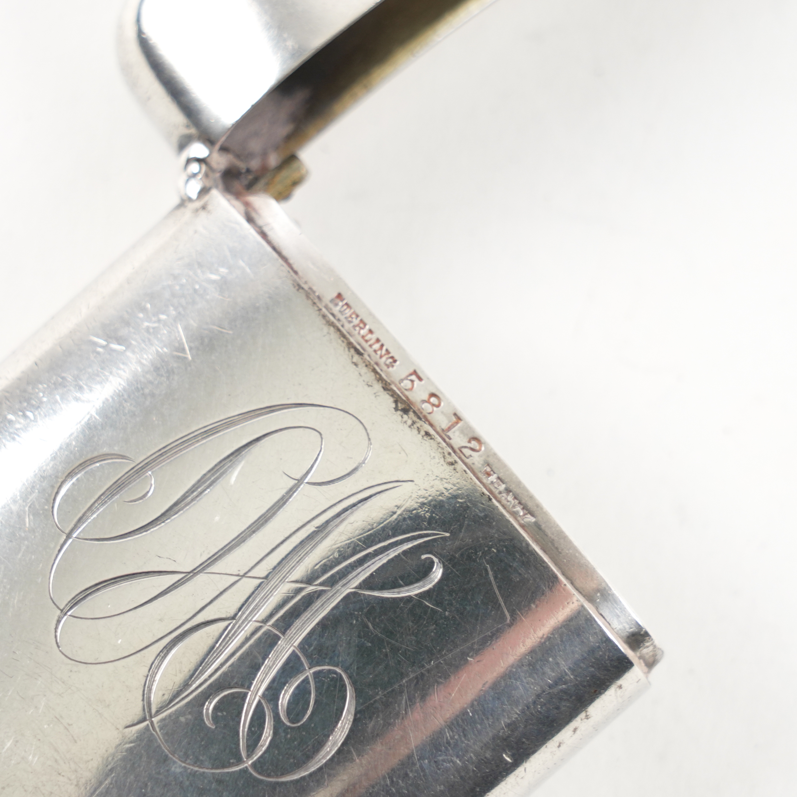 Comprising; a cigarette case, Birmingham 1916, a Sterling vesta case, monogram engraved, a silver thimble, a money clip, formed as an abacus, detailed Sterling Silver 925, combined gross weight 156 grams and a small oval photo frame, import mark London 1978