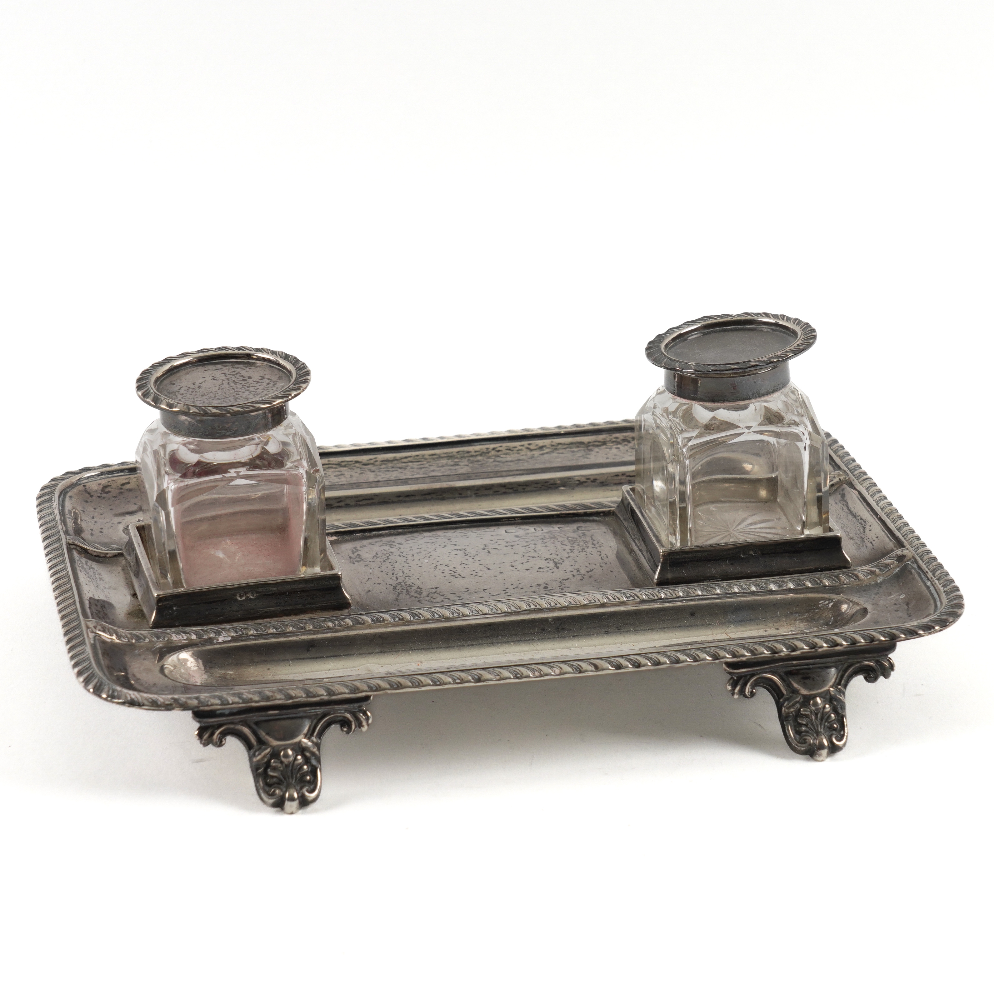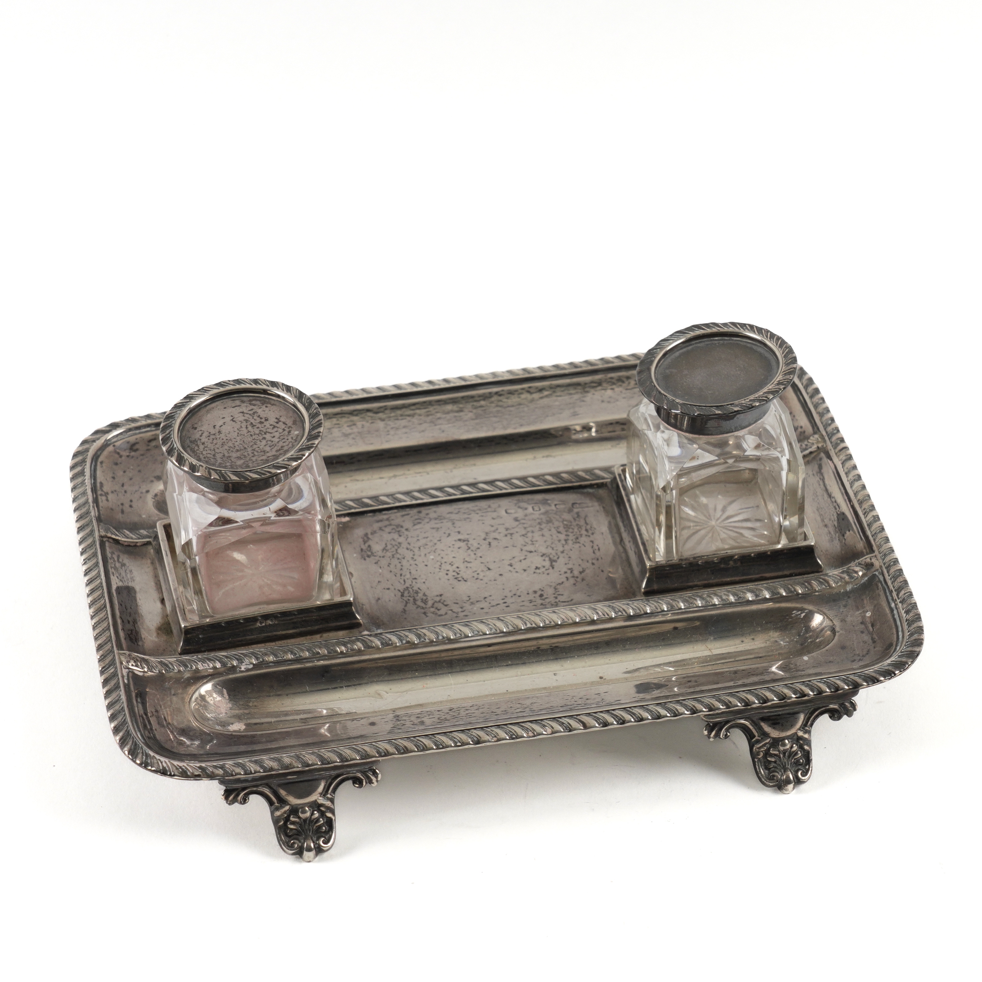 Having a gadrooned rim, raised on four shell and scroll feet, size 23.3cm x 17cm, Birmingham 1897, fitted with two silver mounted square glass ink bottles, weight of inkstand 576 grams