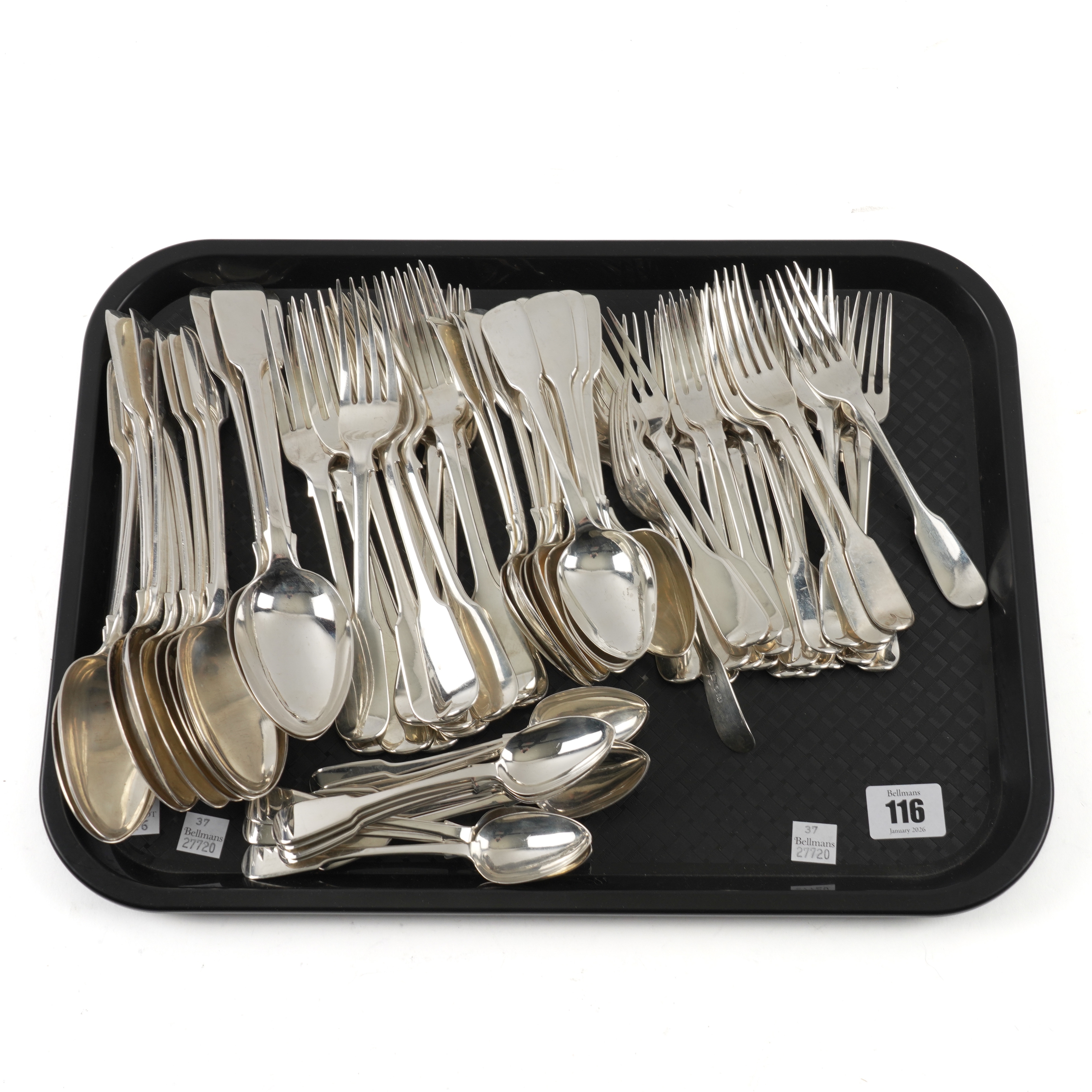 A GROUP OF SILVER FIDDLE PATTERN TABLE FLATWARE (107)