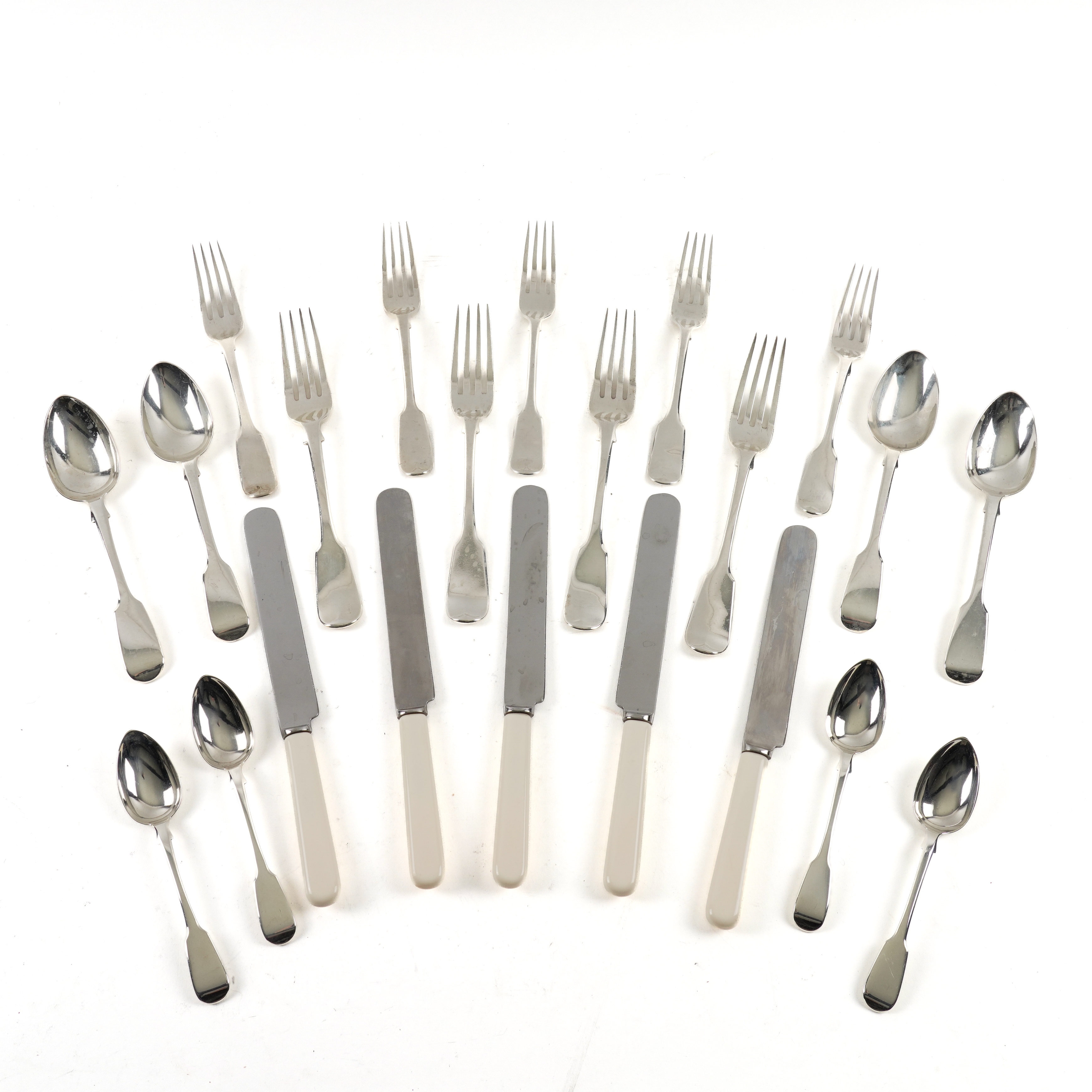 Comprising; twelve dessert spoons, twelve tablespoons, twelve table forks, twenty-three dessert forks and twelve teaspoons, mixed mostly Victorian dates and makers, combined weight 3525 grams, also twelve table knives and twenty-four cheese knives, having plastic handles