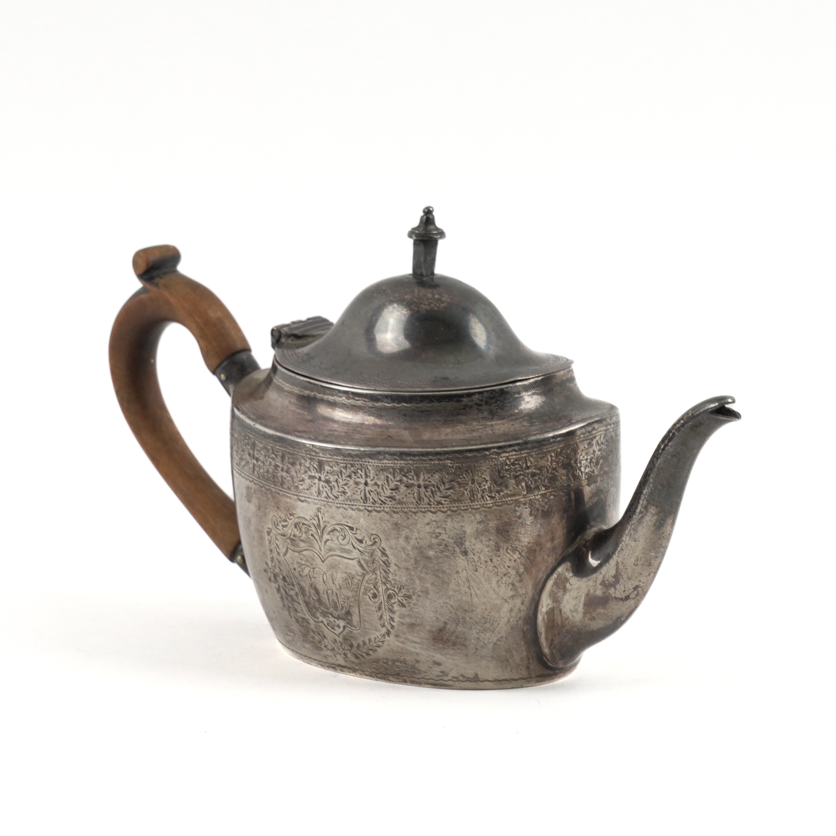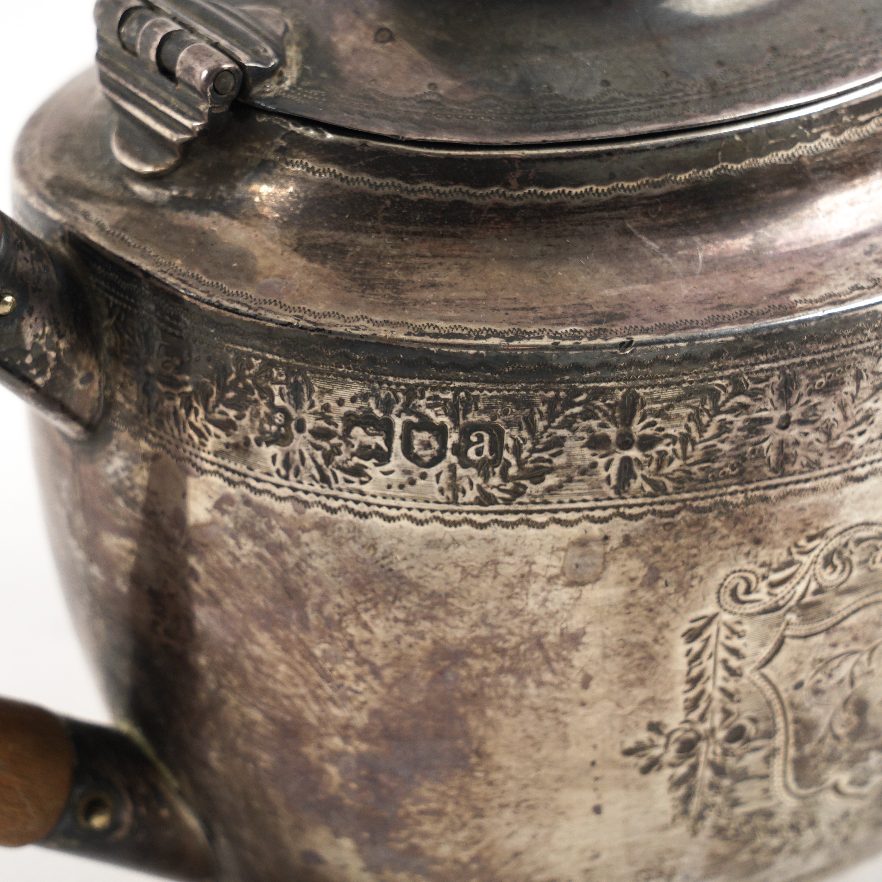 Of oval form, with engraved decoration and with a wooden handle, the wooden finial missing from the hinged lid, London 1896, gross weight 210 grams