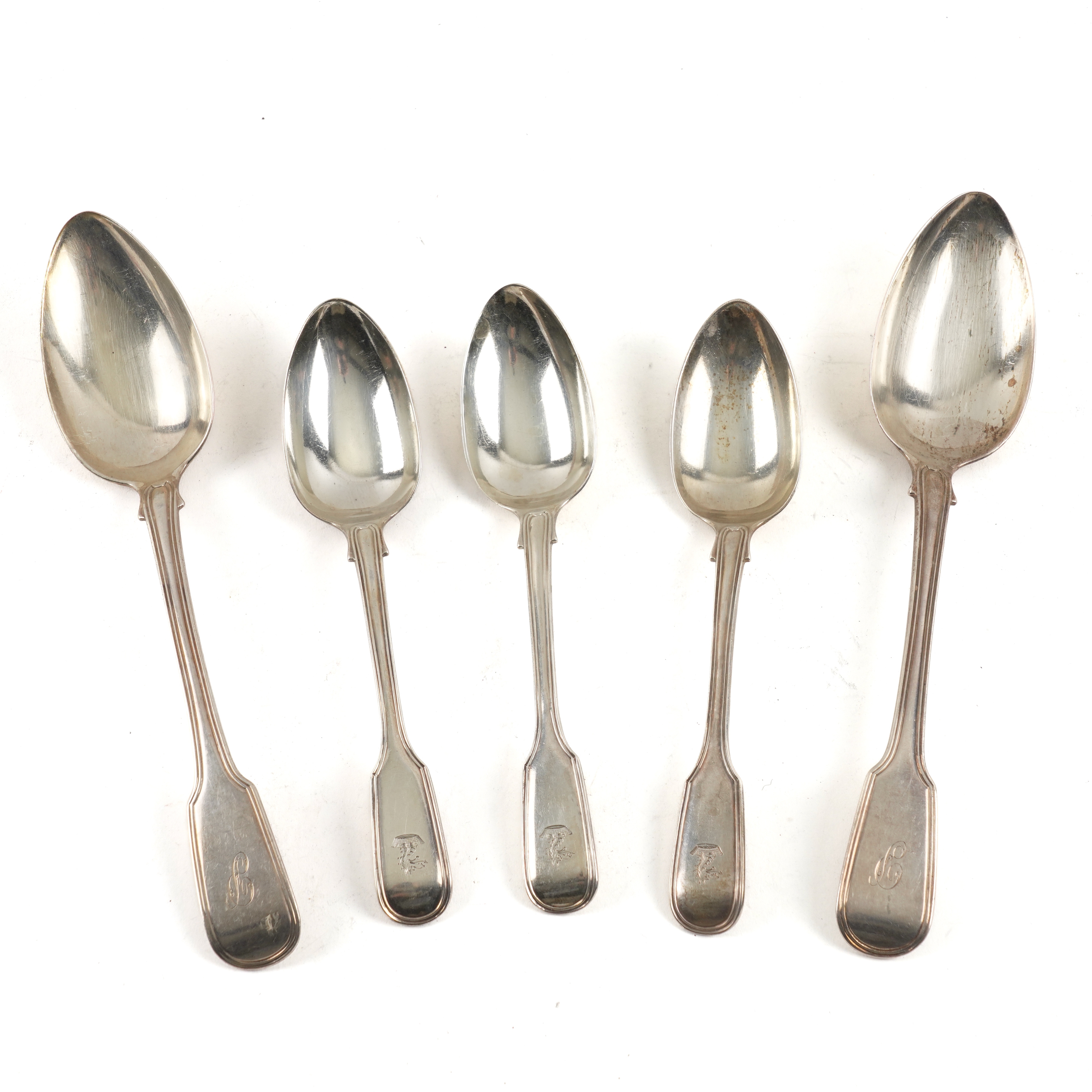 Comprising; a pair of tablespoons, London 1818 and three dessert spoons, London 1842, combined weight 344 grams