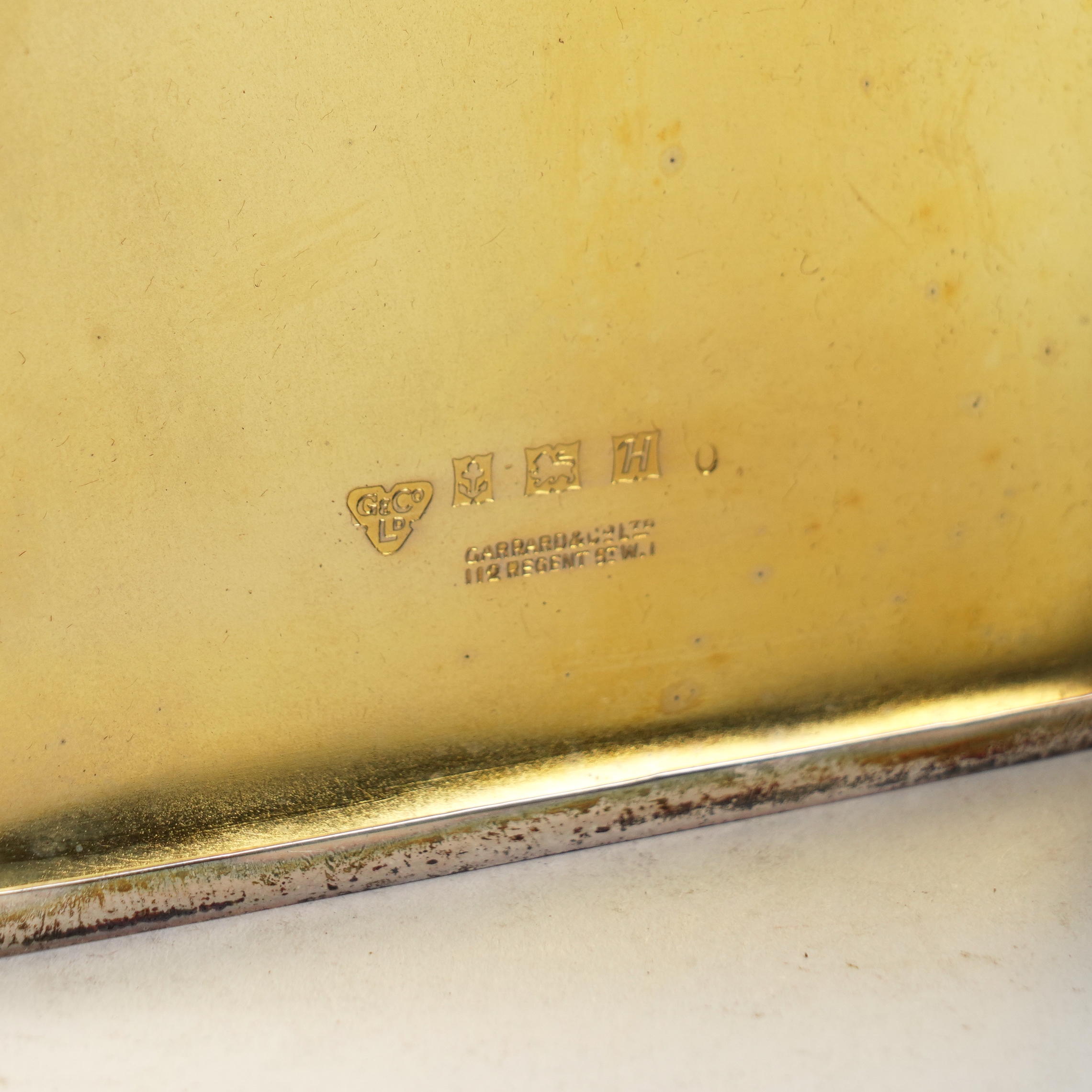 Matt gilt within, the exterior engine turned, size 11.3cm x 8.4cm, by Garrard and Co Limited, Birmingham 1957, gross weight 161 grams, with a slip case
