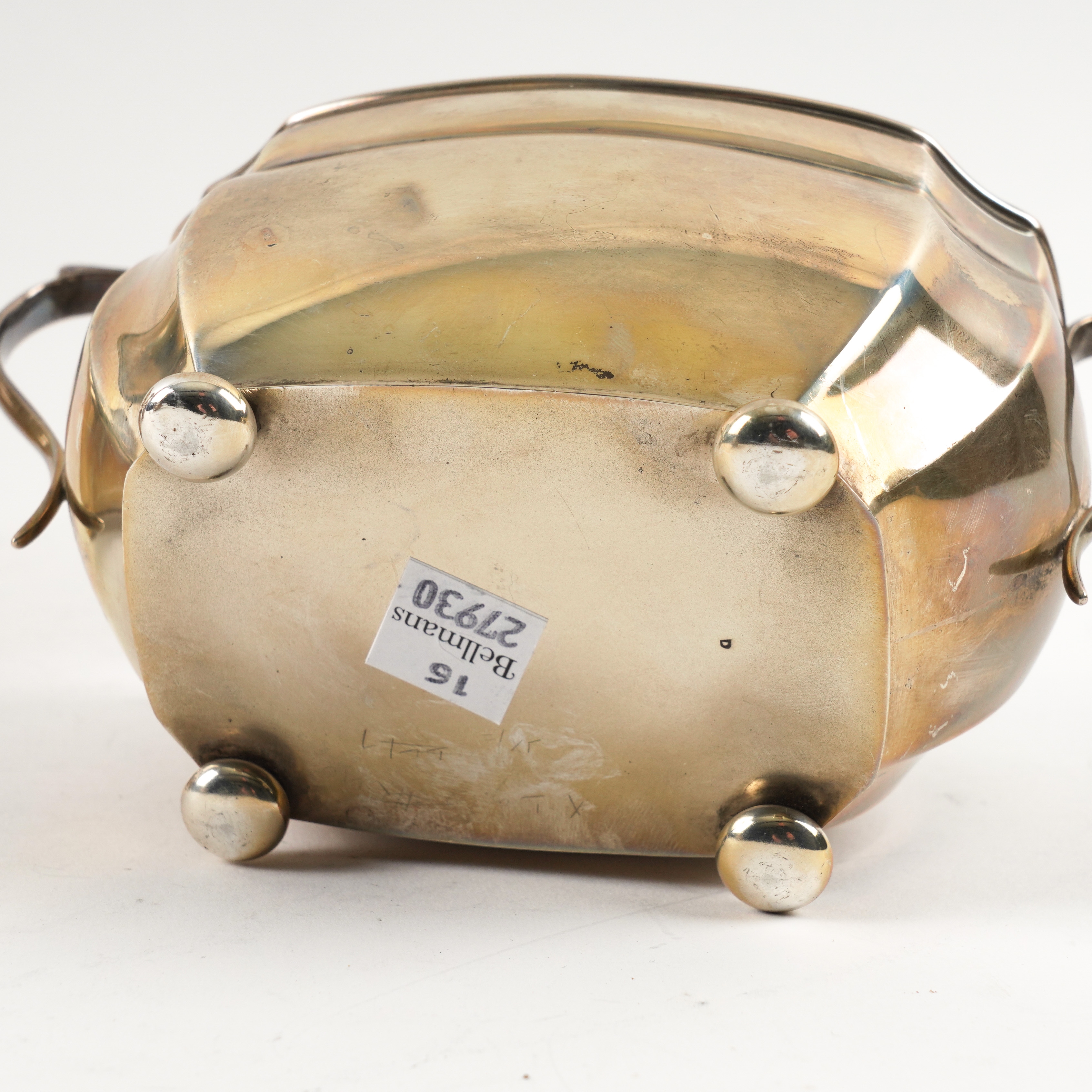 Comprising,; a teapot, Chester 1931, a hot water jug, Birmingham 1931 (both having black fittings), a twin handled sugar bowl, Chester 1929 and a milk jug, Chester, (the date letter rubbed), each piece raised on four bun feet, combined gross weight 1370 grams