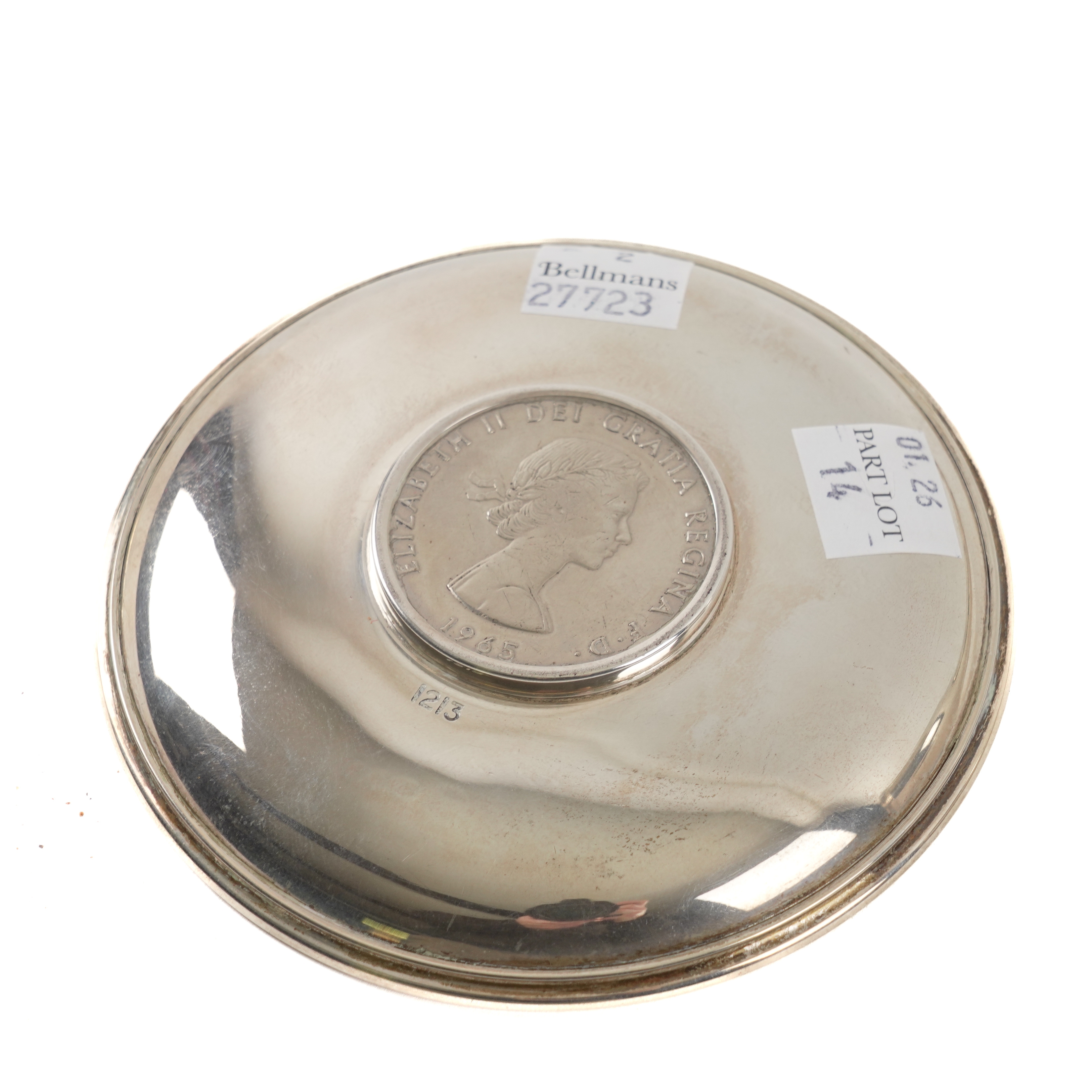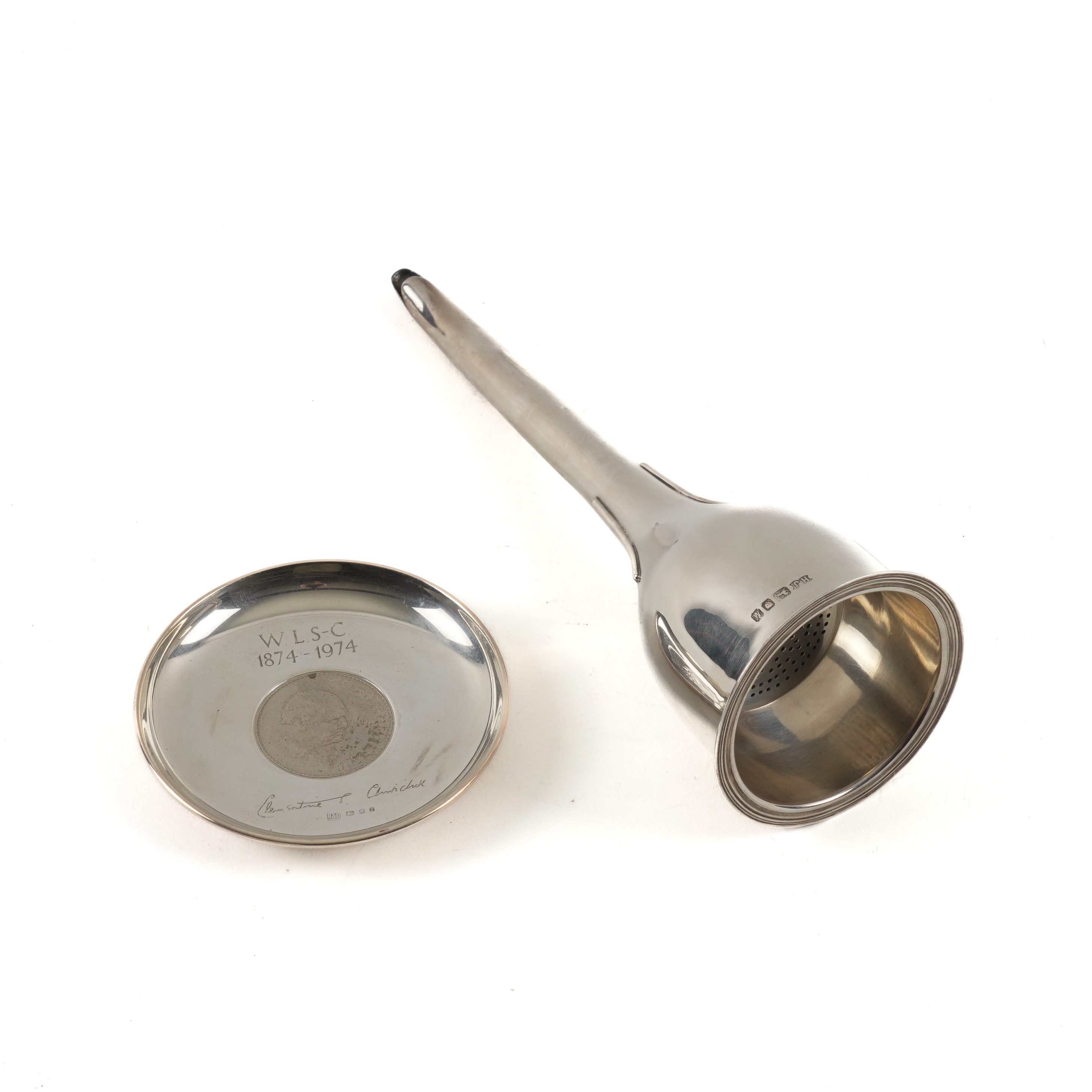 The wine funnel fitted with a lip to the detachable top, London 1986, length 24cm, weight 185 grams, with a case detailed The Hugh Johnson Collection, the circular silver dish mounted with a cupro nickel Churchill crown 1965, London 1974, with a case