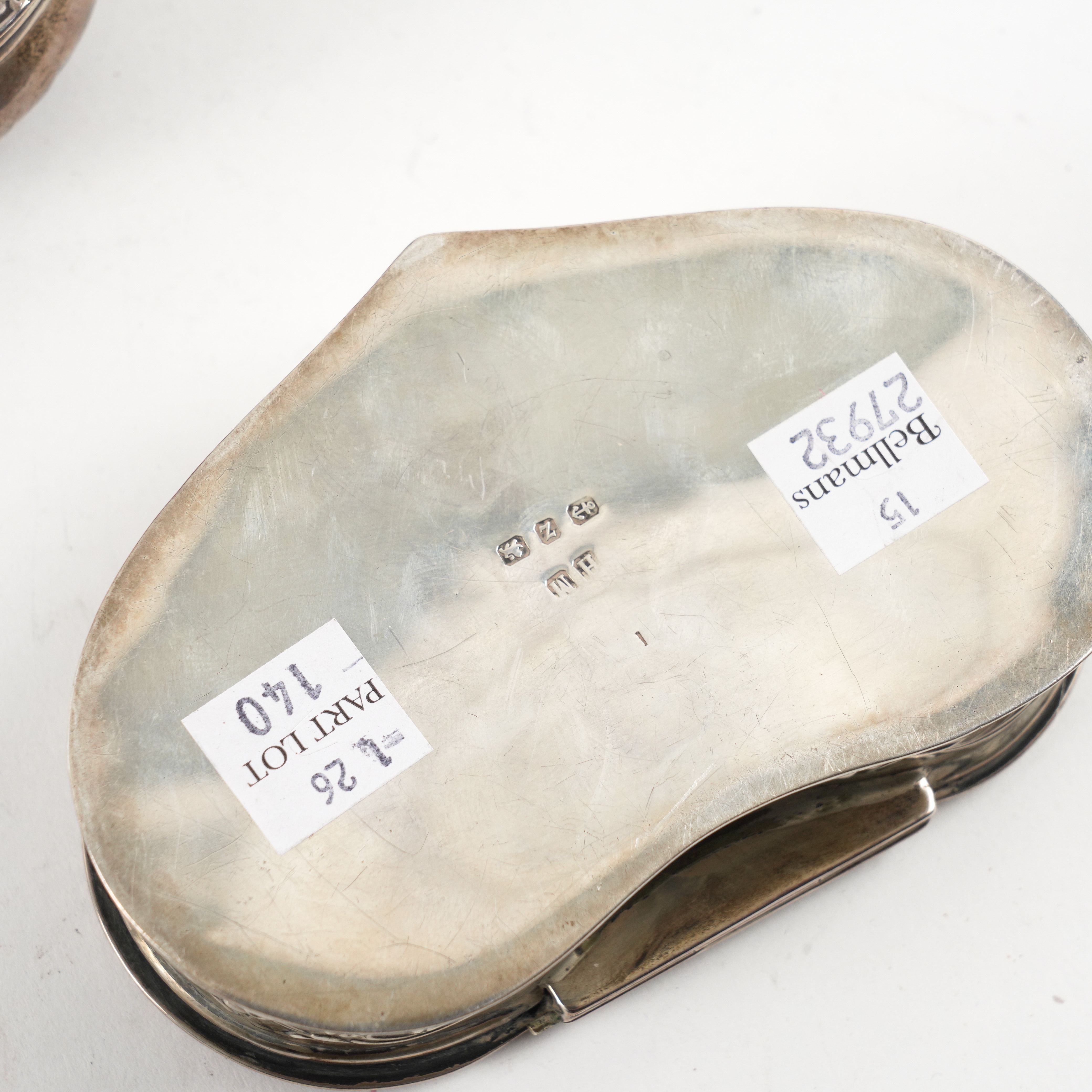 Comprising; a hinge lidded late Victorian trinket box, gilt within, the lid decorated with figures in a garden scene in the Dutch taste, Birmingham 1899, length 11.3cm, weight 127 grams, a circular trinket box, raised on three feet, Birmingham 1914 and a pair of small candlesticks, sample height 8cm, (loaded) Chester 1922