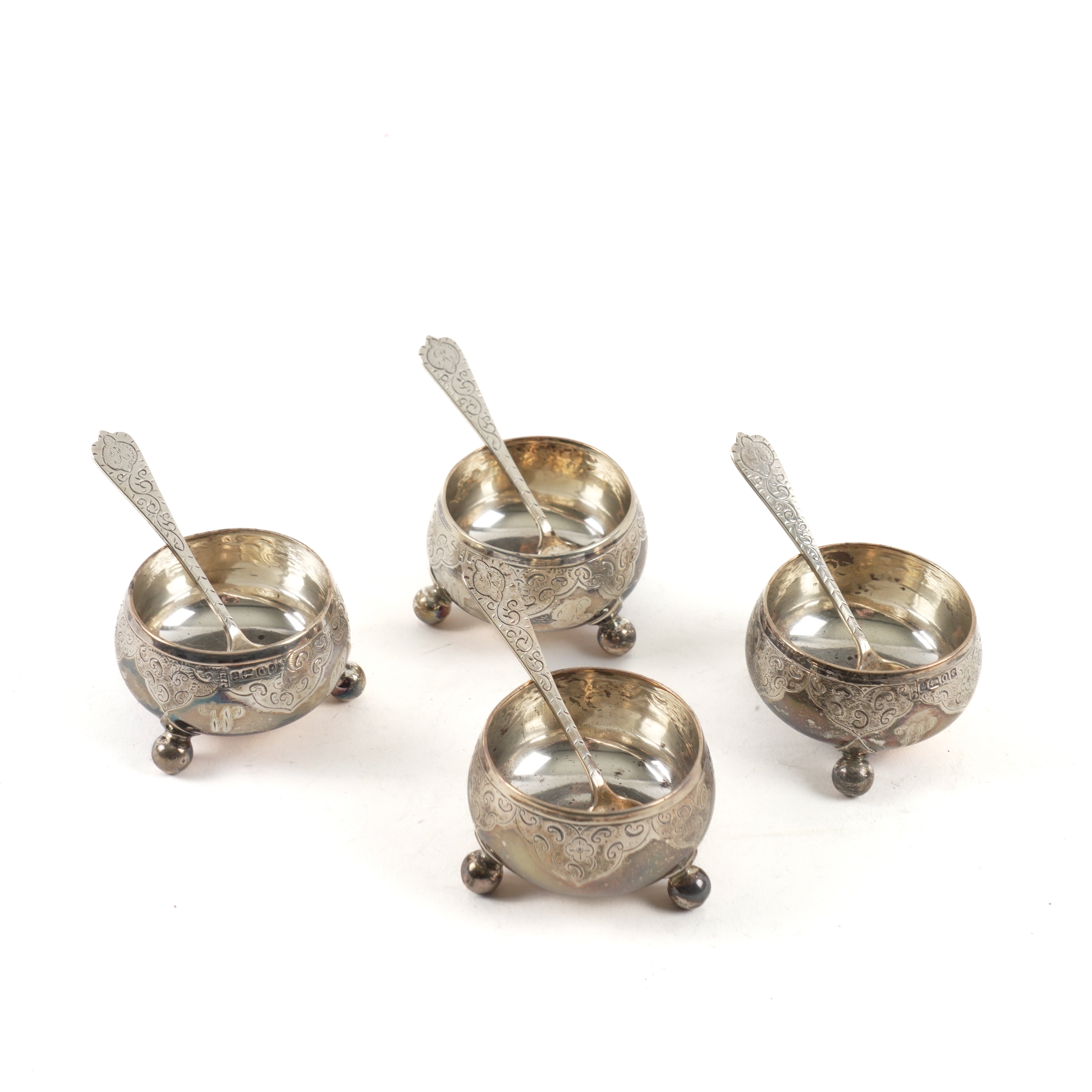 A SET OF FOUR VICTORIAN SILVER SALTS AND FOUR SALT SPOONS