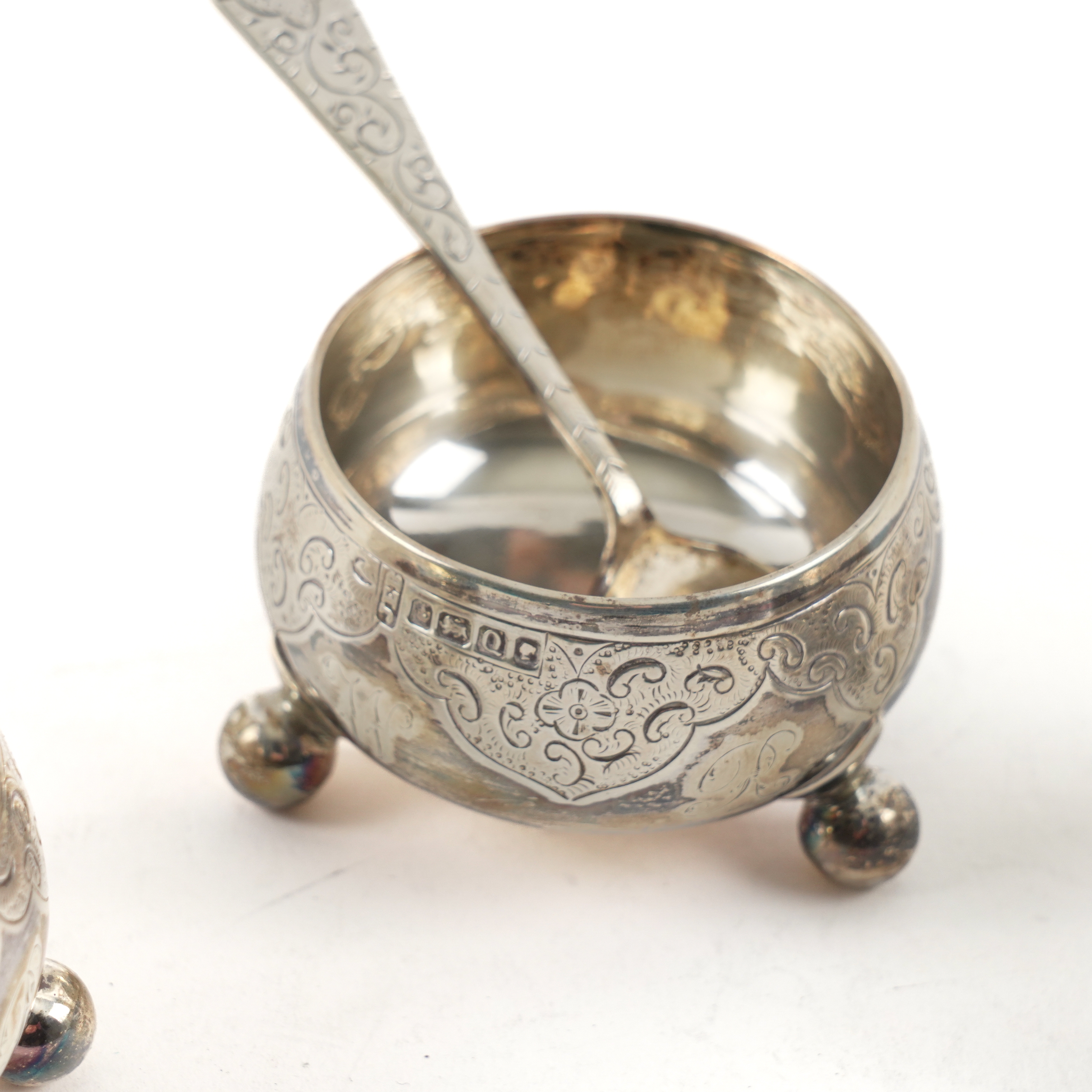 Each circular salt with engraved decoration and raised on three spherical feet, the salt spoons with engraved decoration, all Sheffield 1883, combined weight 247 grams, with a case