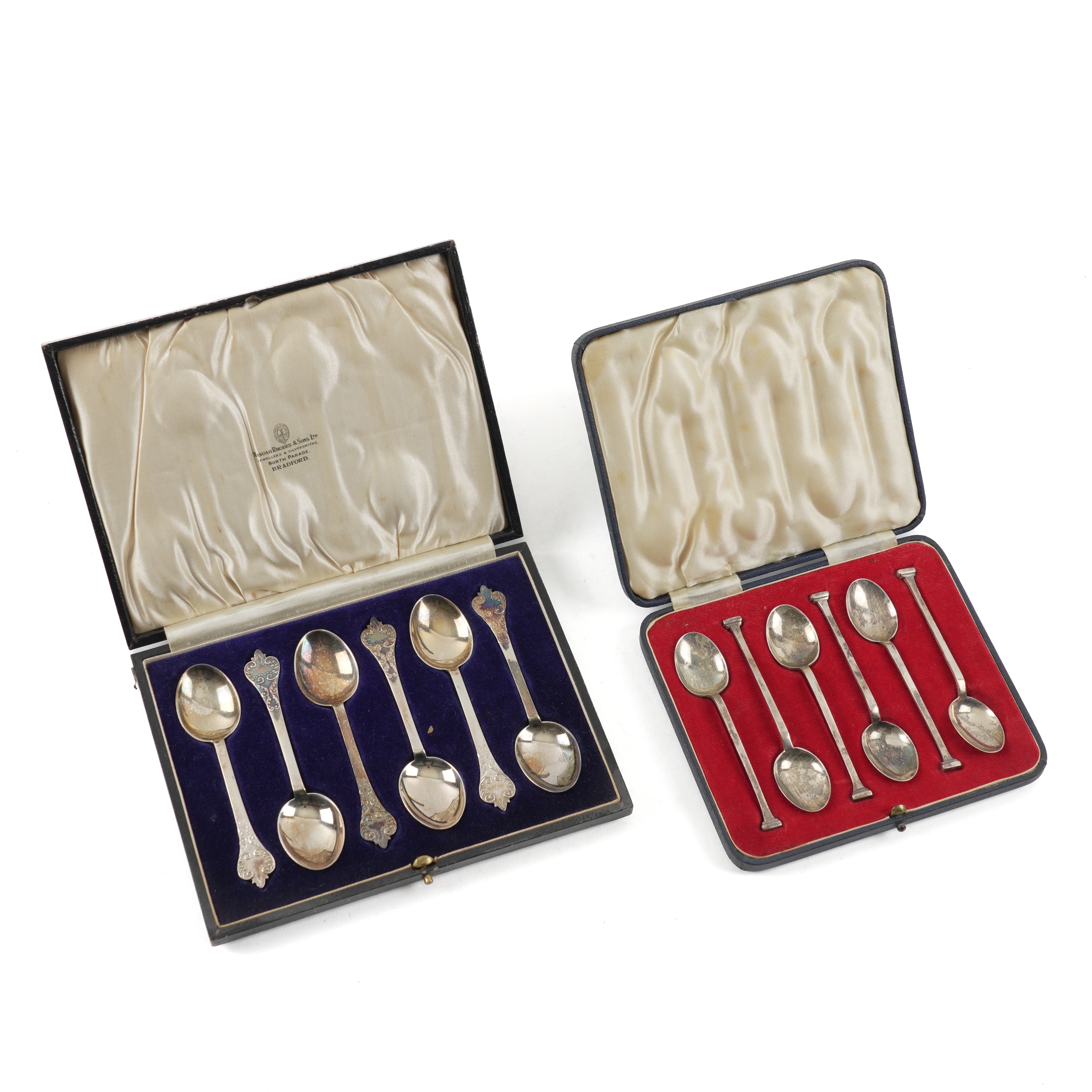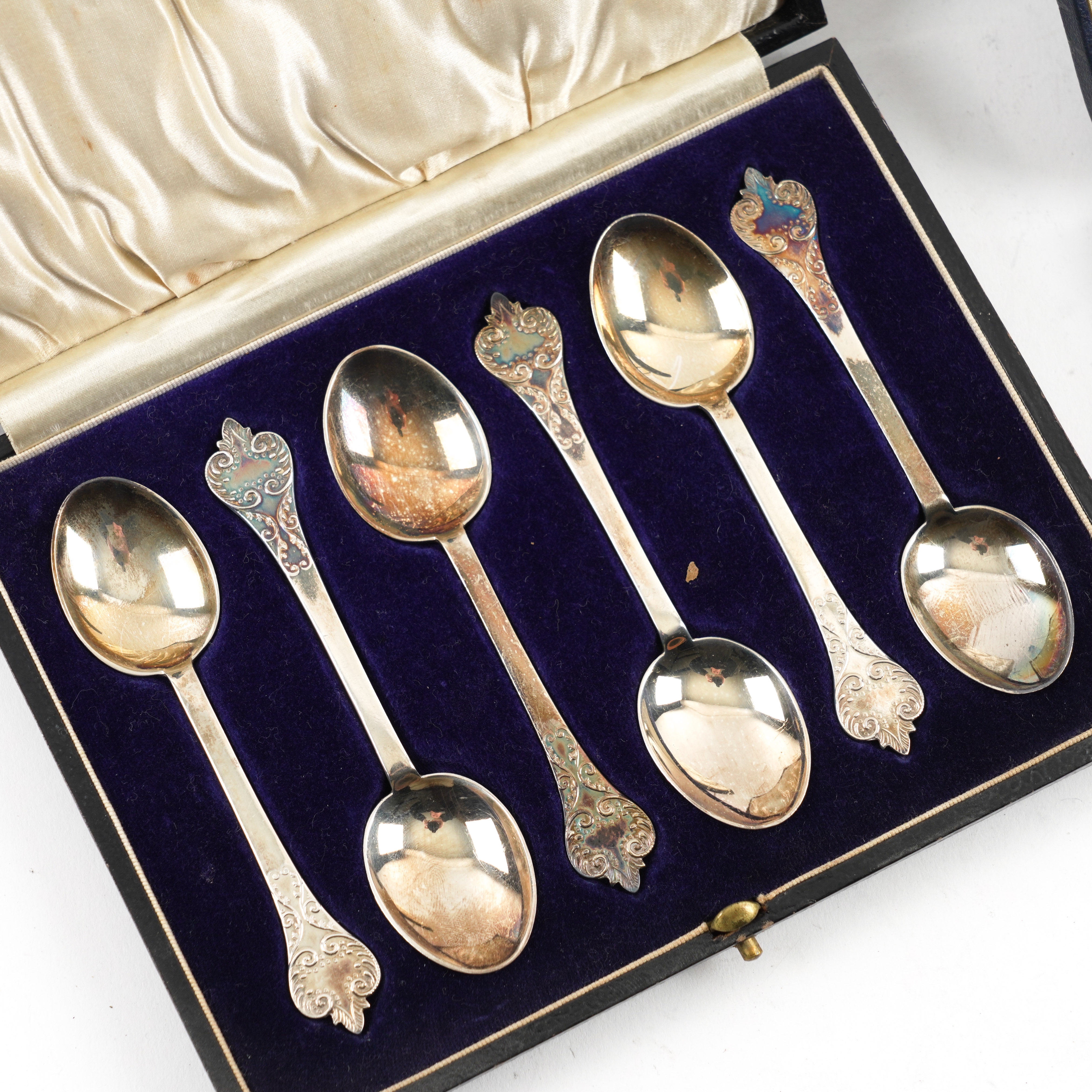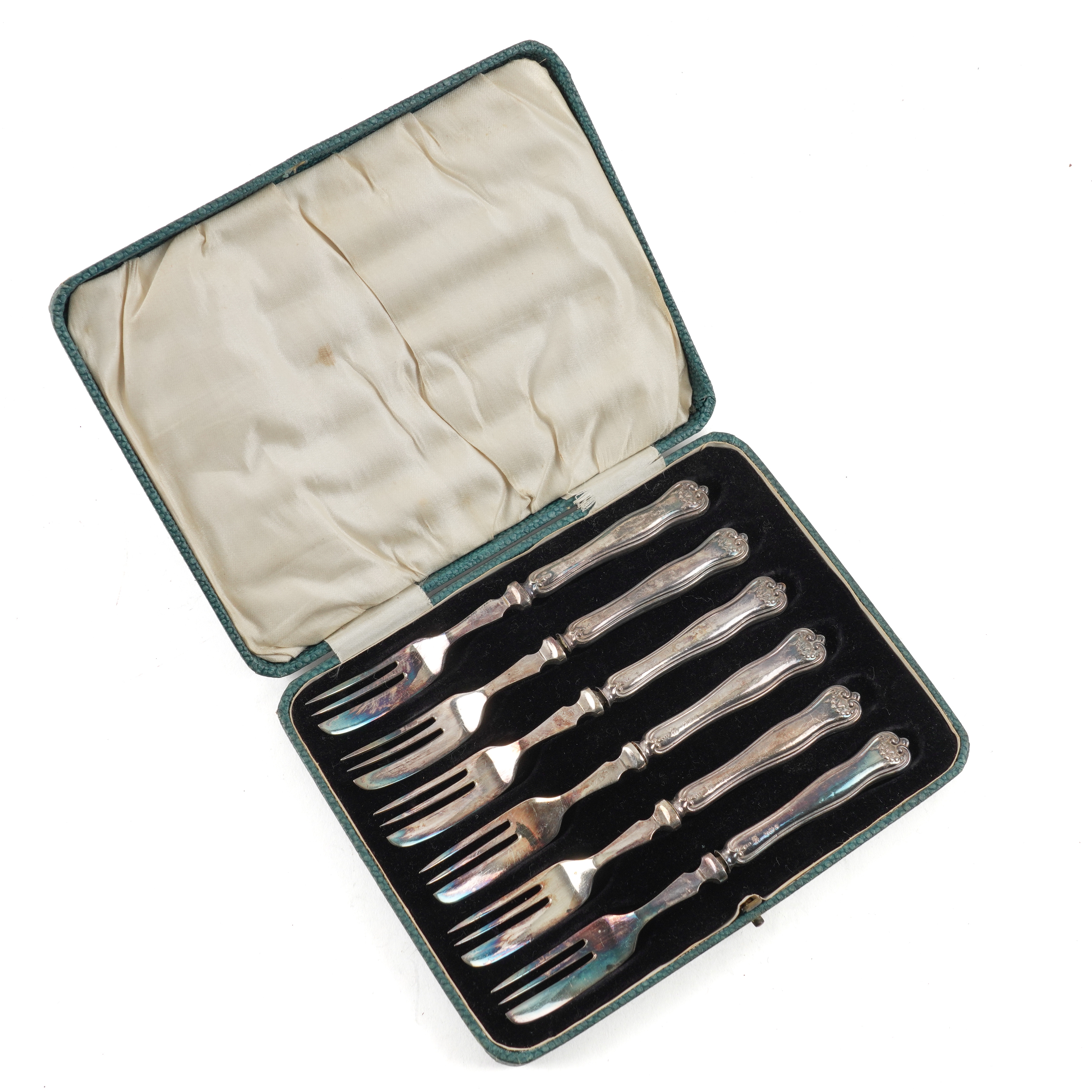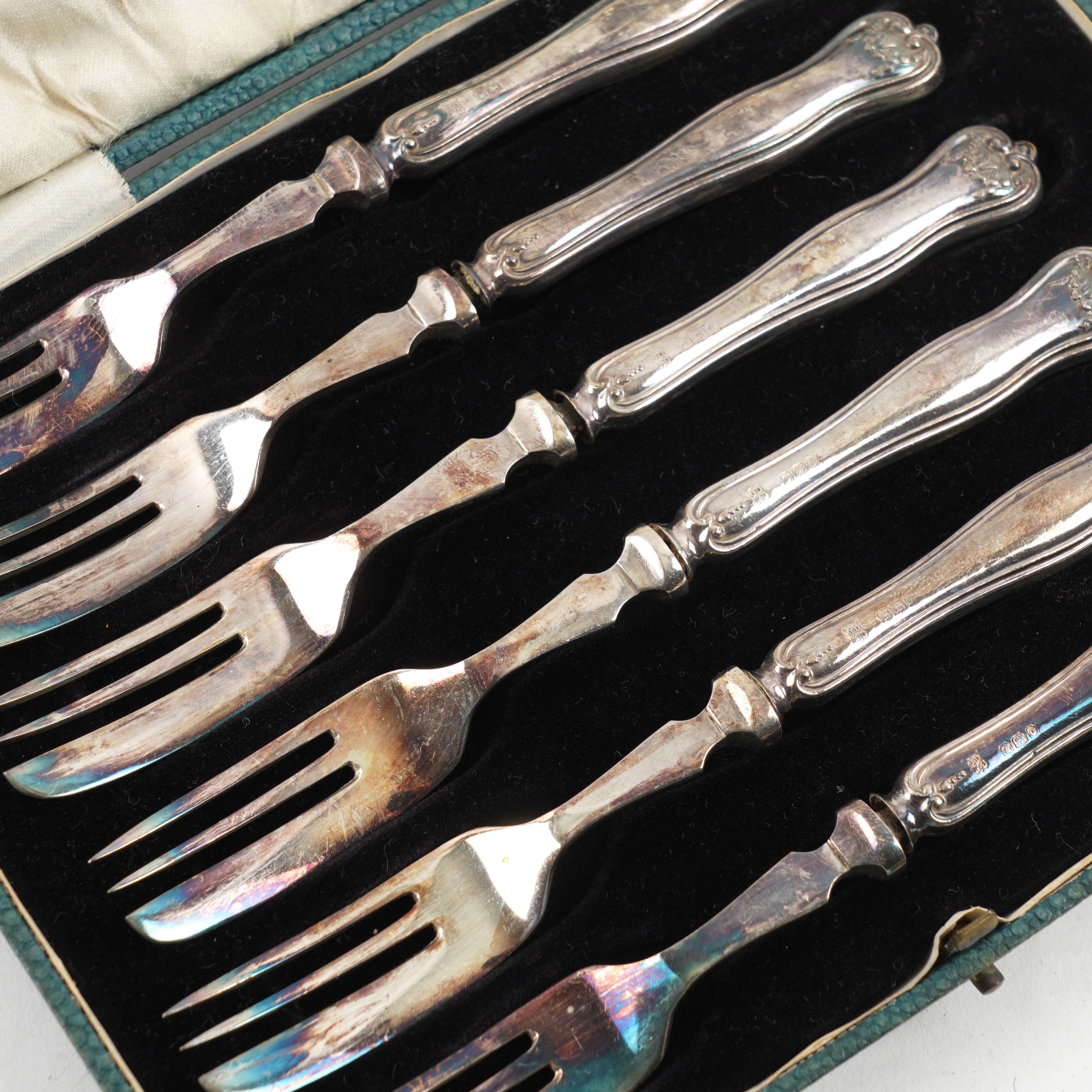 Comprising; a set of six Britannia standard silver teaspoons, with trefid ends to the handles in the 17th century taste, London 1929, a set of six silver coffee spoons, Sheffield 1936, combined weight 138 grams and a set of six pastry forks, having loaded silver handles and with plated prongs, Sheffield 1931