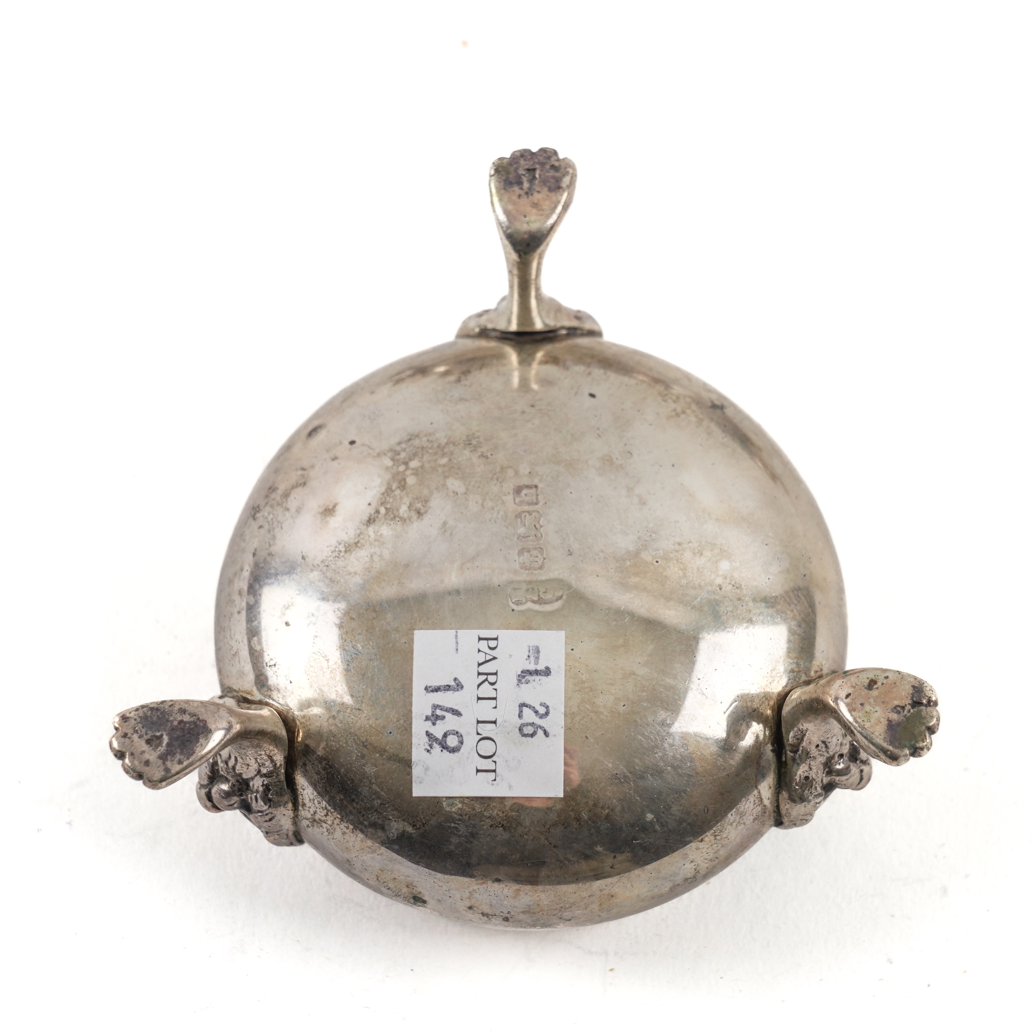 Each of cauldron shaped form, raised on three lion mask and paw feet, Birmingham 1907, combined weight 582 grams, with a case