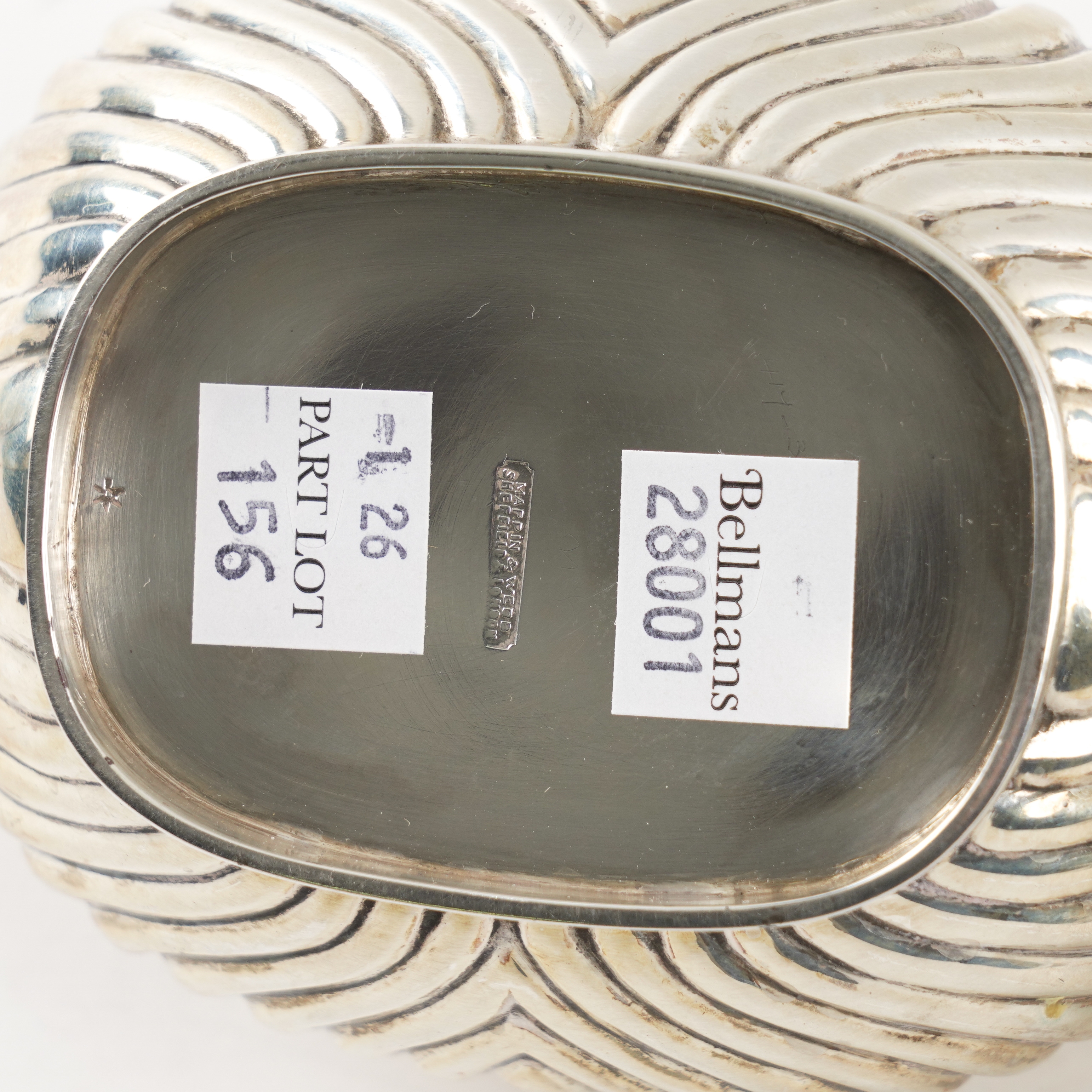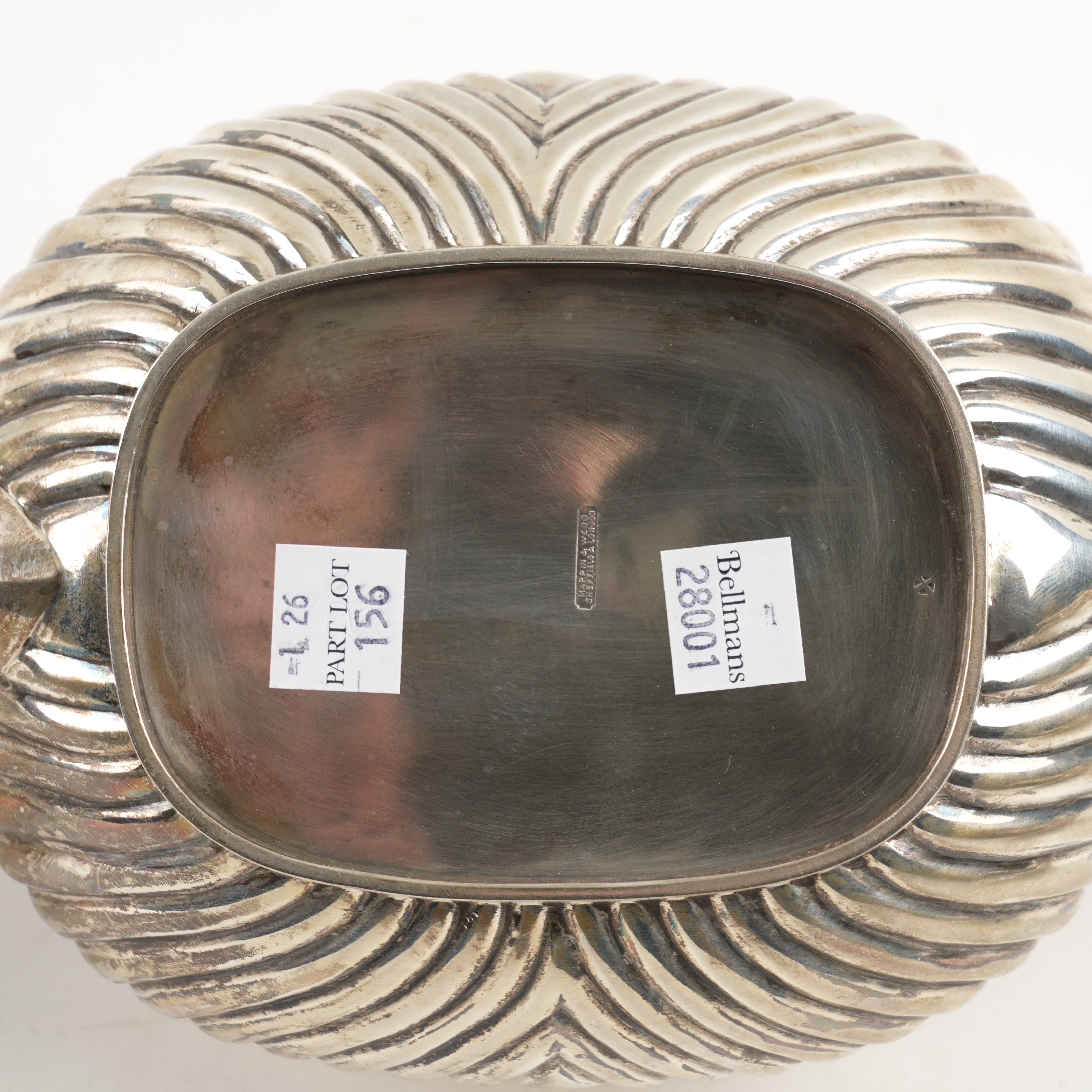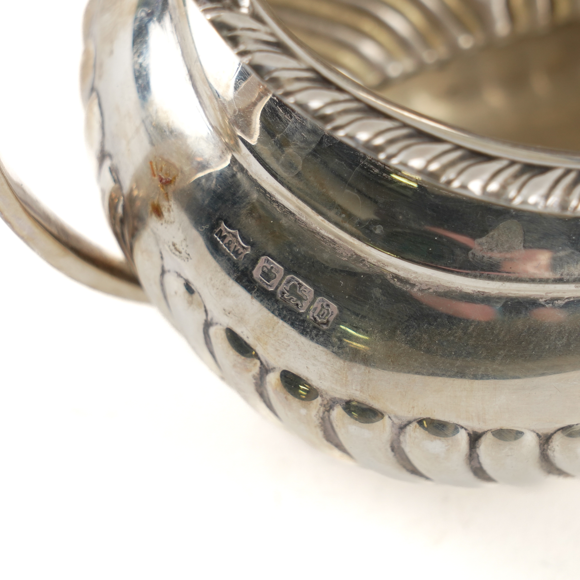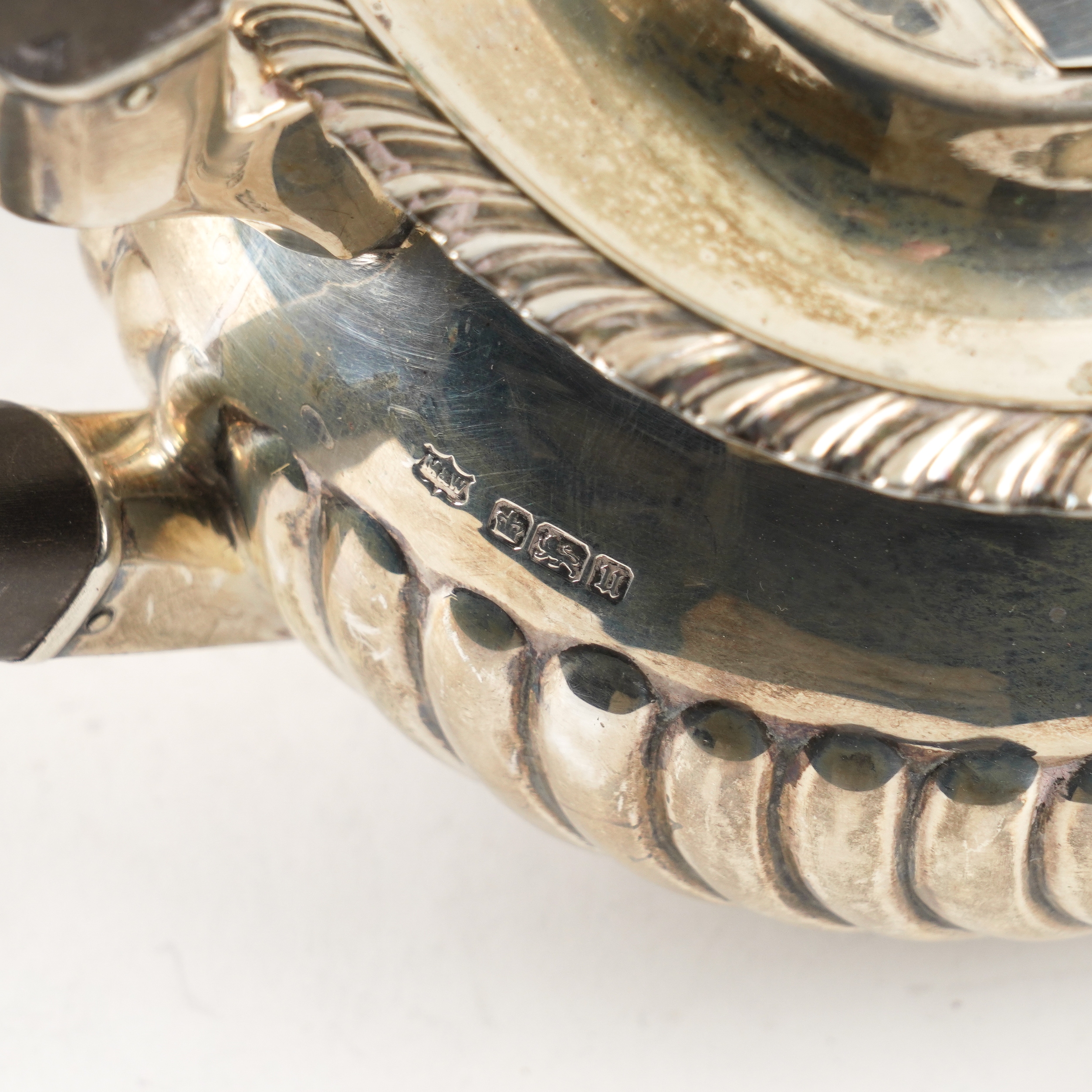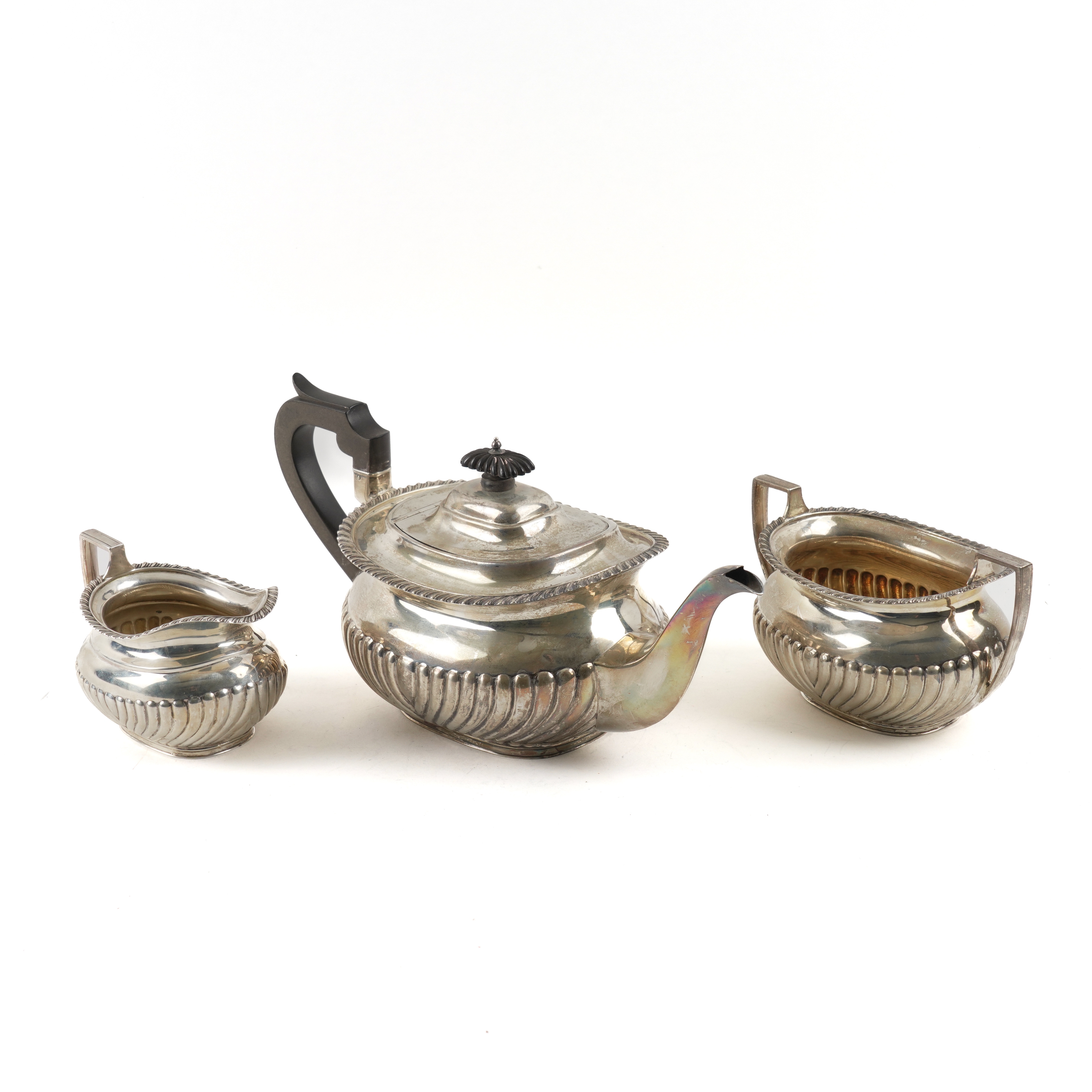 Comprising; a teapot with black fittings, a twin handled sugar bowl and a milk jug, each piece with curved fluted decoration and with a gadrooned rim, Sheffield 1912, combined gross weight 1070 grams