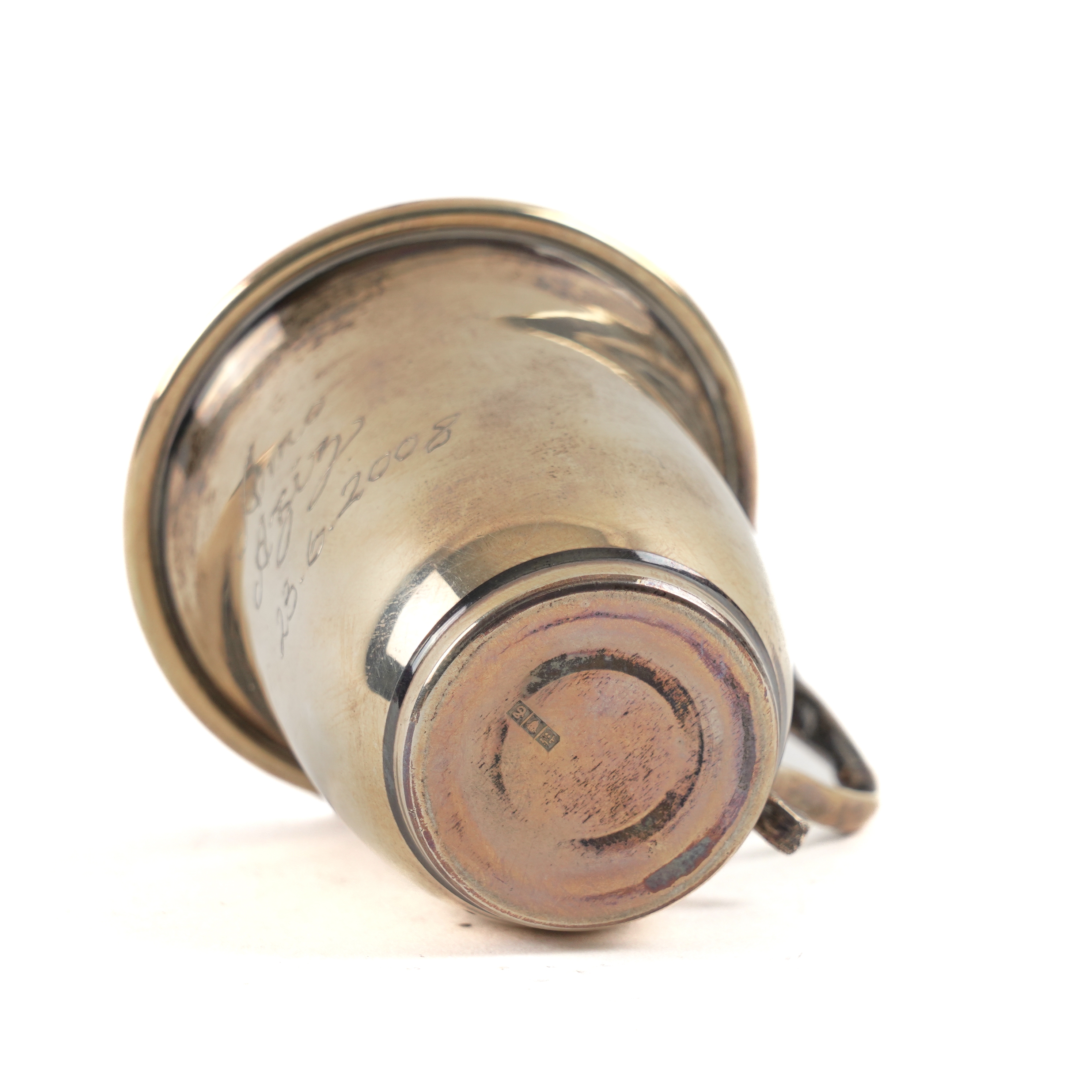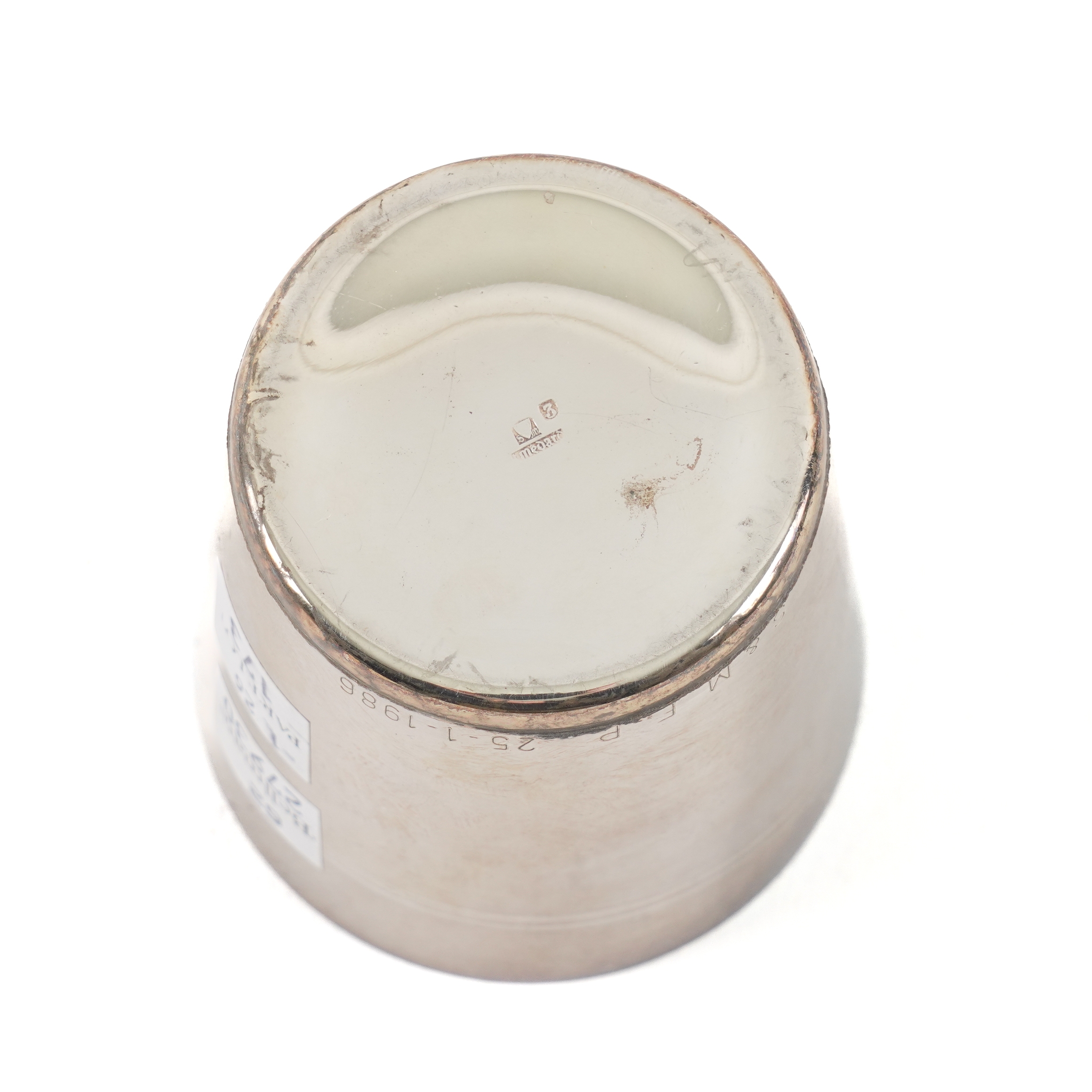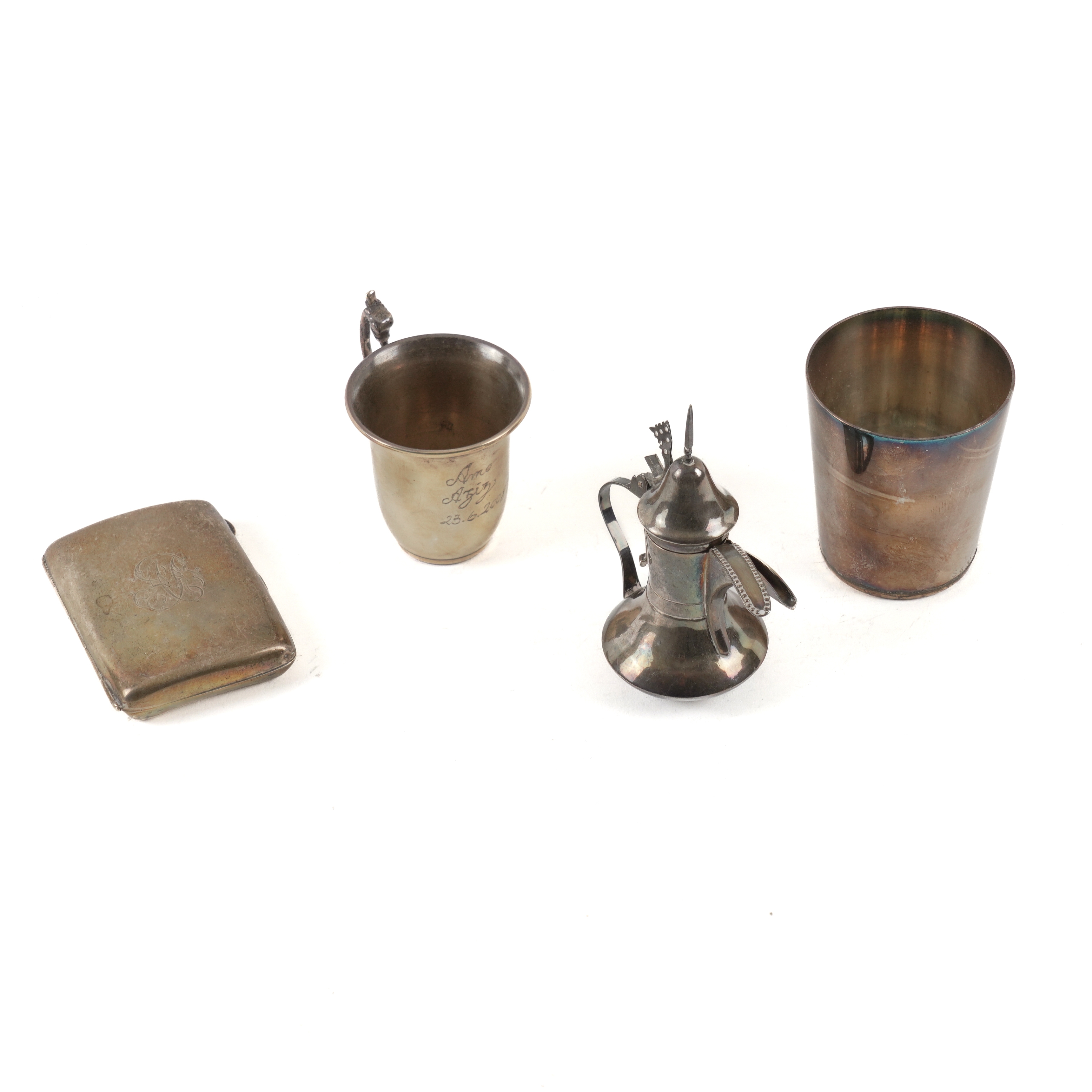 Comprising; a rectangular cigarette case, Birmingham 1916, weight 63 grams, an Egyptian cup, a miniature coffee pot, detailed 925 Silver and a plated tumbler,
