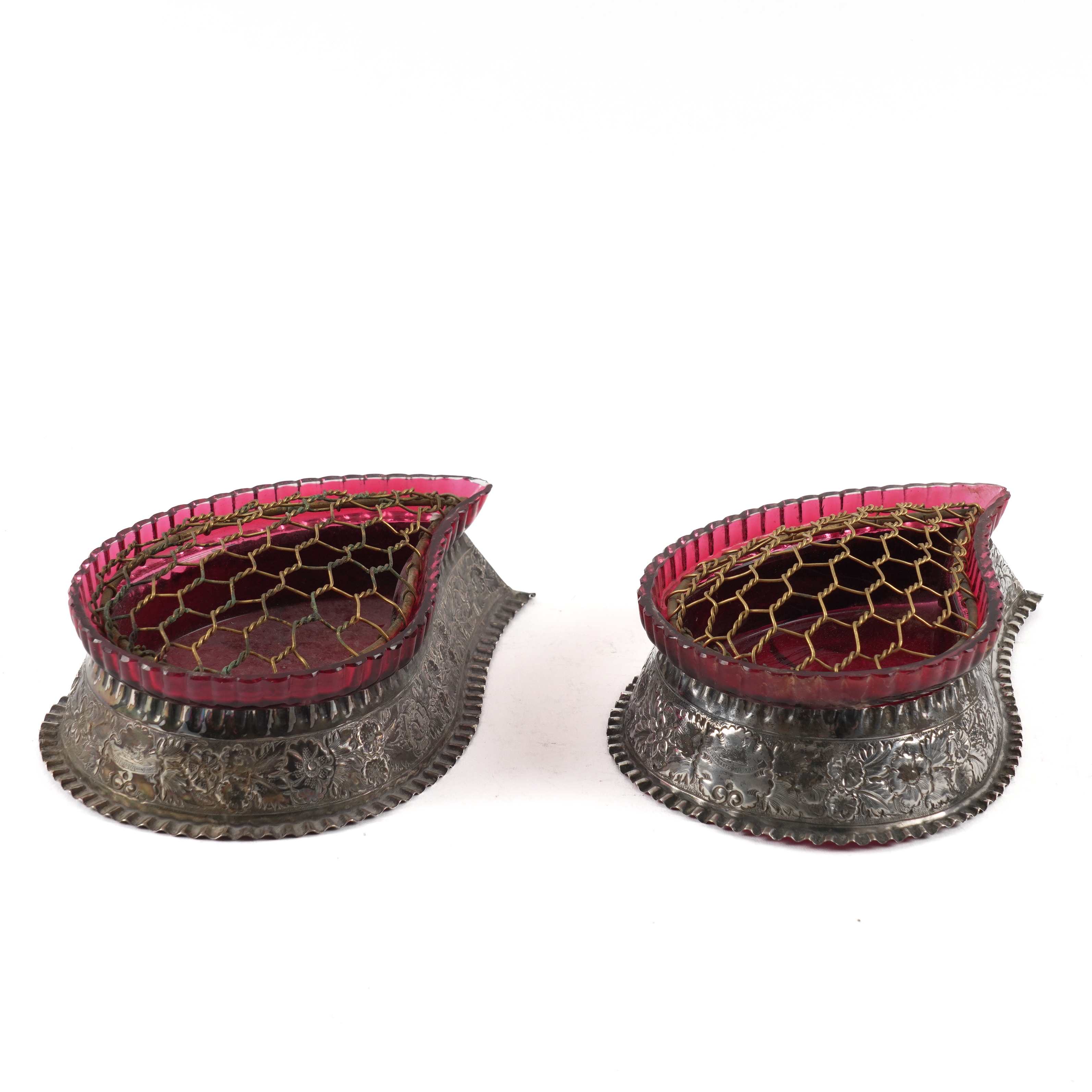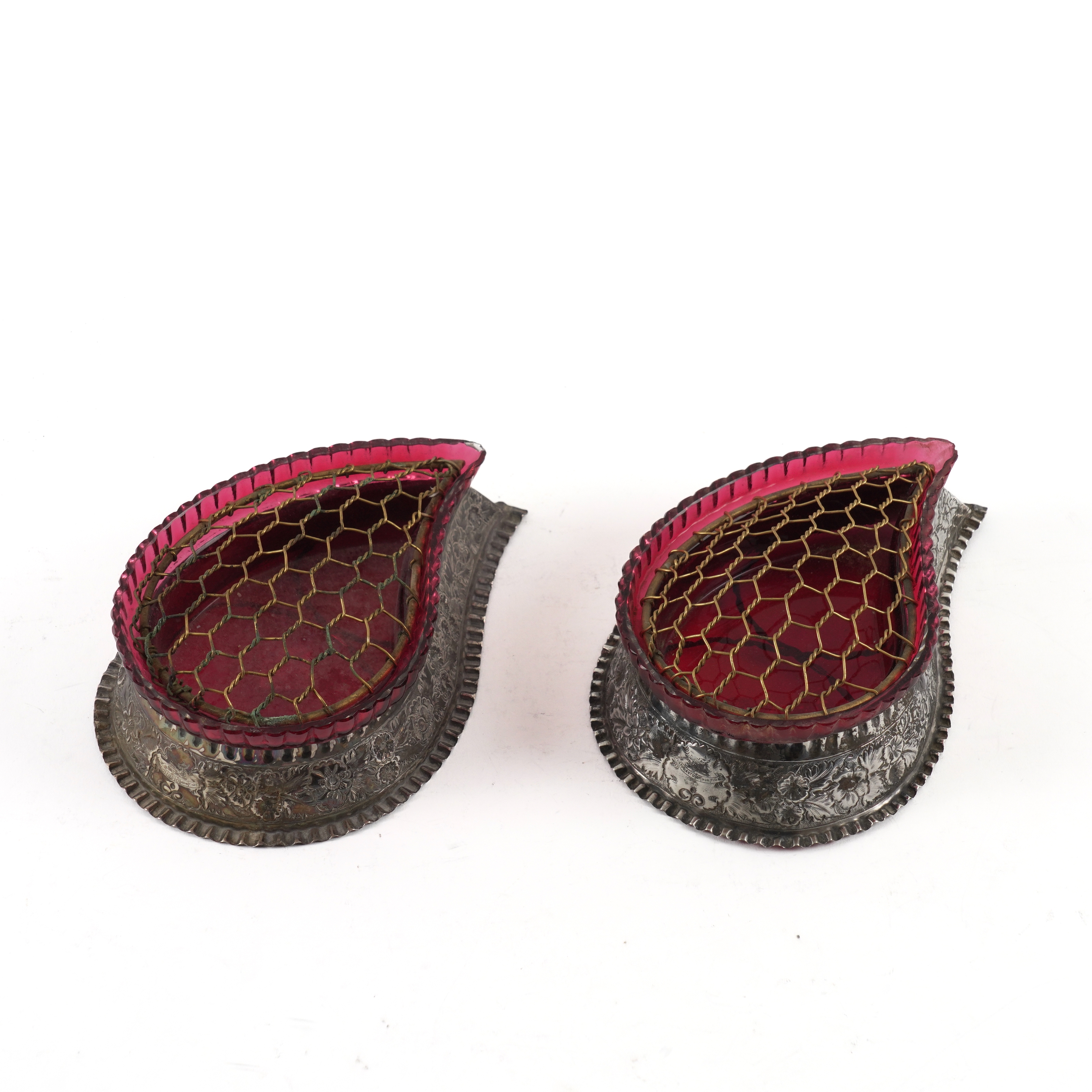 Each of twistover pear shaped form with floral and foliate embossed decoration, Sheffield 1894, weight 135 grams, with cranberry coloured glass drop-in liners and with gilt wirework grilles to fit to the tops