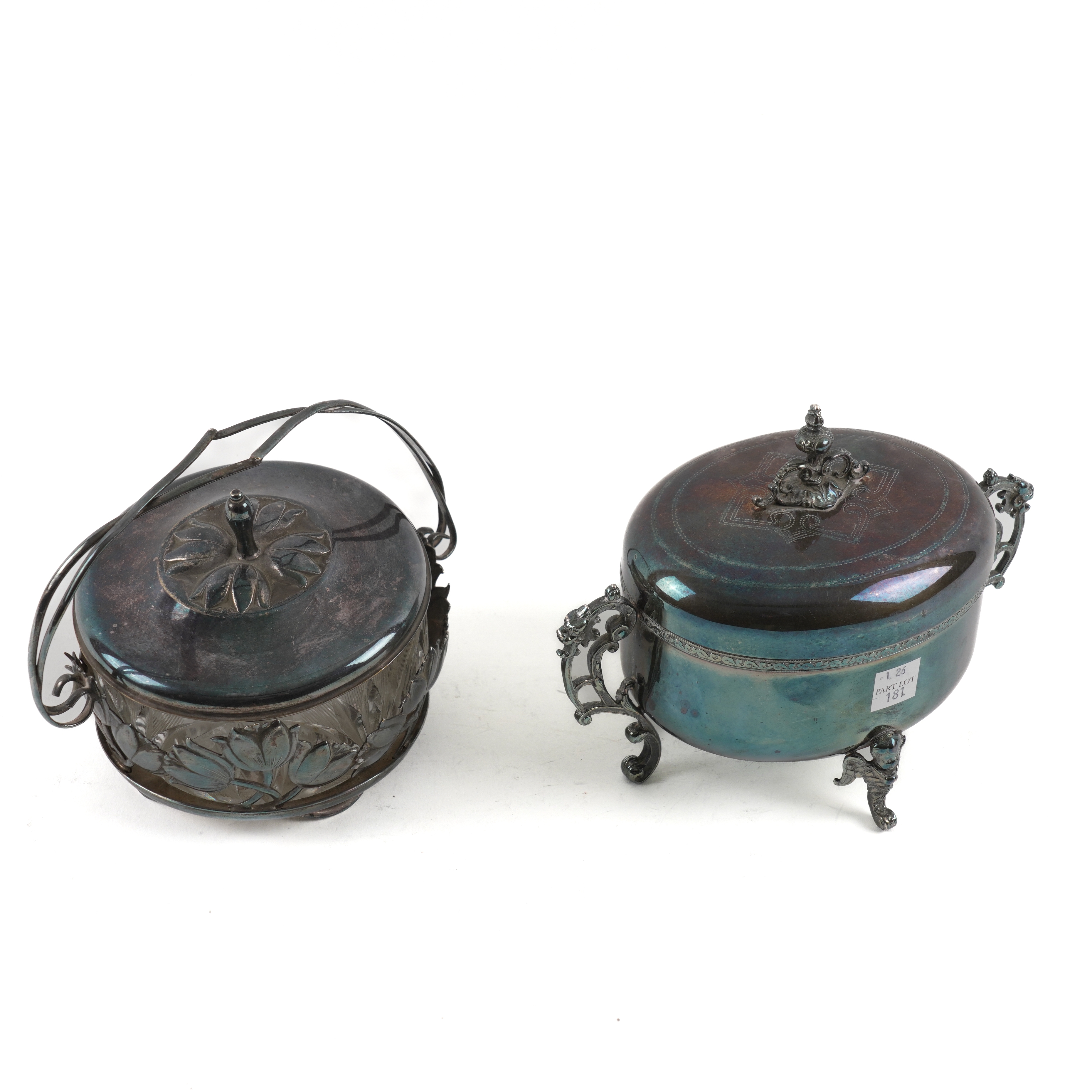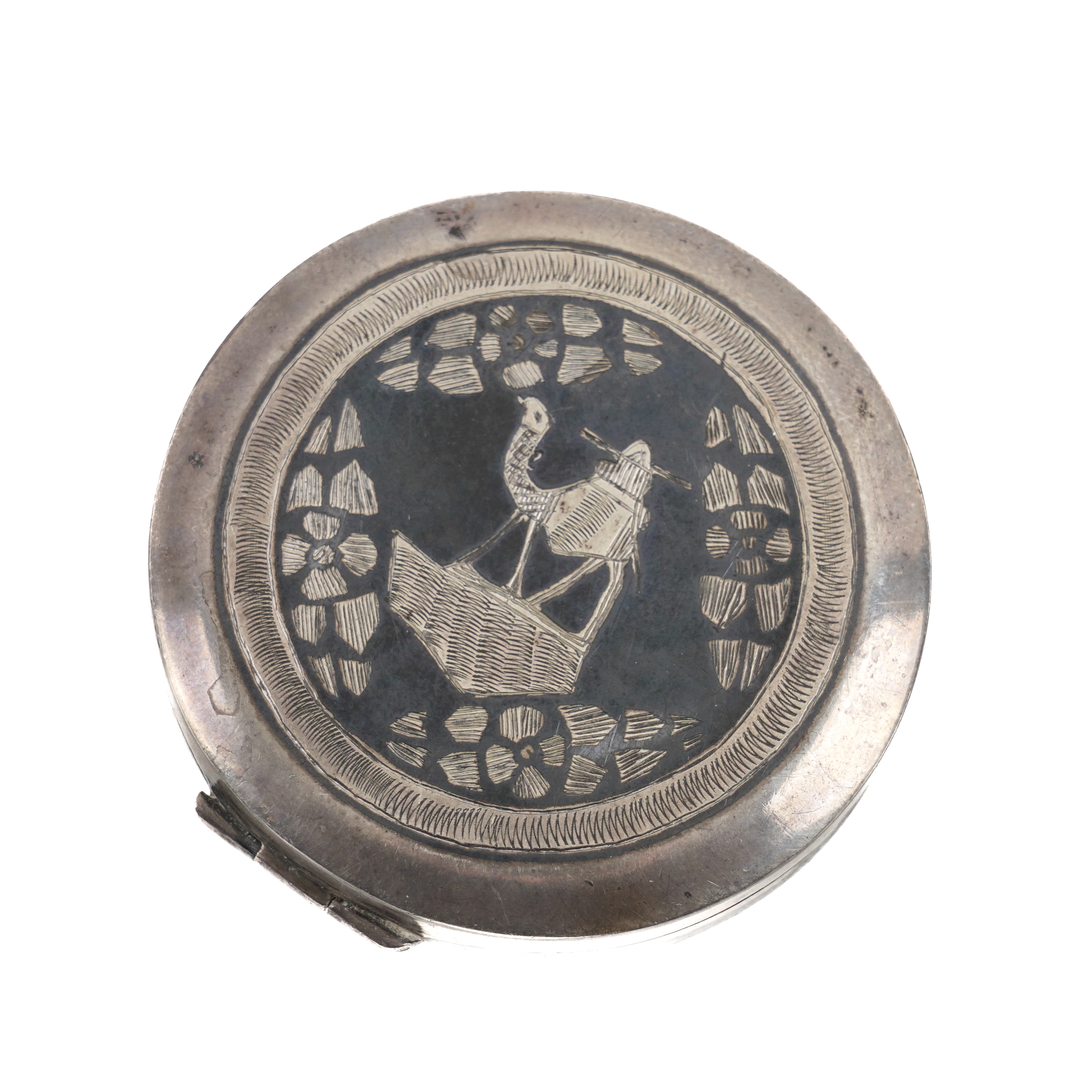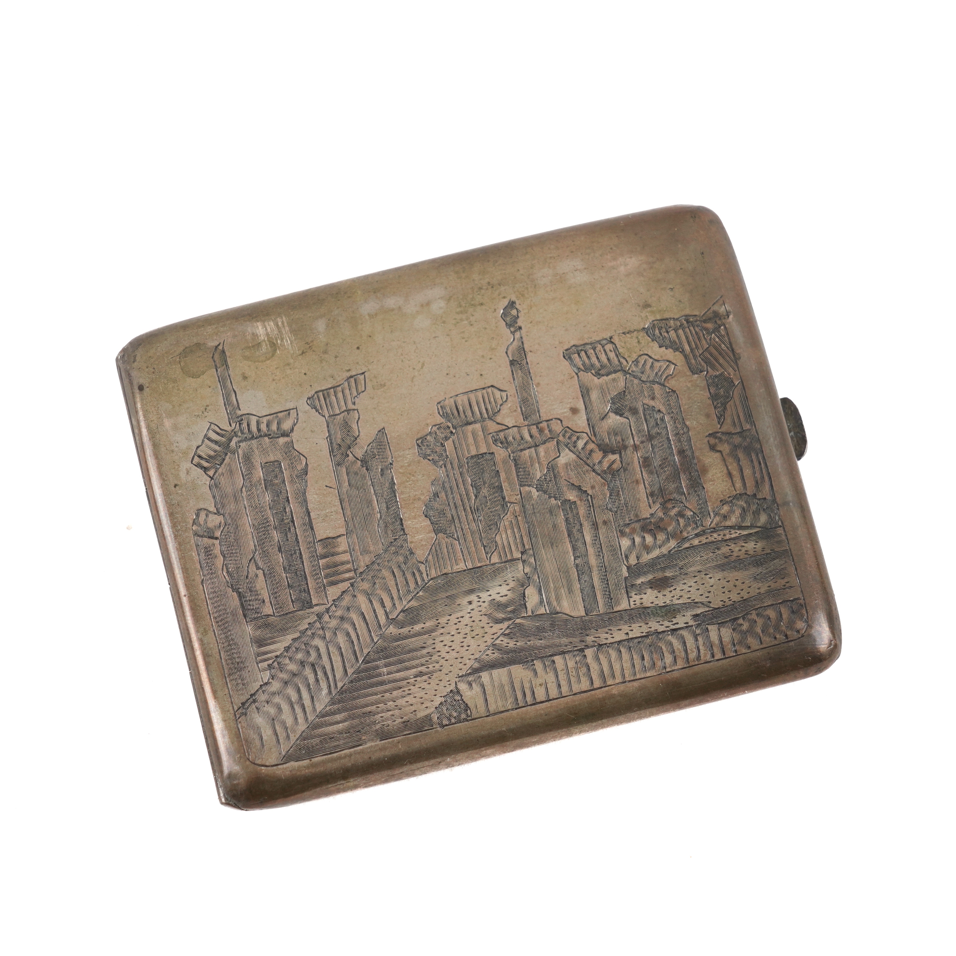 The foreign wares comprising; a rectangular hinge lidded box, a rectangular cigarette case, an Egyptian compact, a smaller compact, the niello decoration depicting a camel and a cigarette holder, also a plated twin handled oval hinge lidded tea caddy and a plated preserve stand, pierced with floral decoration, with a glass liner and a lid