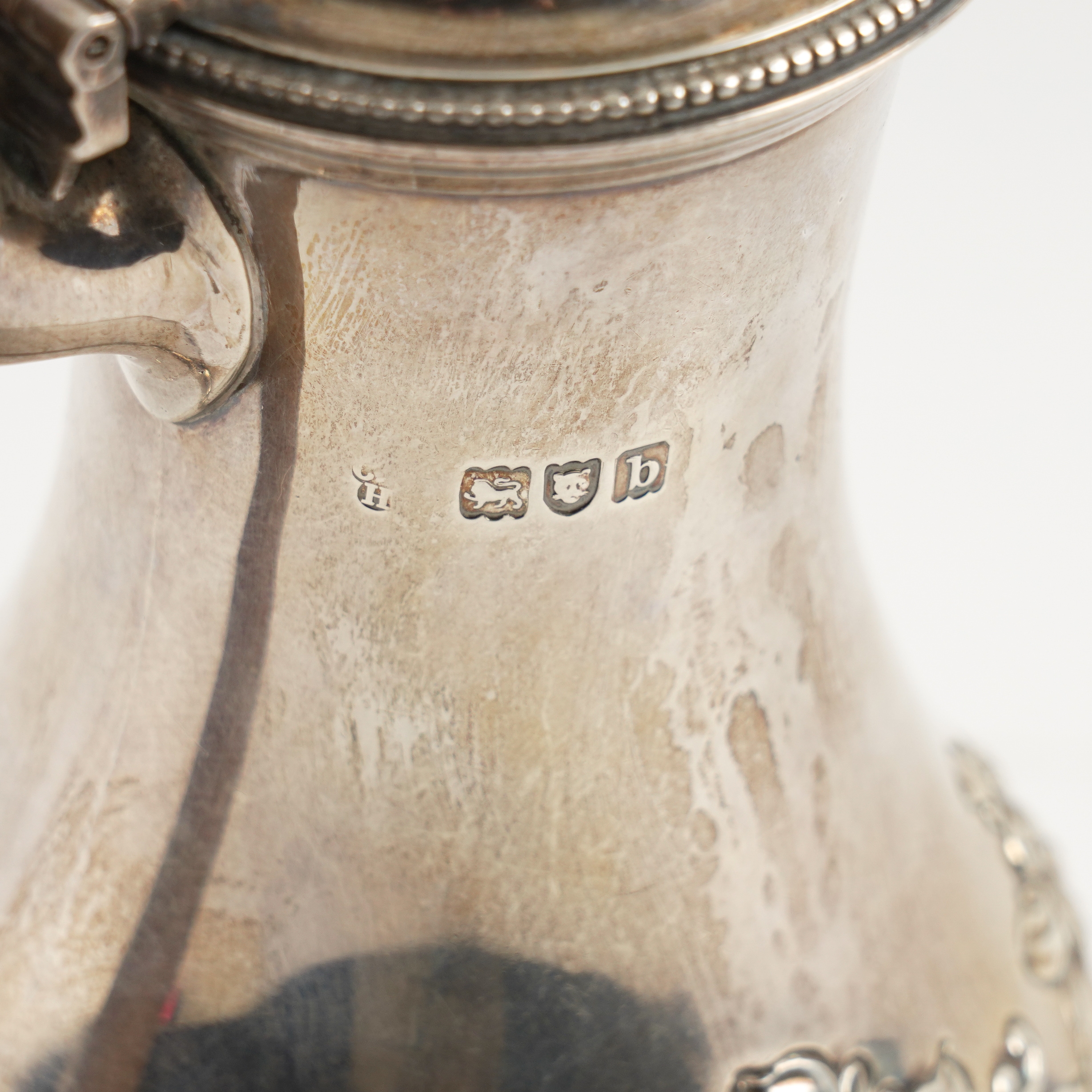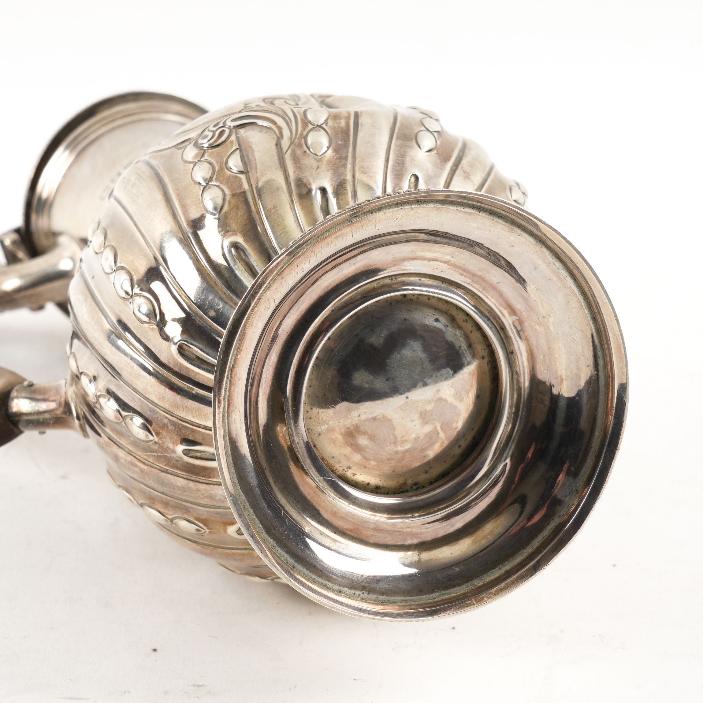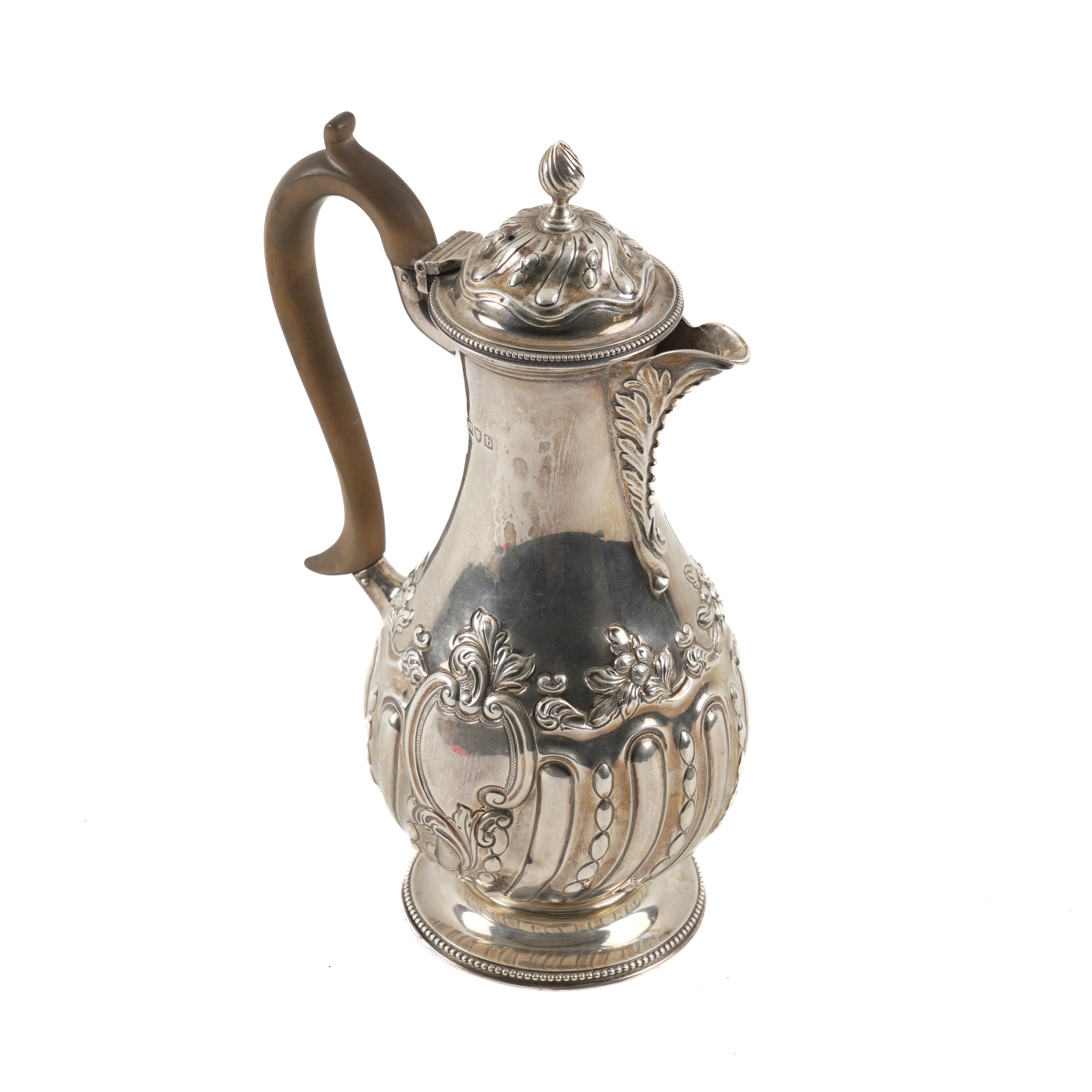 The body embossed with floral and foliate sprays and spiral fluting, with a wooden handle, London 1897, gross weight 405 grams