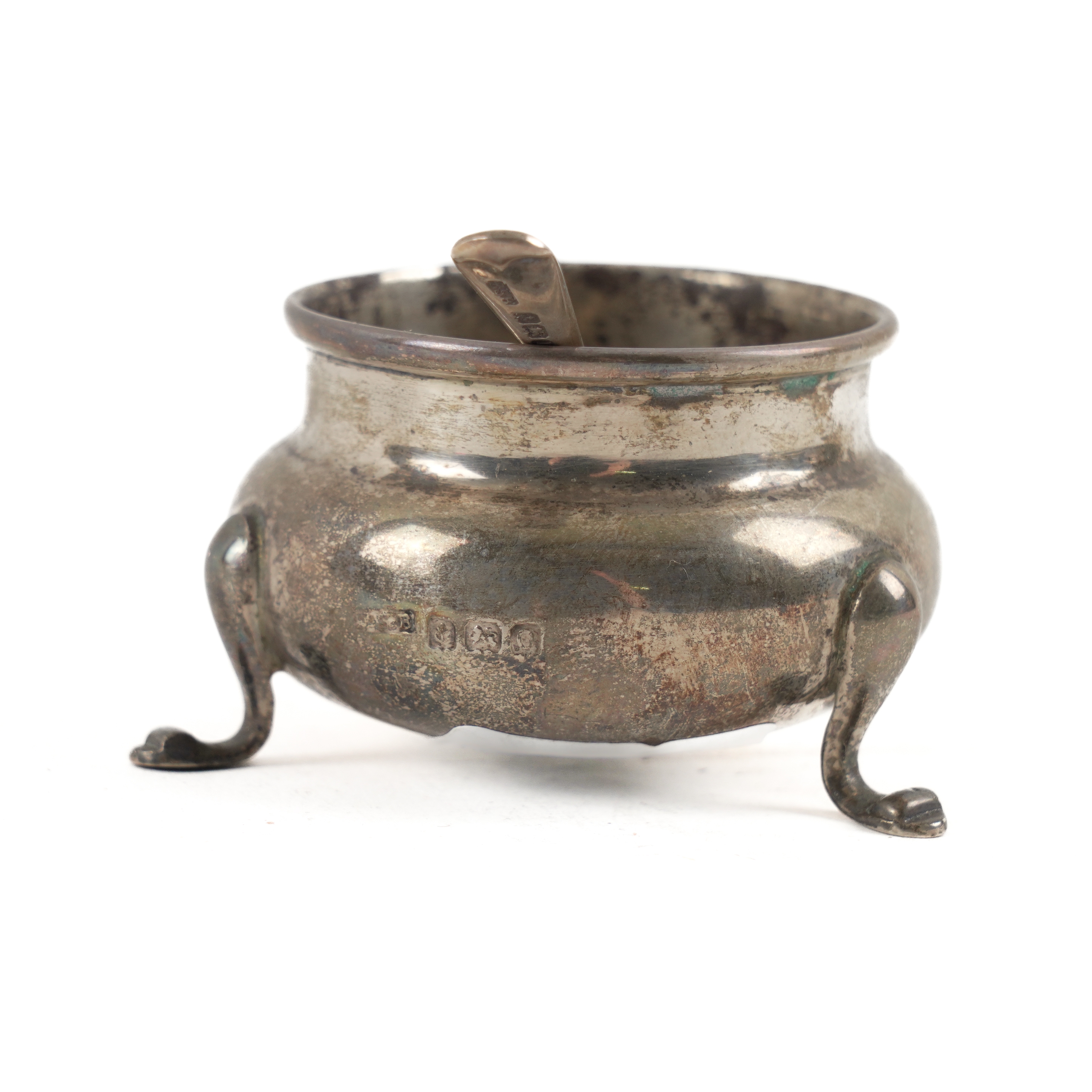 Each salt of cauldron shaped form, raised on three feet, Birmingham 1938, the salt spoons of mixed dates, with a case, combined weight 110 grams