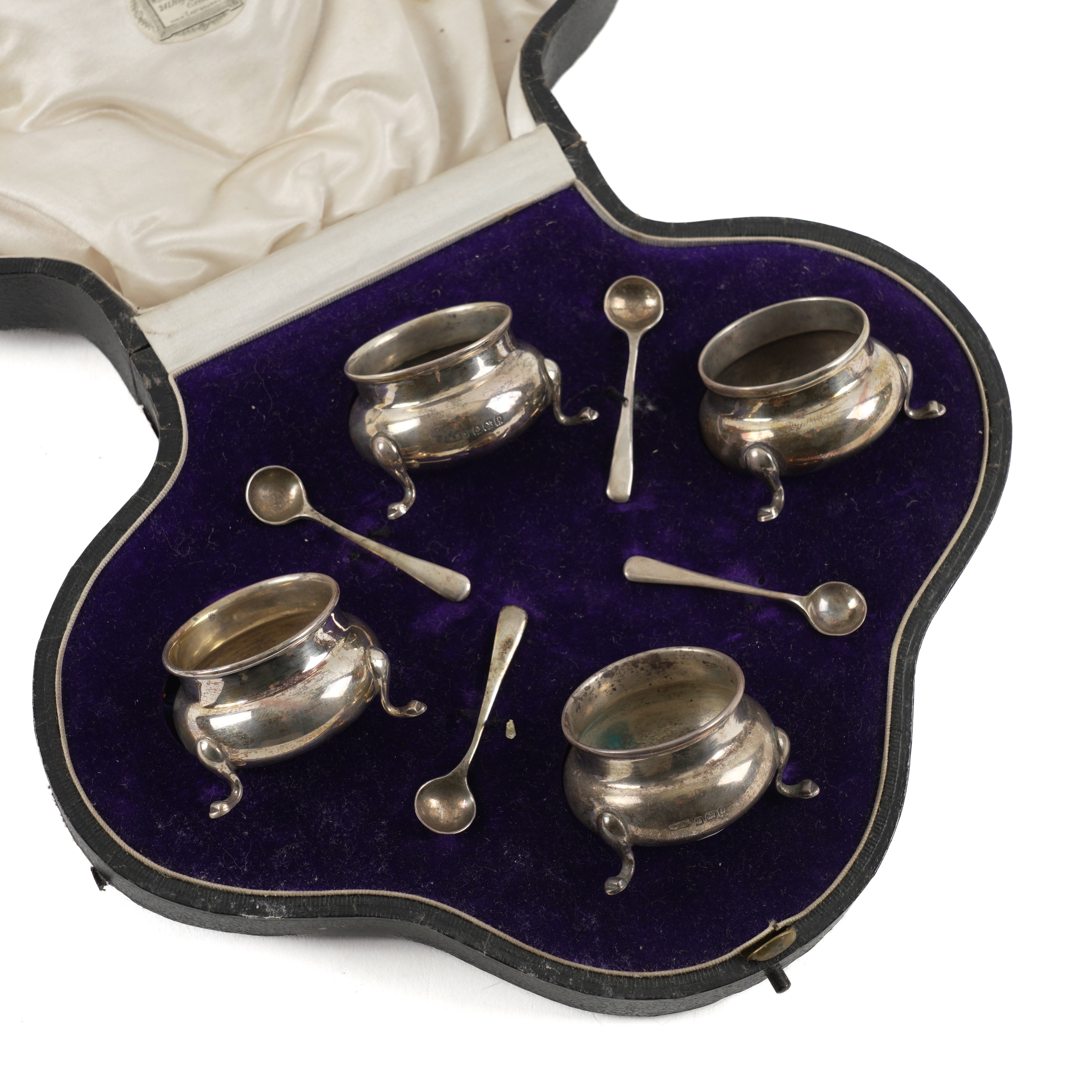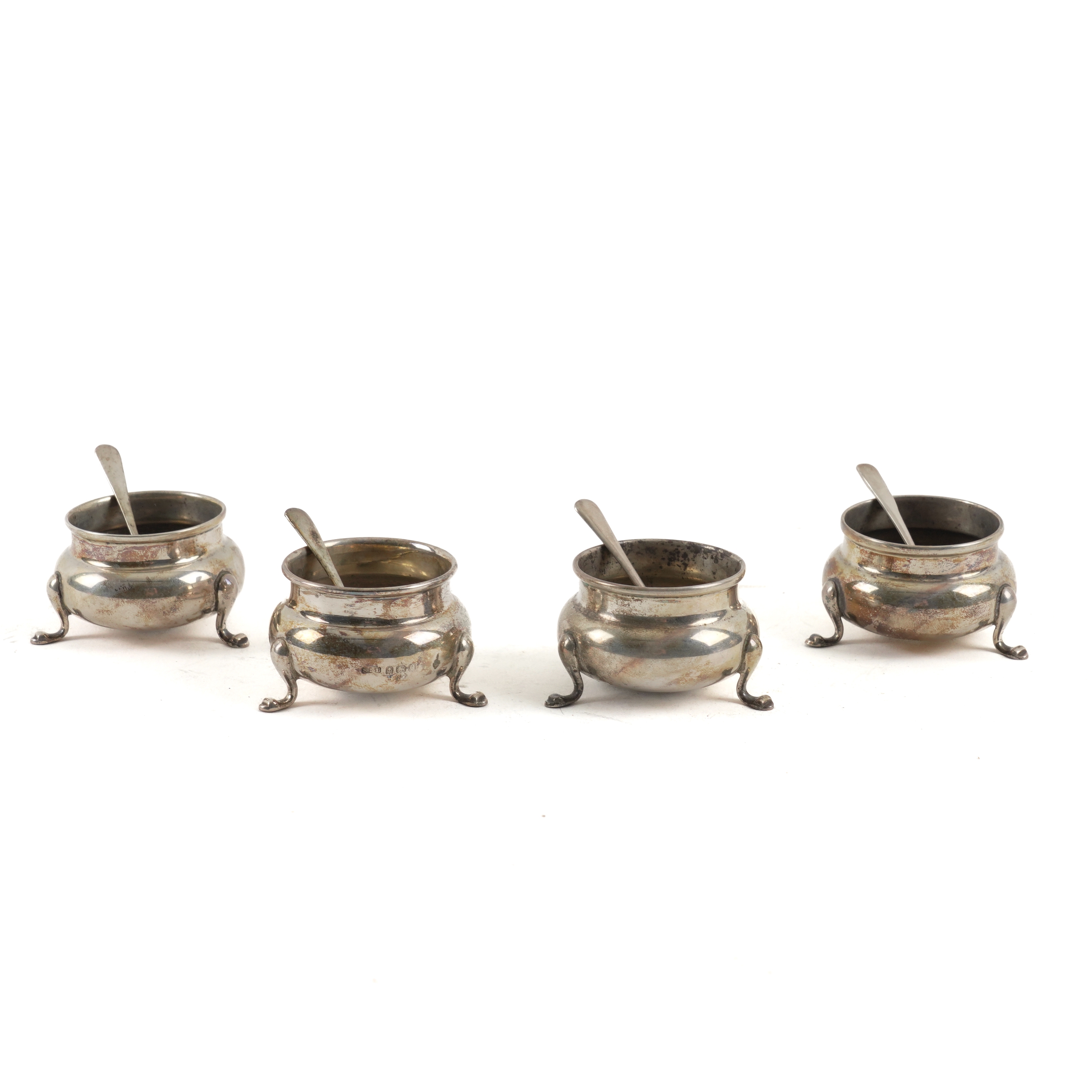 A SET OF FOUR SILVER SALTS AND FOUR ASSOCIATED SILVER SALT SPOONS