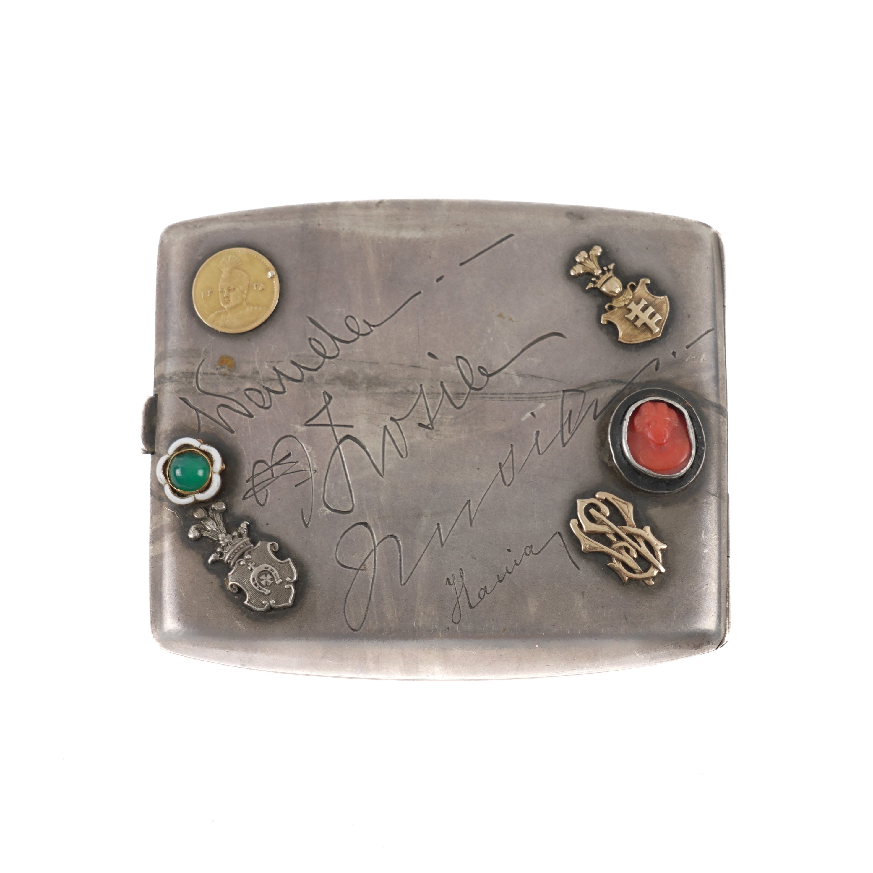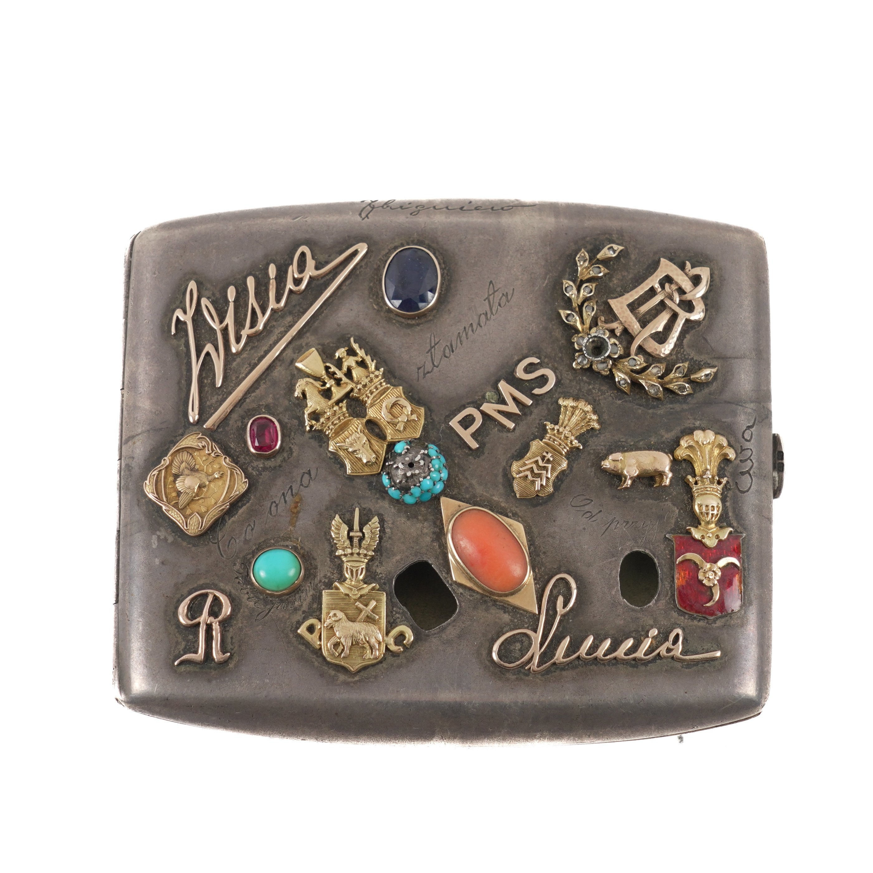 The exterior applied with a variety of mostly gold and gem set fittings, to include an Iranian gold 2000 dinars (one fifth Toman), stick pin finials, initials, names, a coral cameo, a sapphire, a turquoise and further fittings, two fittings lacking, also with facsimile engraved wording, detailed in the interior 900 JL, gross weight 128 grams, probably Polish