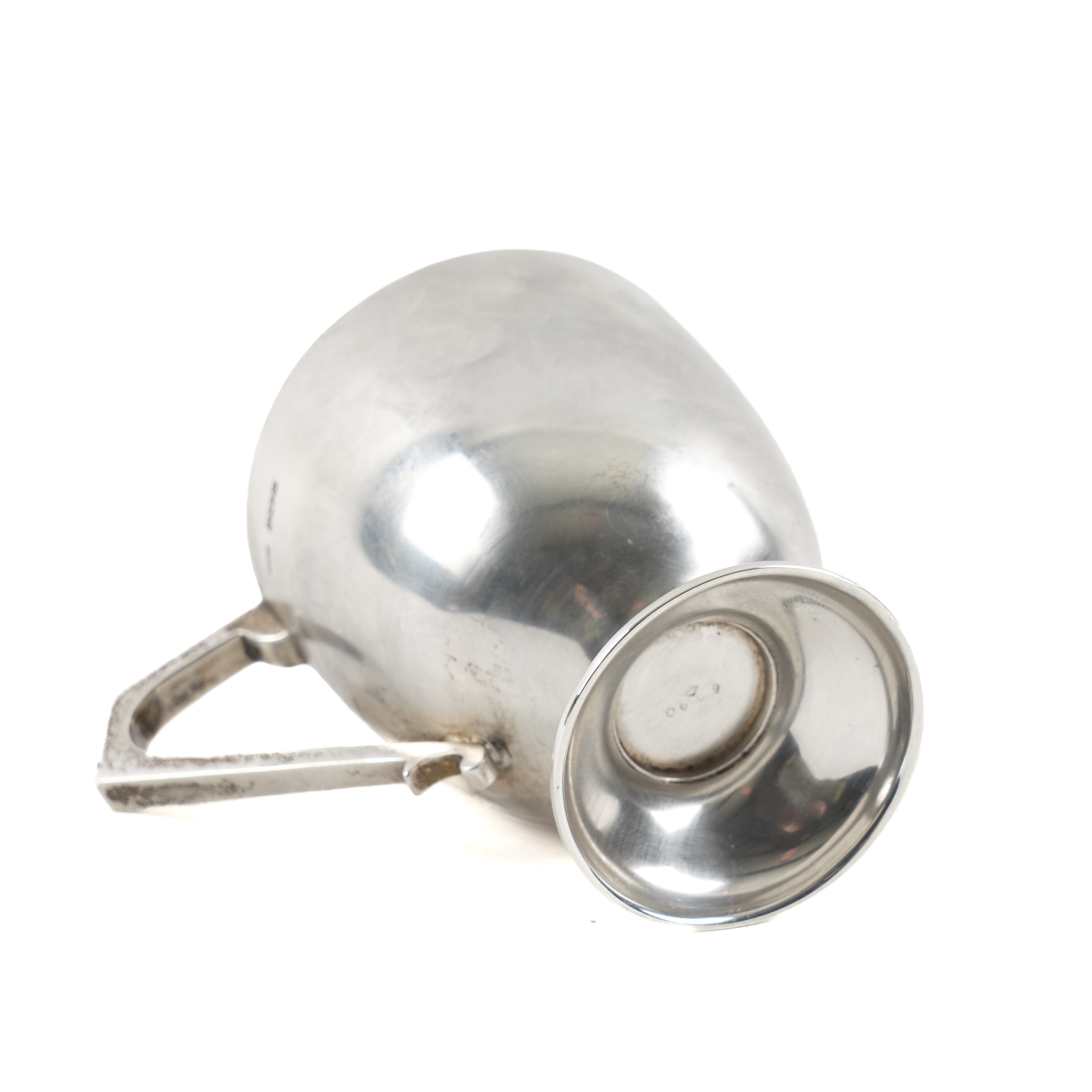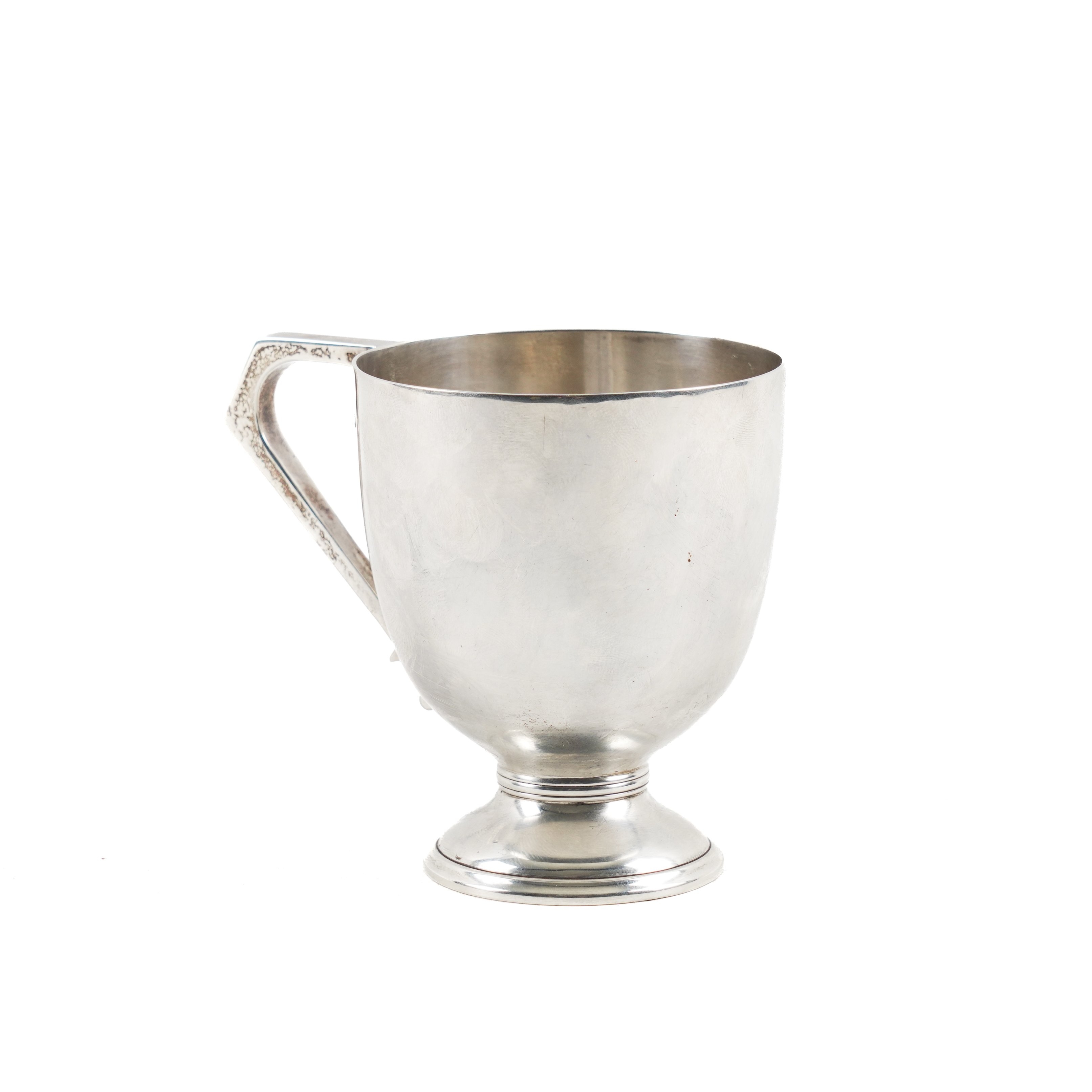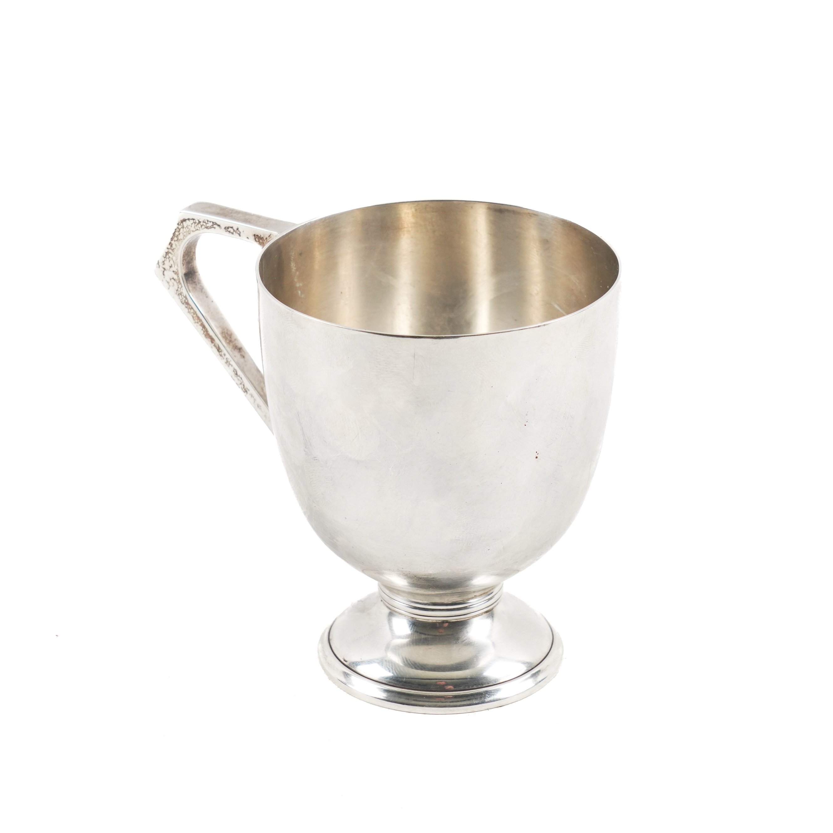 Having an angular handle, plain, unengraved, raised on a circular foot, height 9.3cm, Sheffield 1912, weight 174 grams