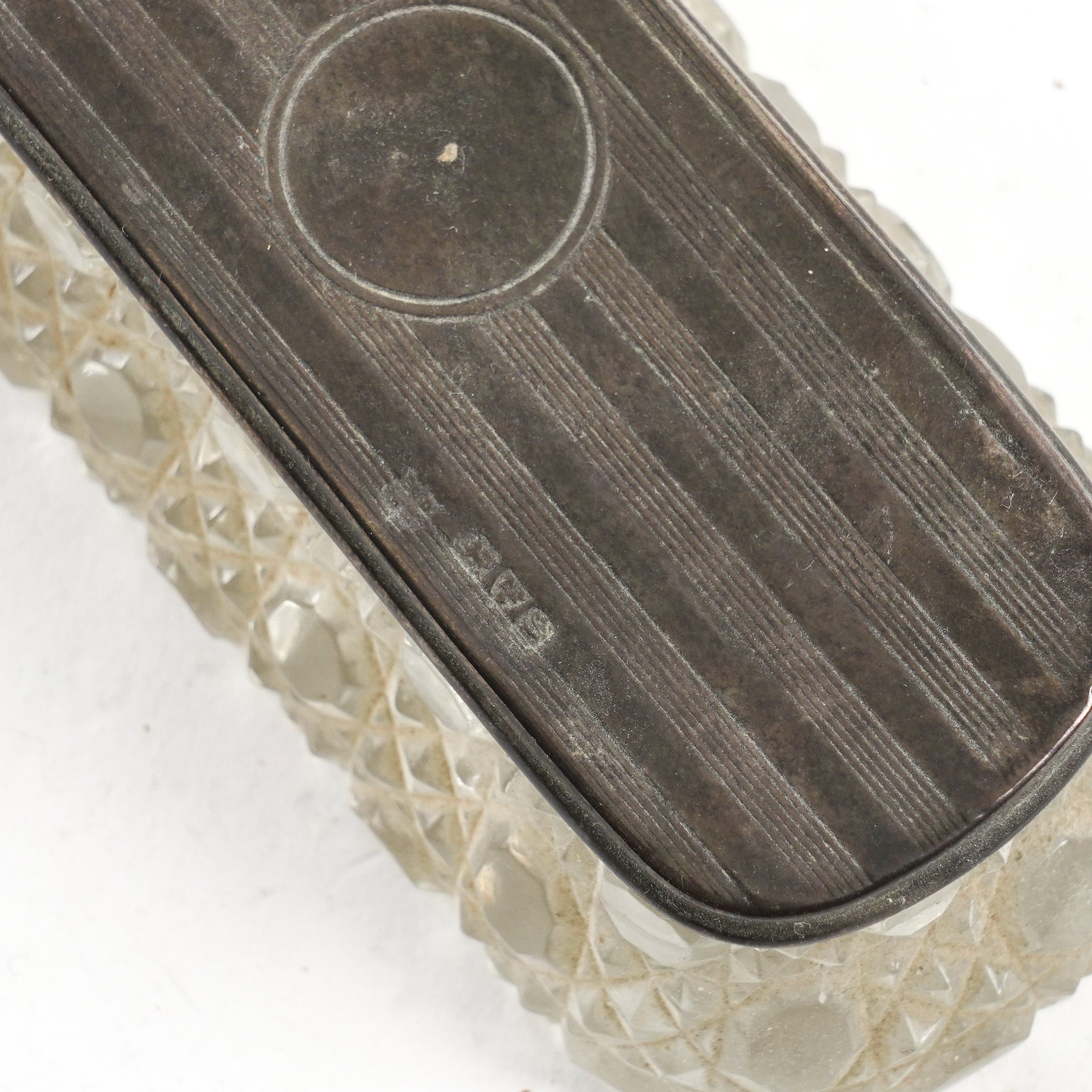 The silver mounted items, comprising; a scent bottle, two rectangular hair pin boxes, a smelling salts bottle and a cylindrical jar, various dates, including Chester 1904 and Chester 1921, weight of three lids 39 grams