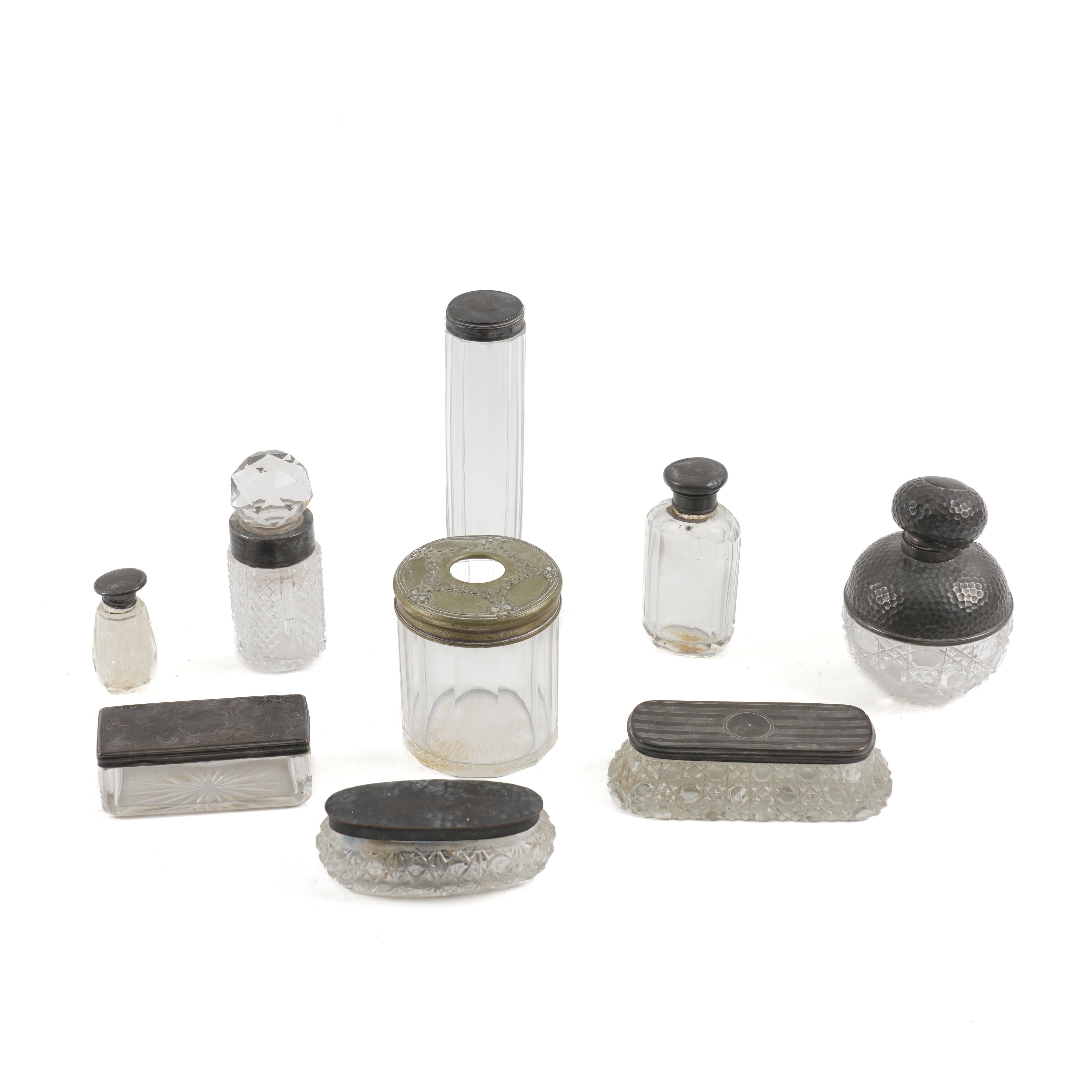 FIVE SILVER MOUNTED GLASS TOILET BOTTLES AND CONTAINERS AND FOUR FURTHER ITEMS (9)