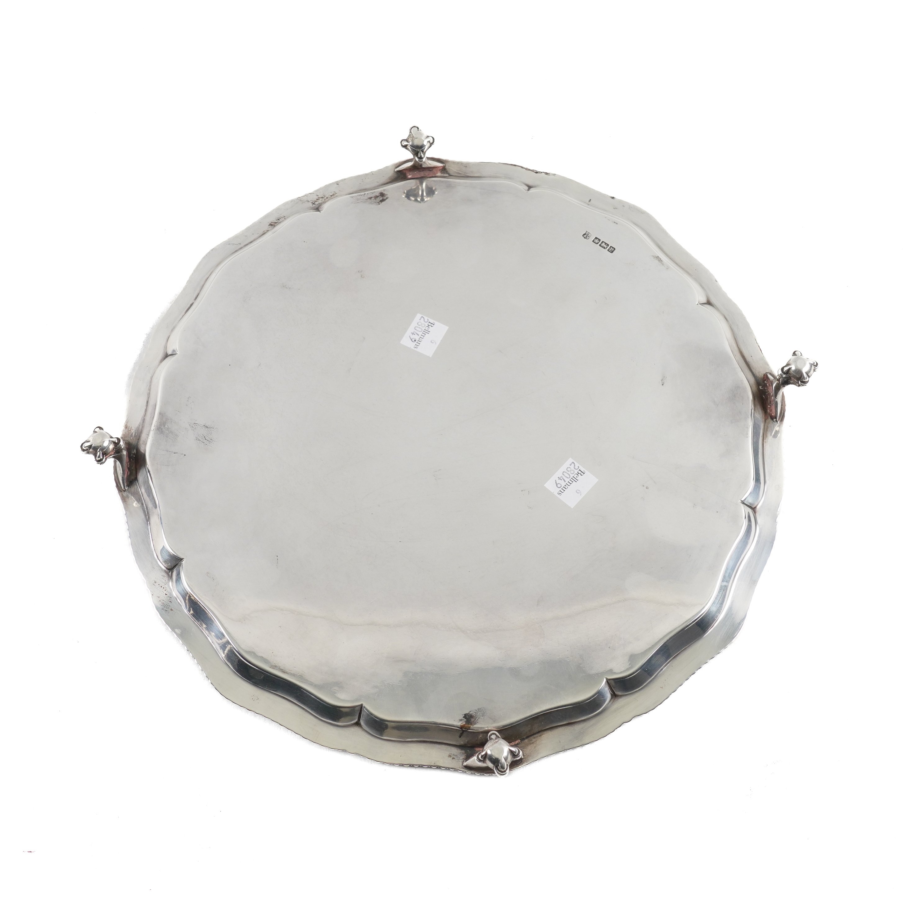 The shaped pie-crust rim having a gadrooned border, raised on four ball and claw feet, diameter 30.8cm, Sheffield 1916, maker Thomas Bradbury & Sons Ltd, weight 874 grams