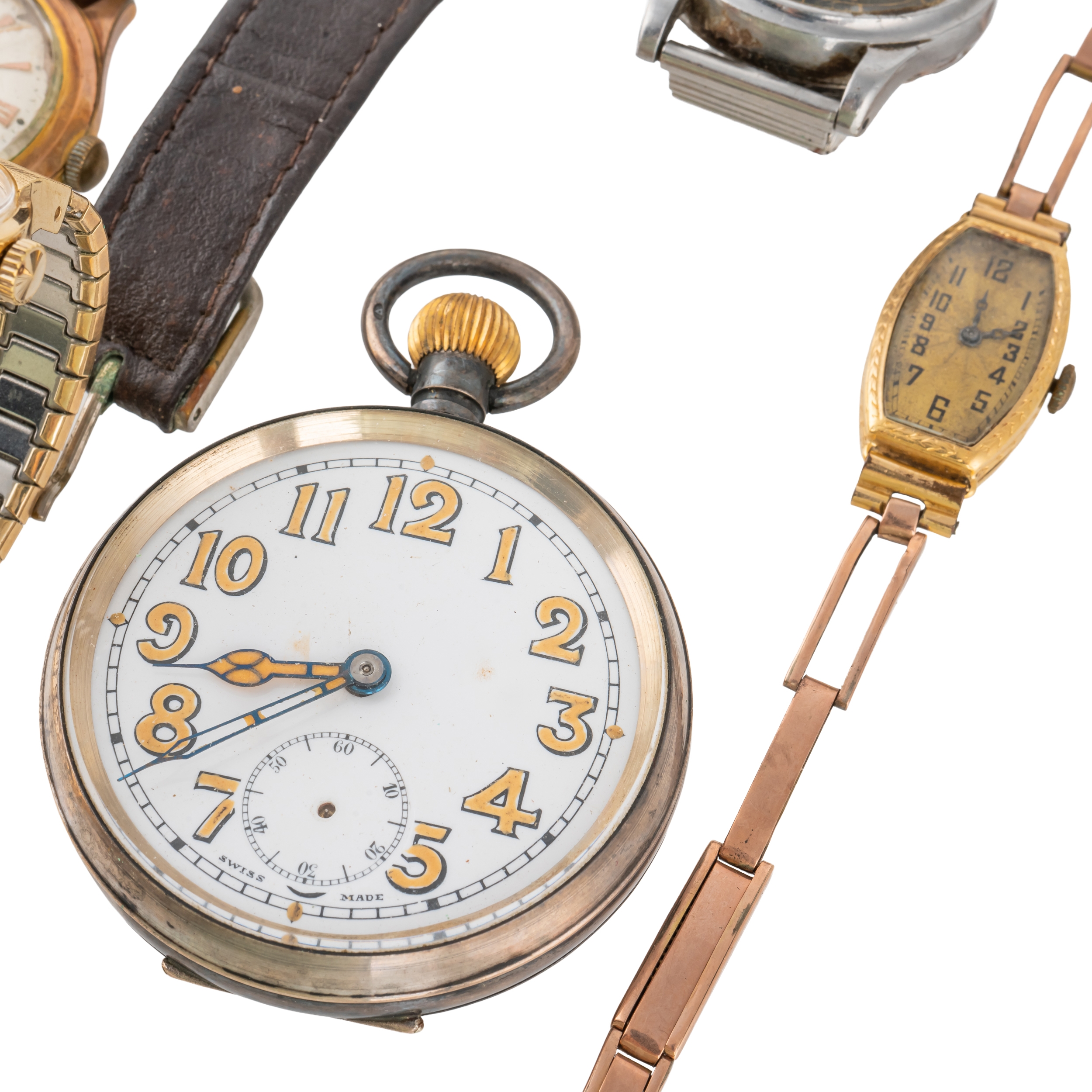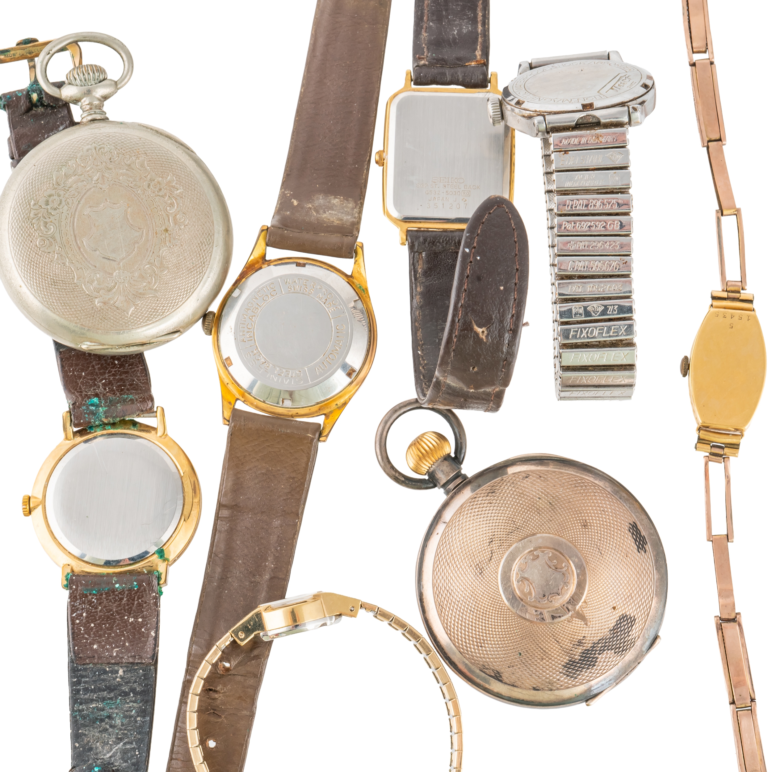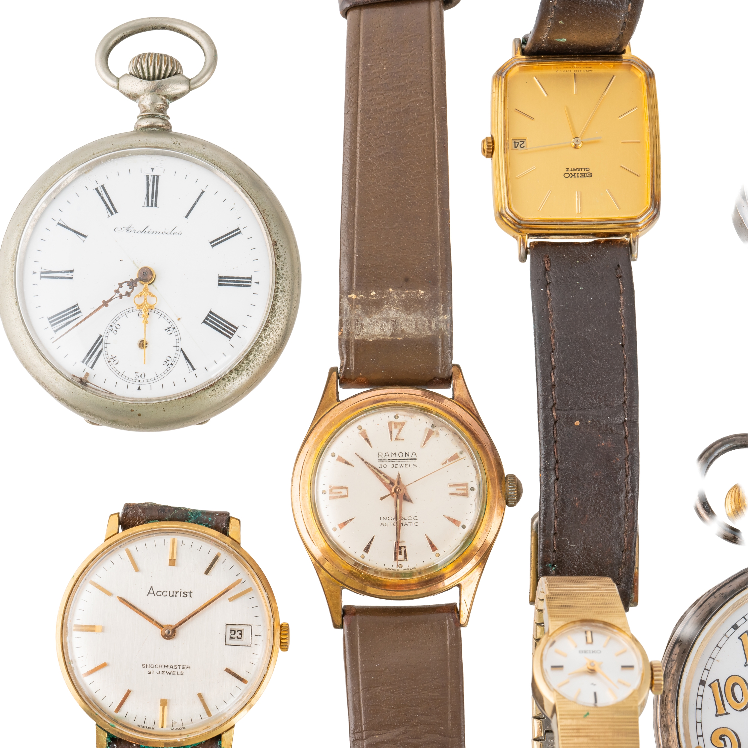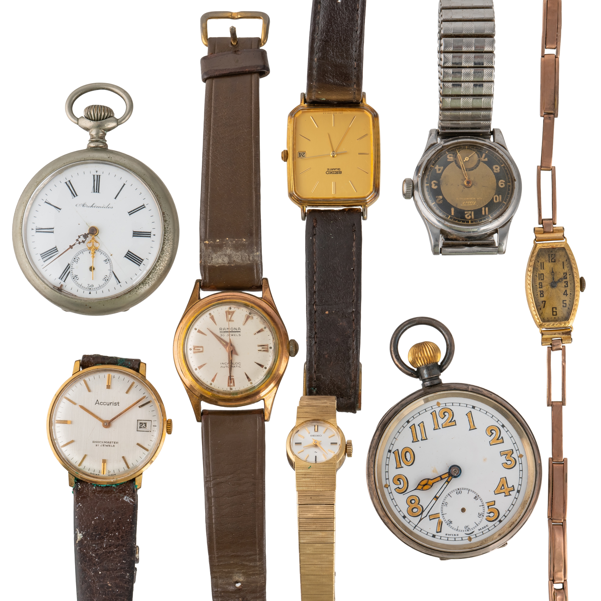 Comprising; an 18ct gold cased lady's bracelet wristwatch, the oval jewelled movement detailed Rolex Prima Timed 6 Positions, the unsigned silvered dial with black Arabic numerals, the R.W.C Ltd case, import mark Glasgow 1924, fitted to an associated sprung bar link bracelet, with a snap clasp, gross weight excluding movement 10.7 grams, four gentlemen's wristwatches, comprising; Ramona Automatic, Accurist, Tissot and Seiko Quartz, a Seiko gilt metal lady's bracelet watch and two pocket watches, comprising; one silver cased, import mark Birmingham 1917, the other base metal, with a cylinder movement, the enamelled dial detailed Archimiedes