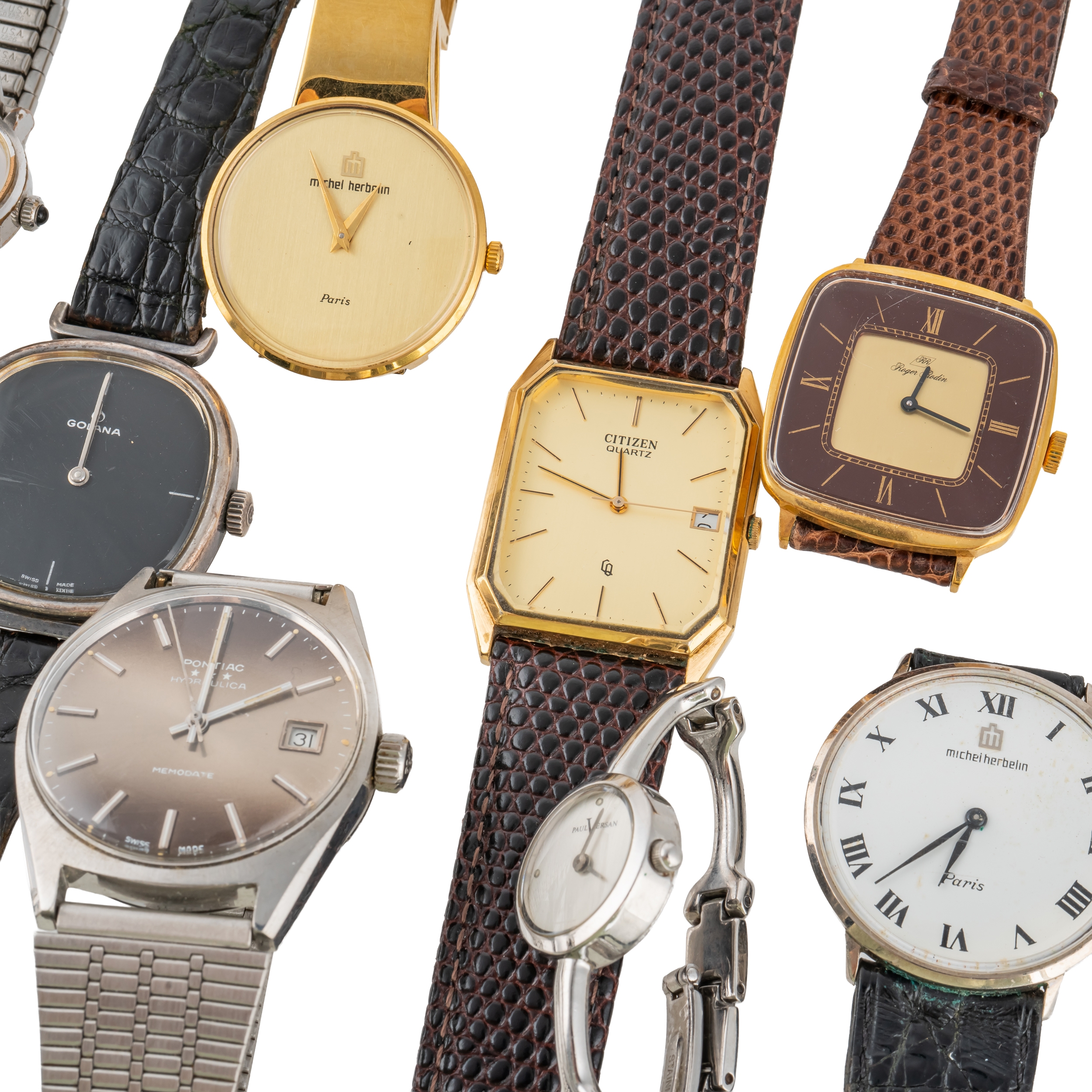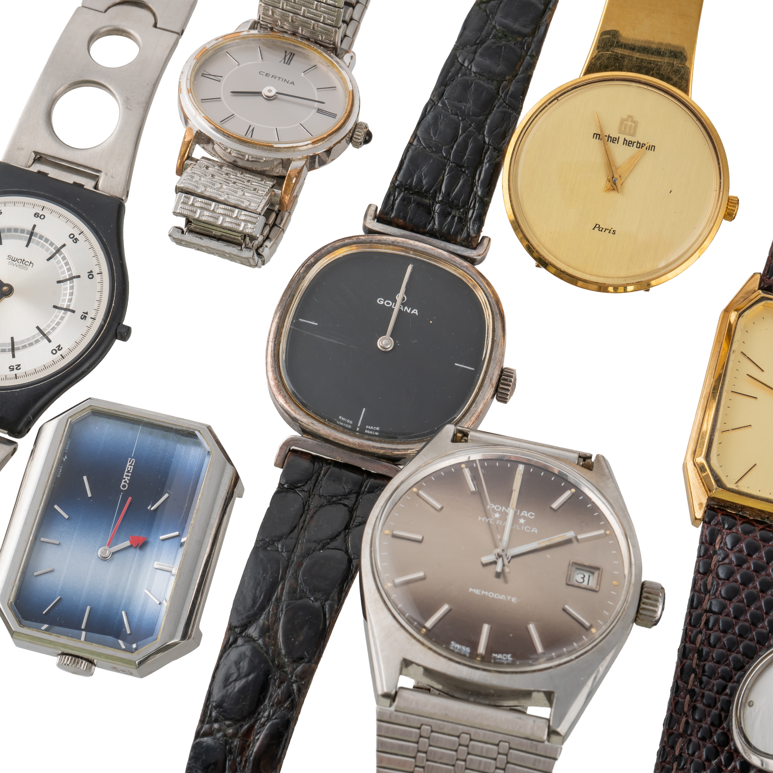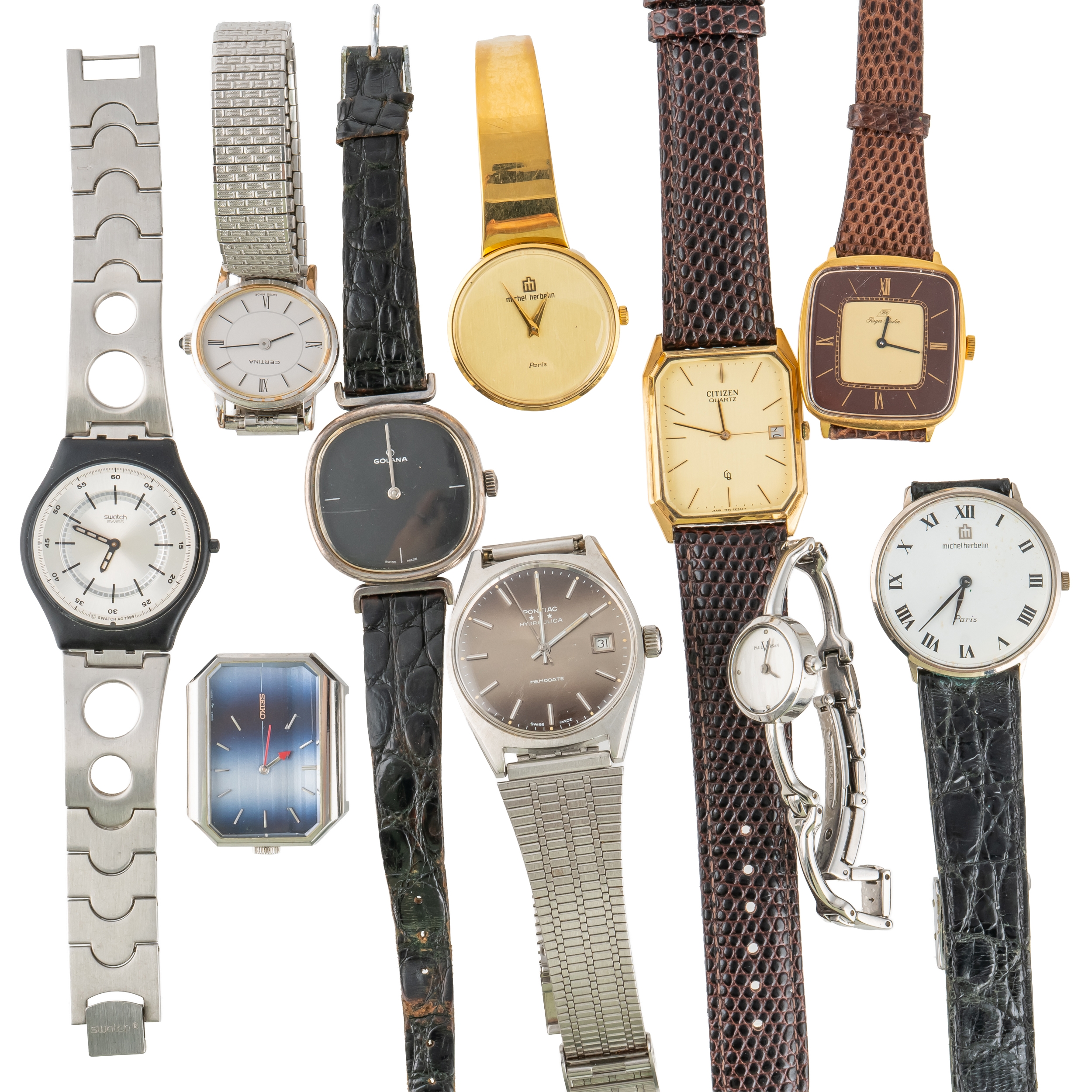 The Golana having a black dial fitted to a black leather strap, the further wristwatches, including; Michel Herbelin, Citizen Quartz, Certina and Swatch