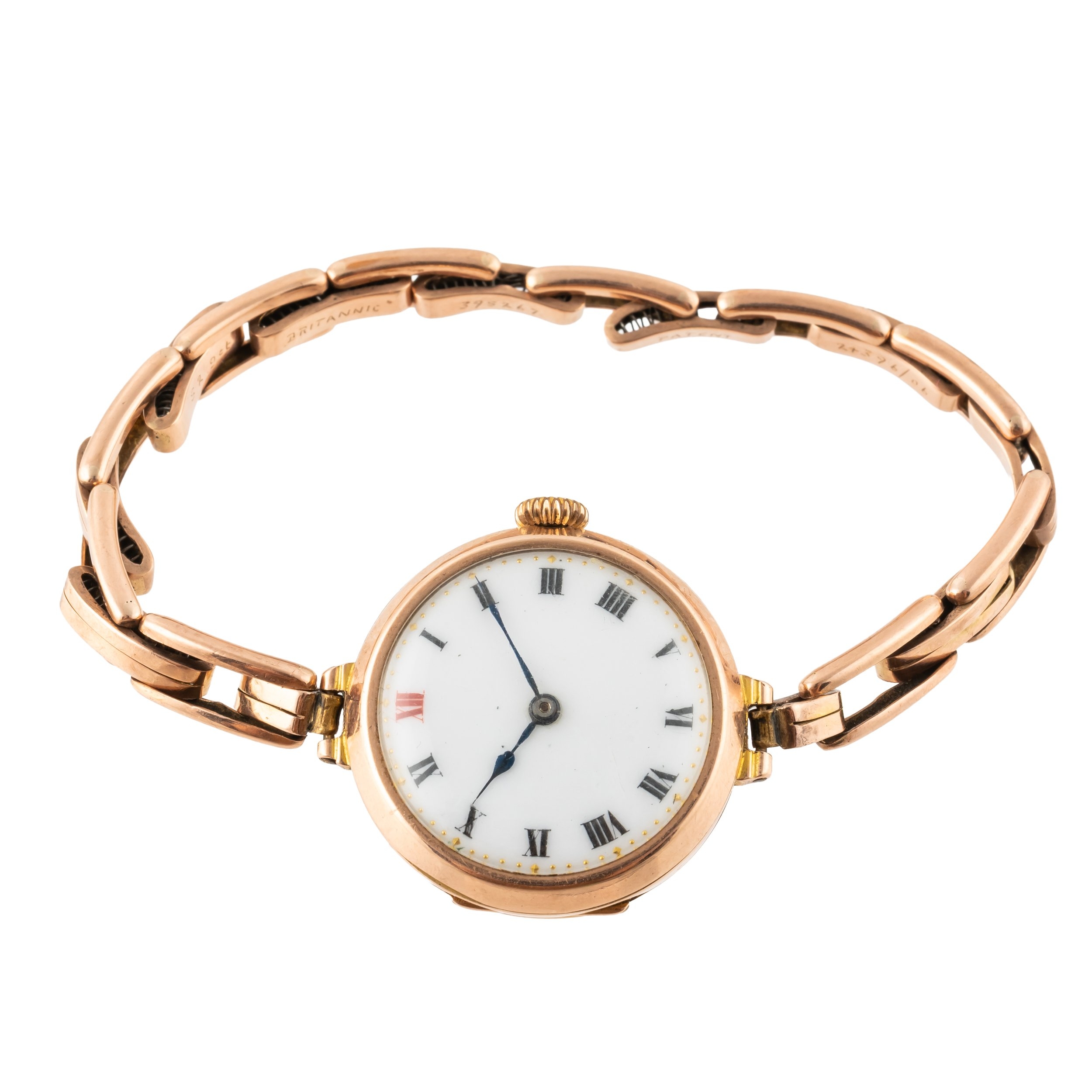Featuring a Swiss-made hand-wound movement in a yellow metal case stamped '375' and measuring 26mm with a white enamel dial on an integrated 9ct gold expandable bracelet. Total weight of item: 22.5 grams