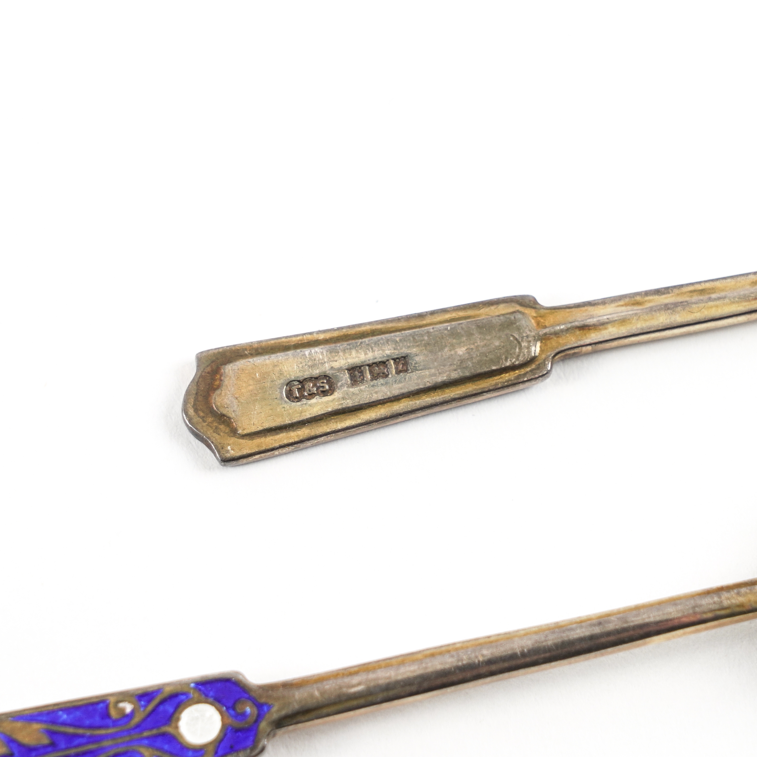 Decorated with blue and white enamels and with traces of gilding, Birmingham 1960, combined gross weight 66 grams, with an associated case