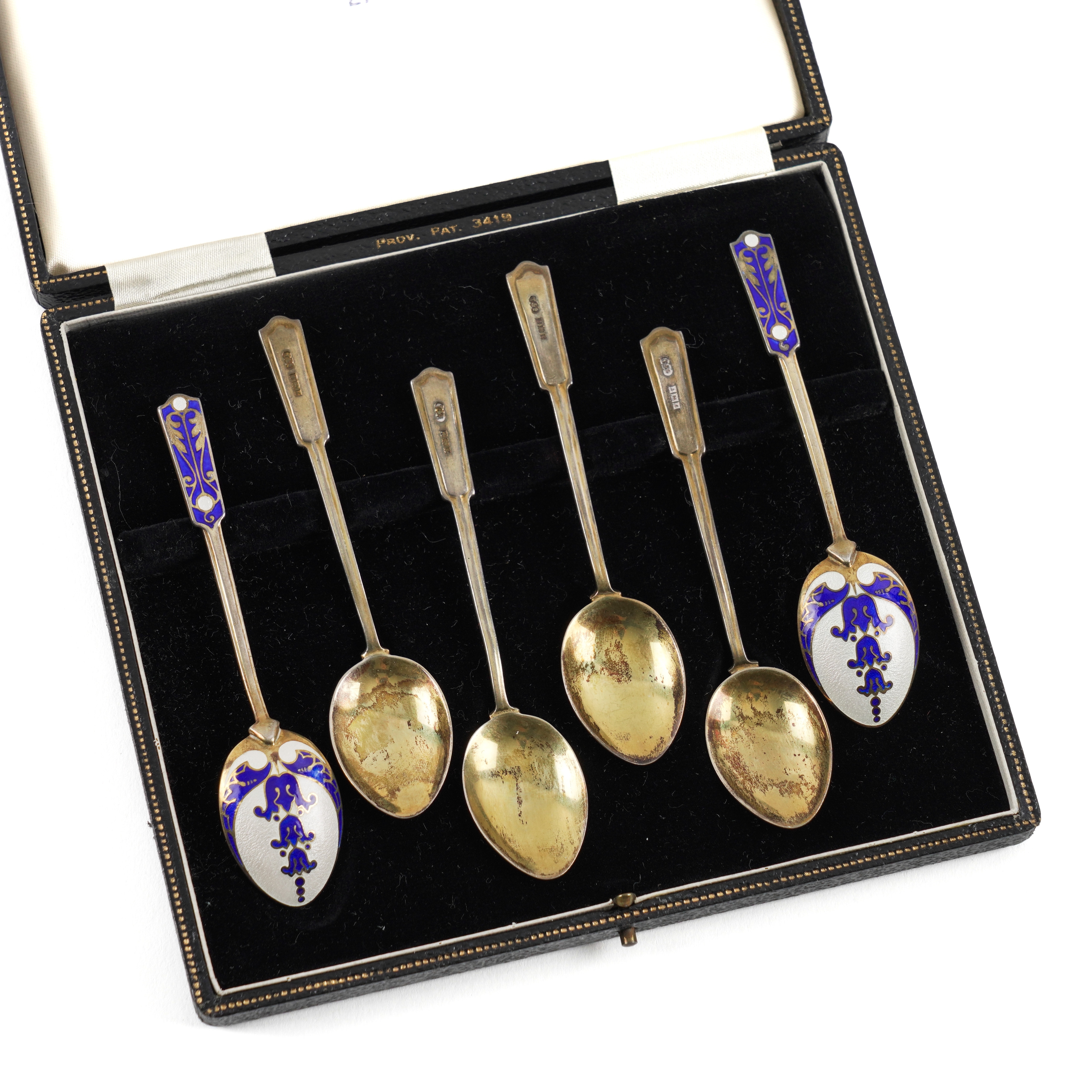 The gilding is a little worn and tarnished in places, there is damage to the enamel of the backs of two of the spoons, one handle stem is a little bent, the spoons are generally of a very basic quality, note that the case is associated. Hallmarks are good.