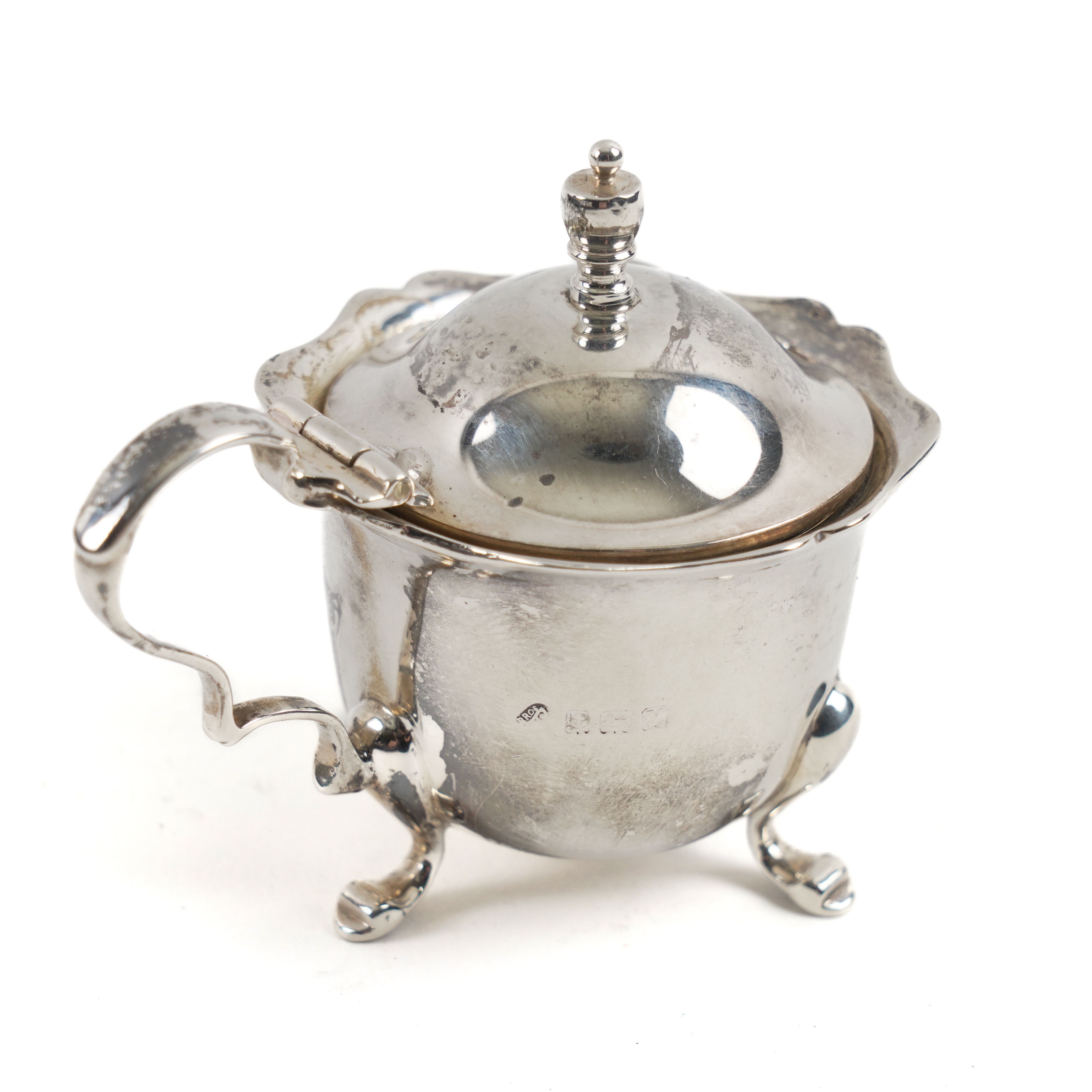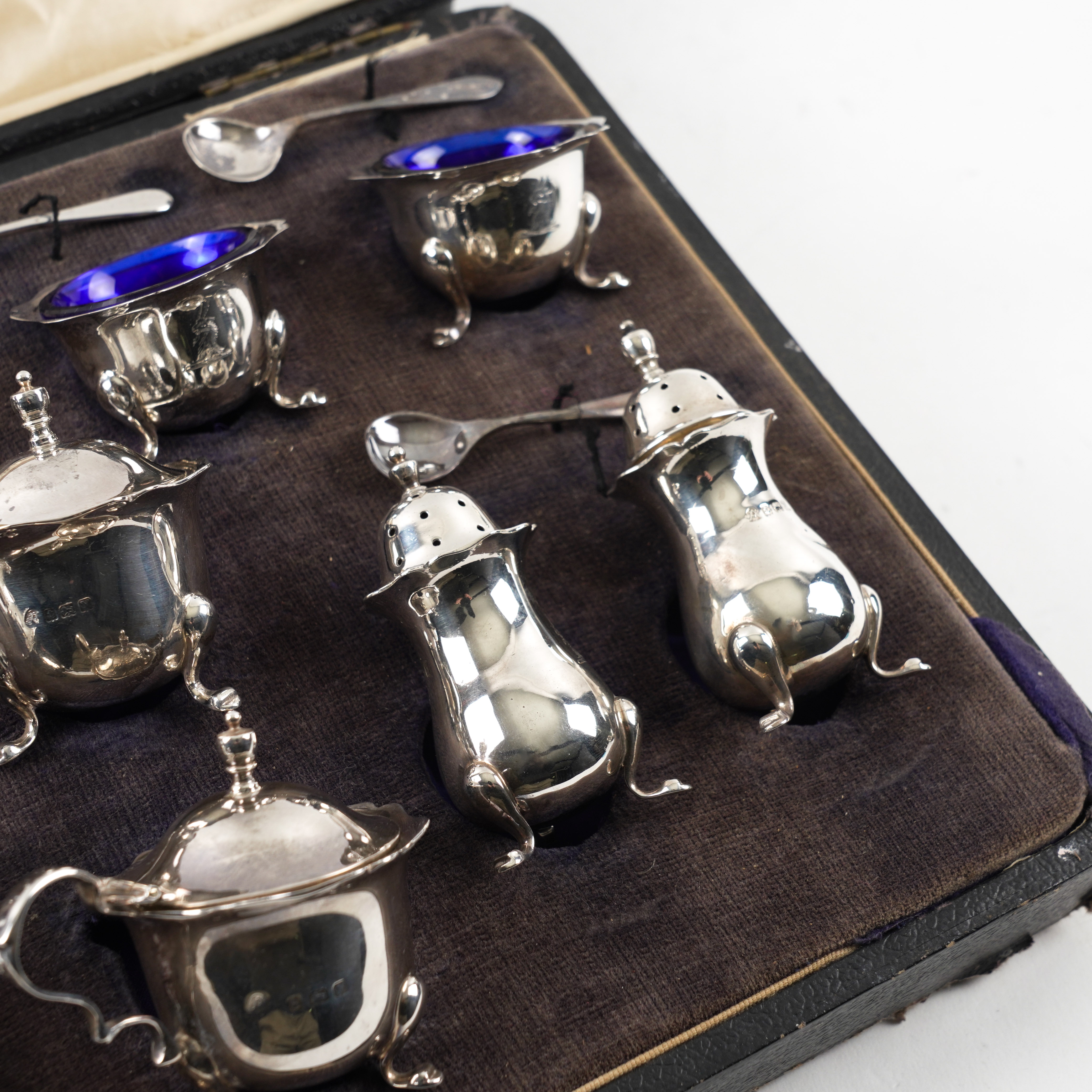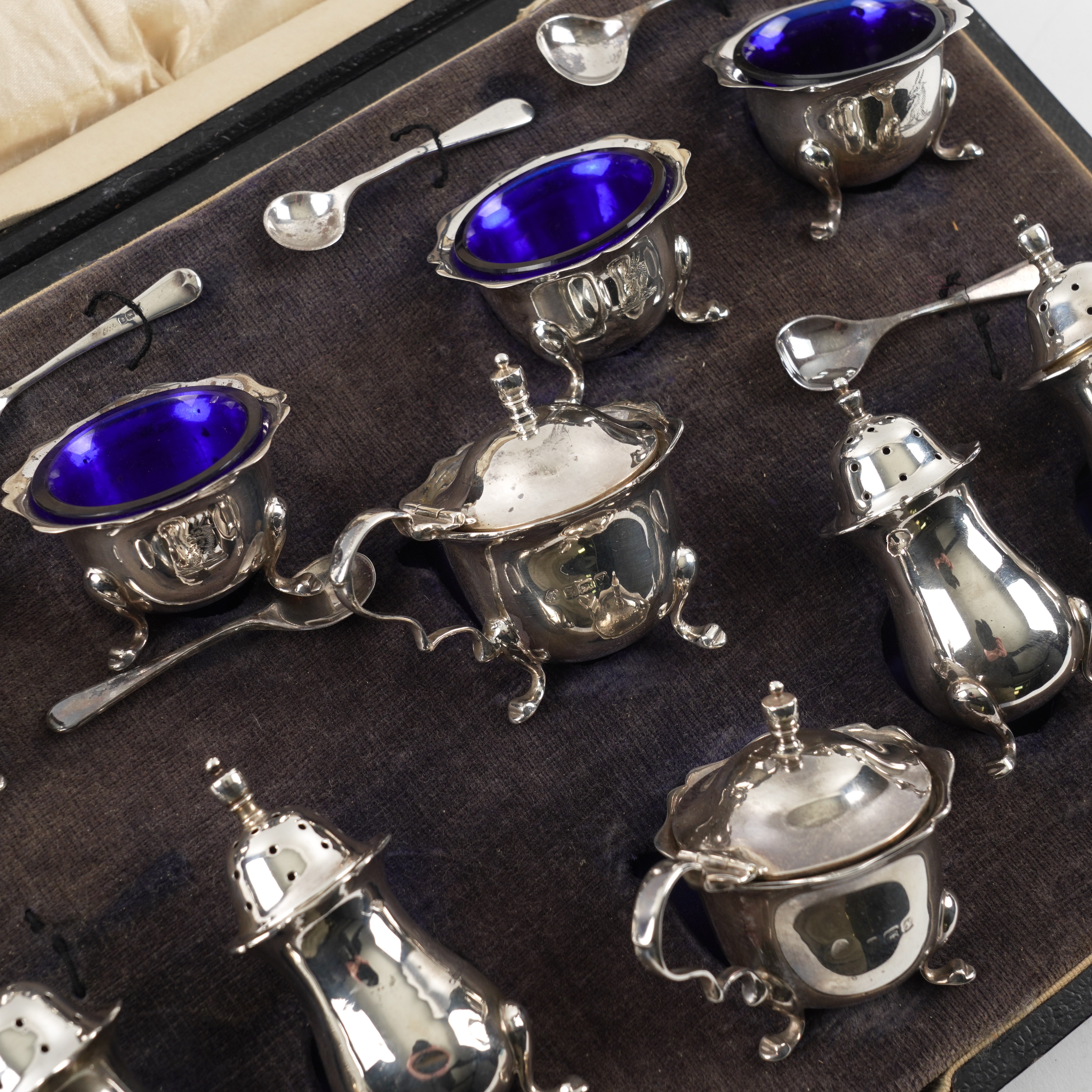 Comprising; four salts, four pepperettes, two mustard pots, all crest engraved and three salt spoons, all Birmingham 1923, a mustard spoon, Birmingham 1925, a salt spoon Birmingham 1925 and a salt spoon, Sheffield 1946, combined weight 316 grams, with six blue glass liners, with a damaged case