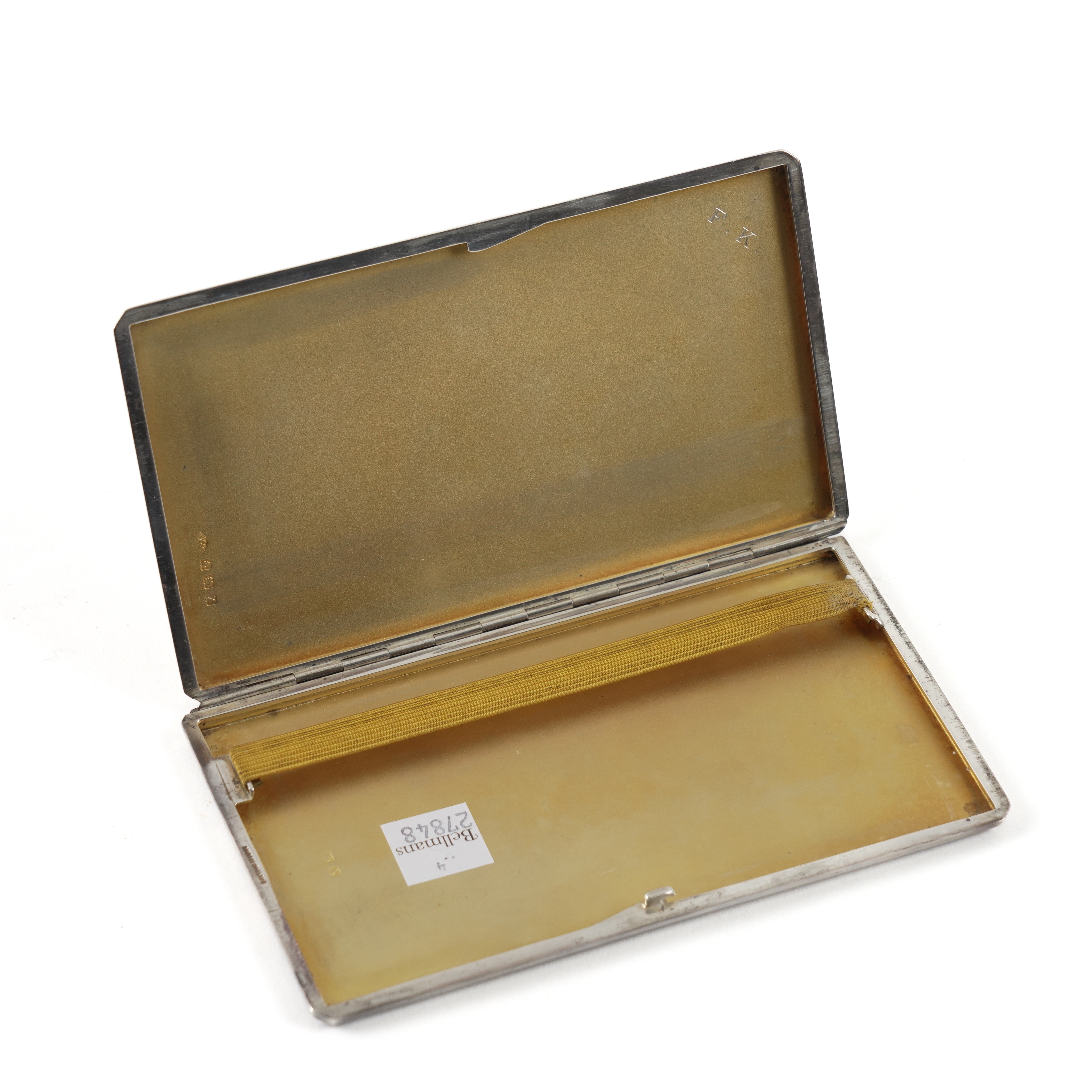 Size of case 14.6cm x 8.4cm x depth 0.8cm. Slide action opening method, engraved with the initials F.K. within, otherwise in good condition