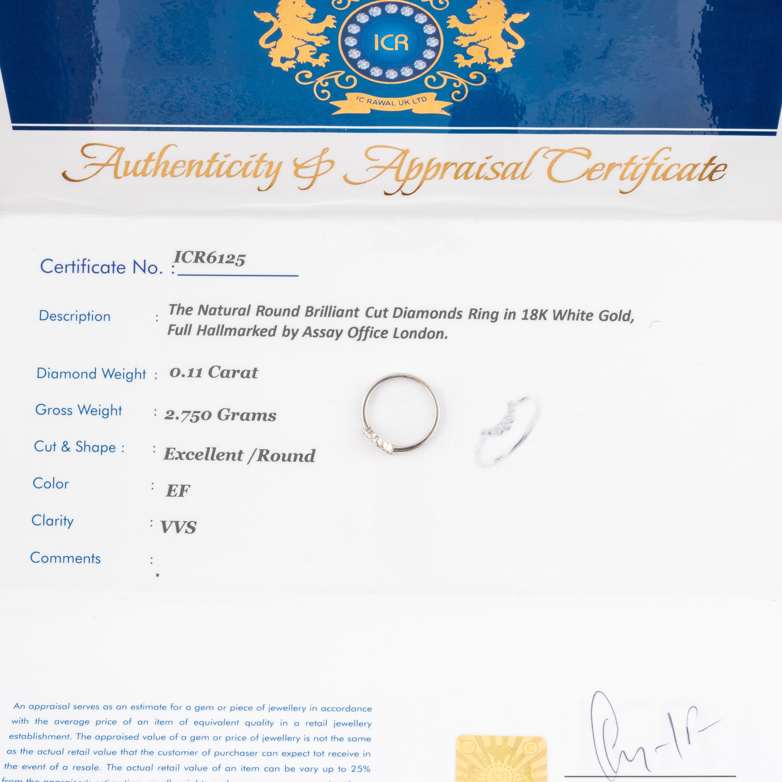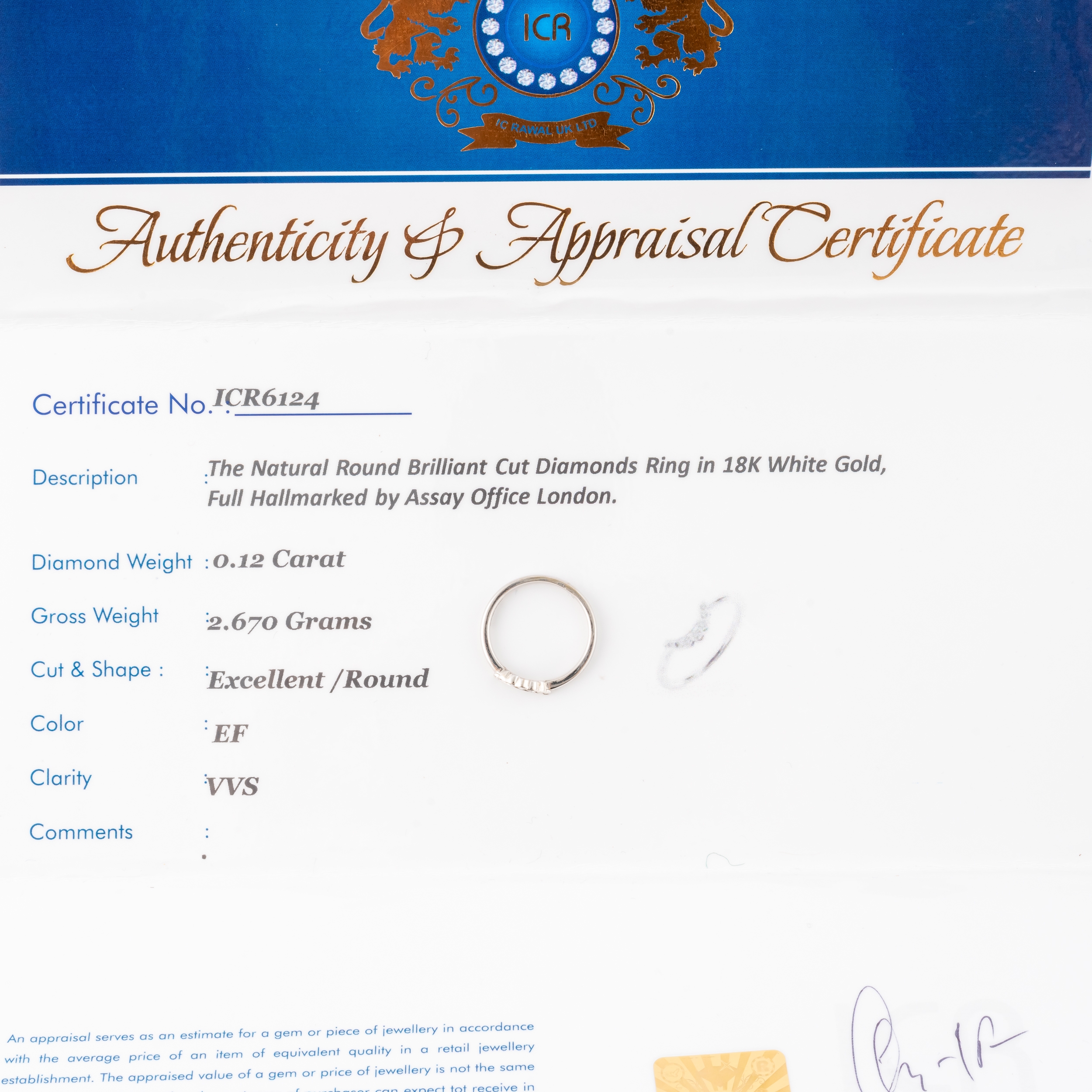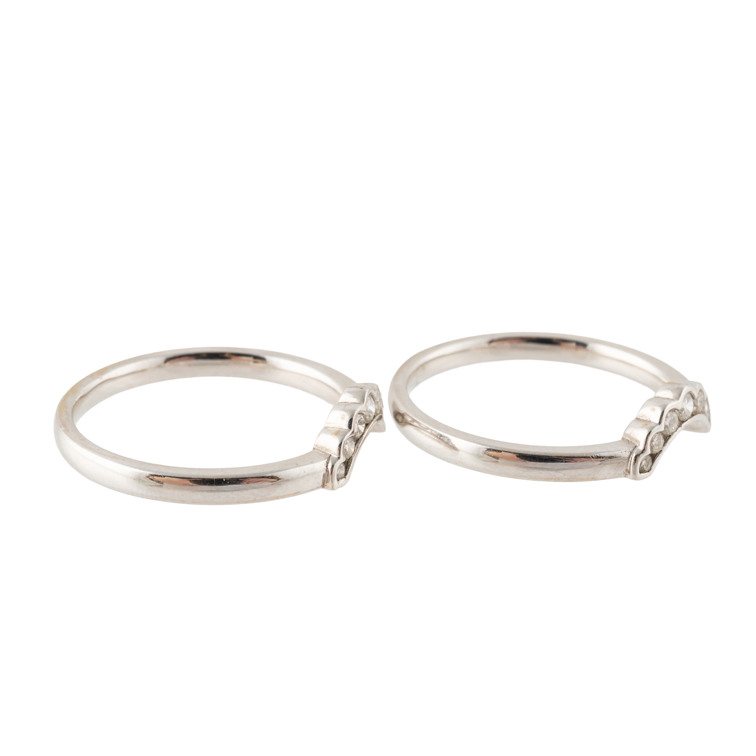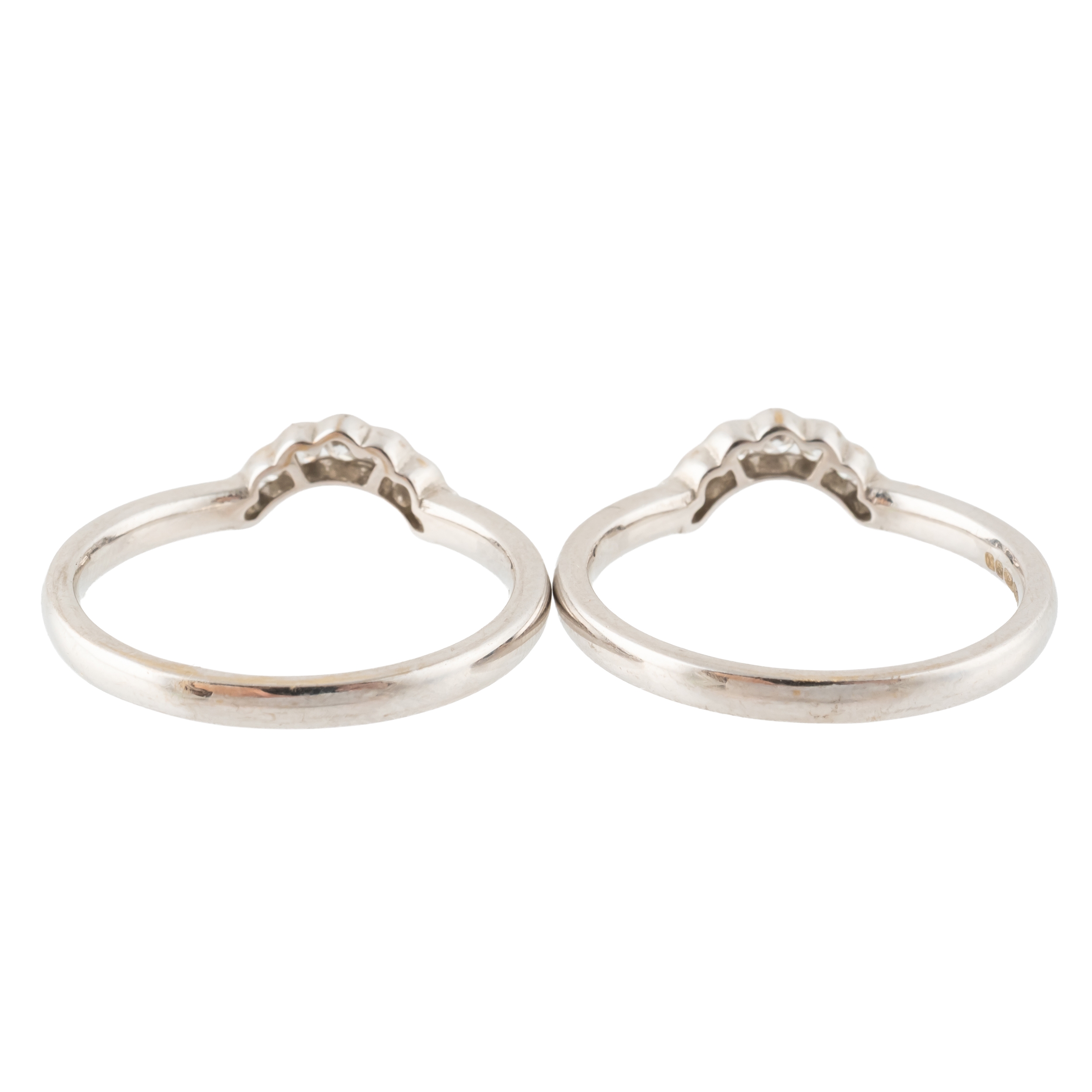 Each in a curved design mounted with round brilliant cut diamonds, in 18ct white gold, both size O, gross weight 5.4 grams with two ICR certificates