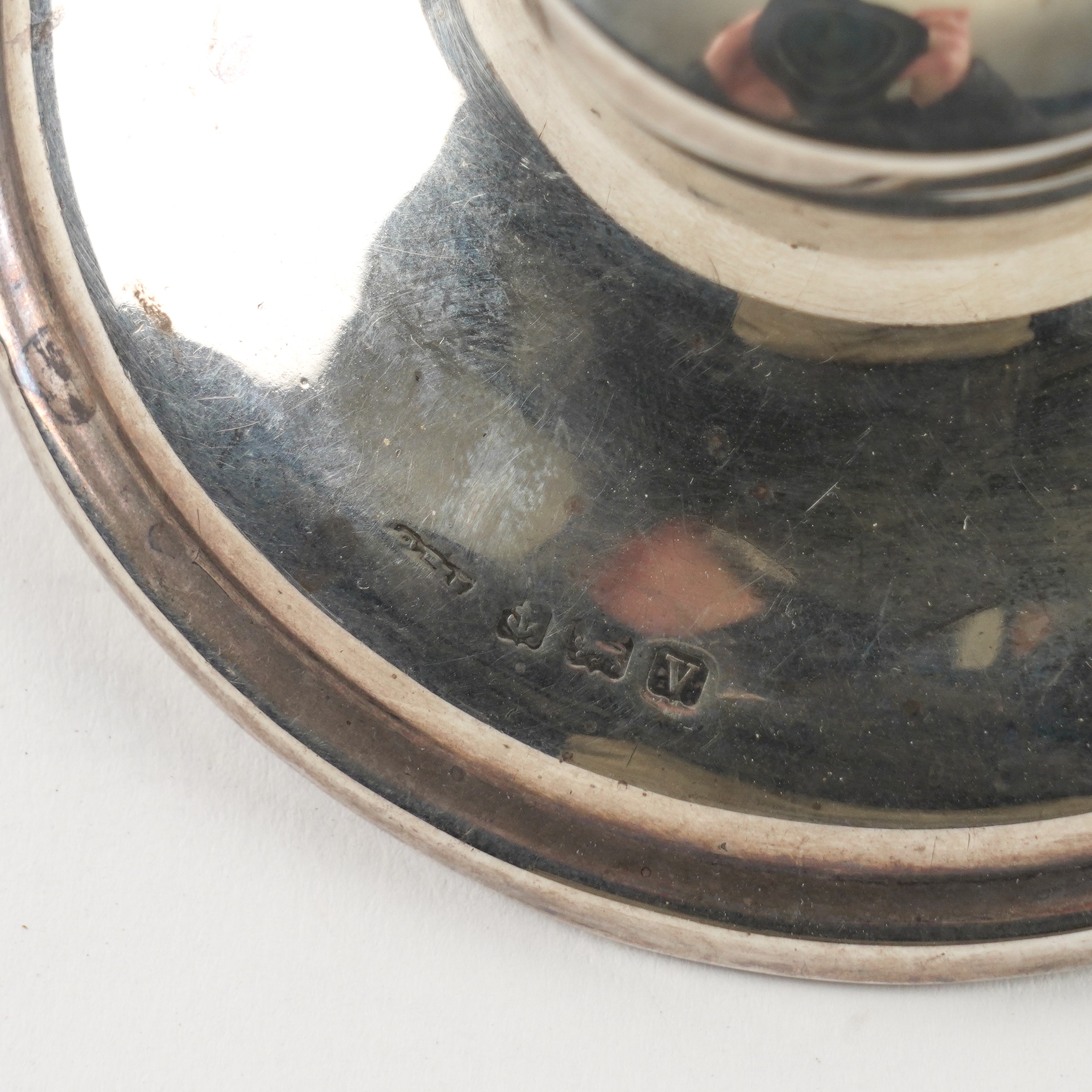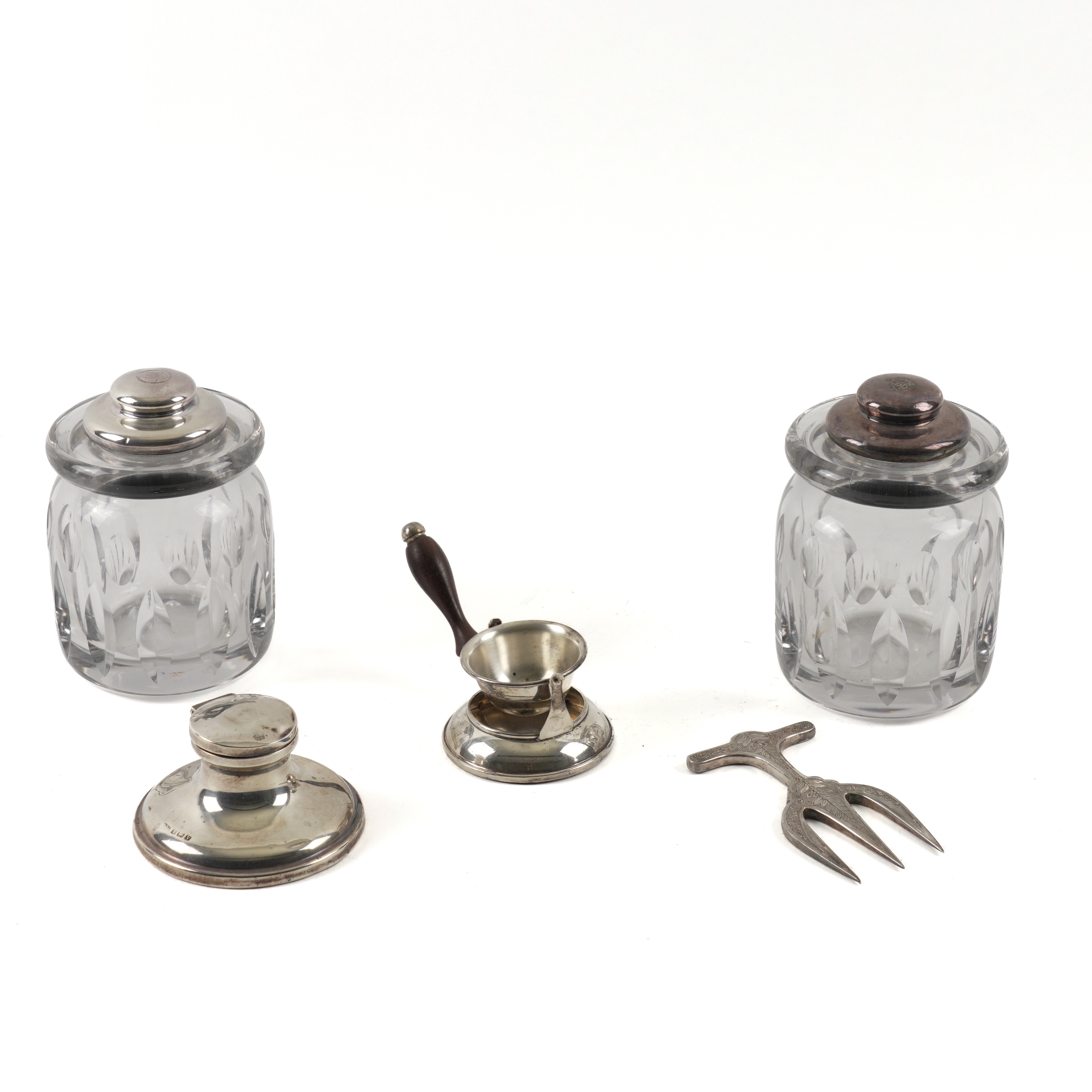 Each jar having a leather lined pull-off stopper, unmarked, sample height 13cm, also a silver mounted capstan shaped inkstand, Birmingham 1920, diameter 8.6cm, a plated bread fork with engraved decoration and a Sterling tea strainer with an integral stand, with a turned wooden handle
