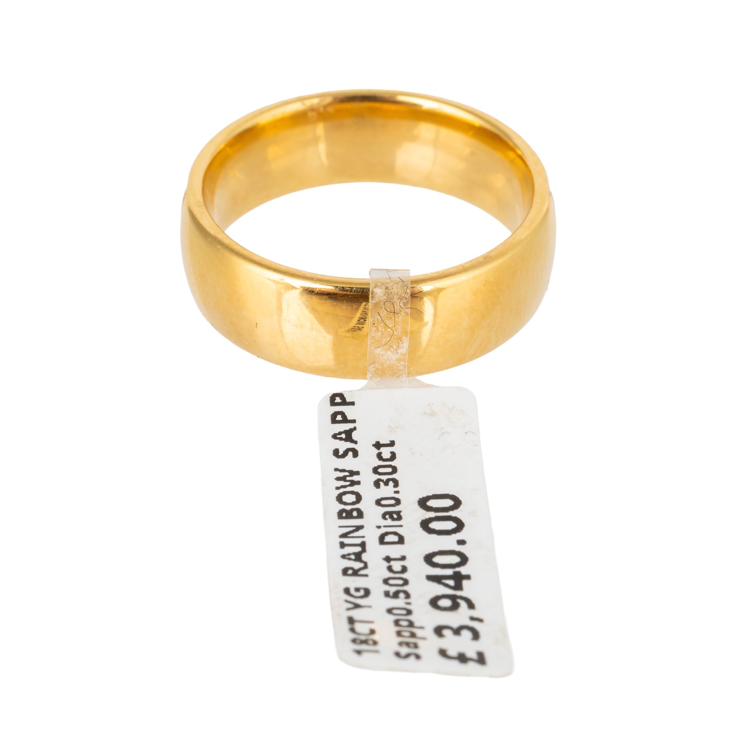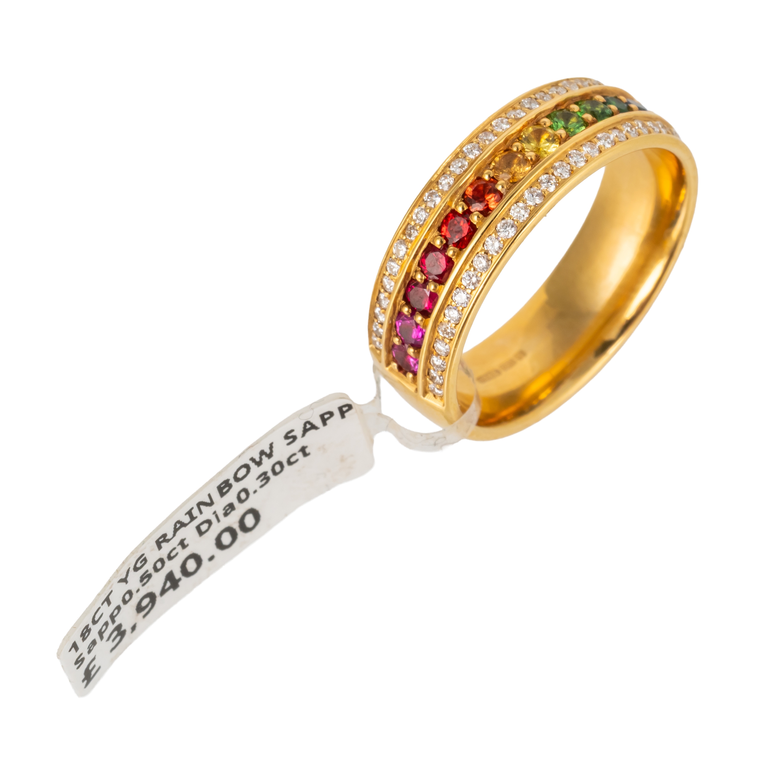 Mounted with a central row of rainbow sapphires, and bordered each side by a row of diamonds, in 18ct yellow gold, size L, gross weight 6.4 grams